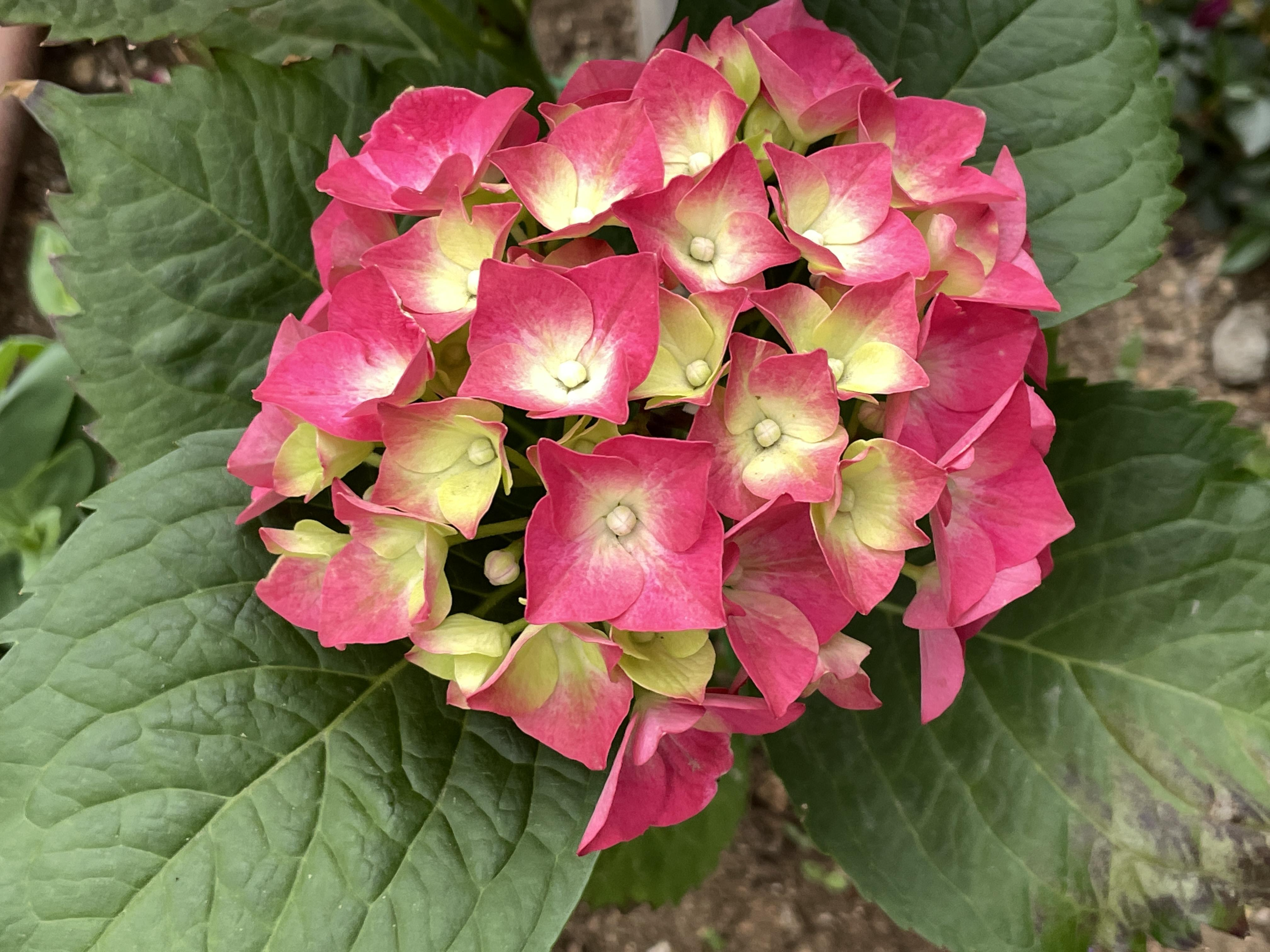 반면에 수국은 잎이 타원형으로 둥글게 생겼고 잎가장자리가 톱니같이 생겼습니다. 꽃은 중성화( 암술과 수술이 모두 퇴화하여 없는 꽃)로 6~7월에 꽃이 핍니다.