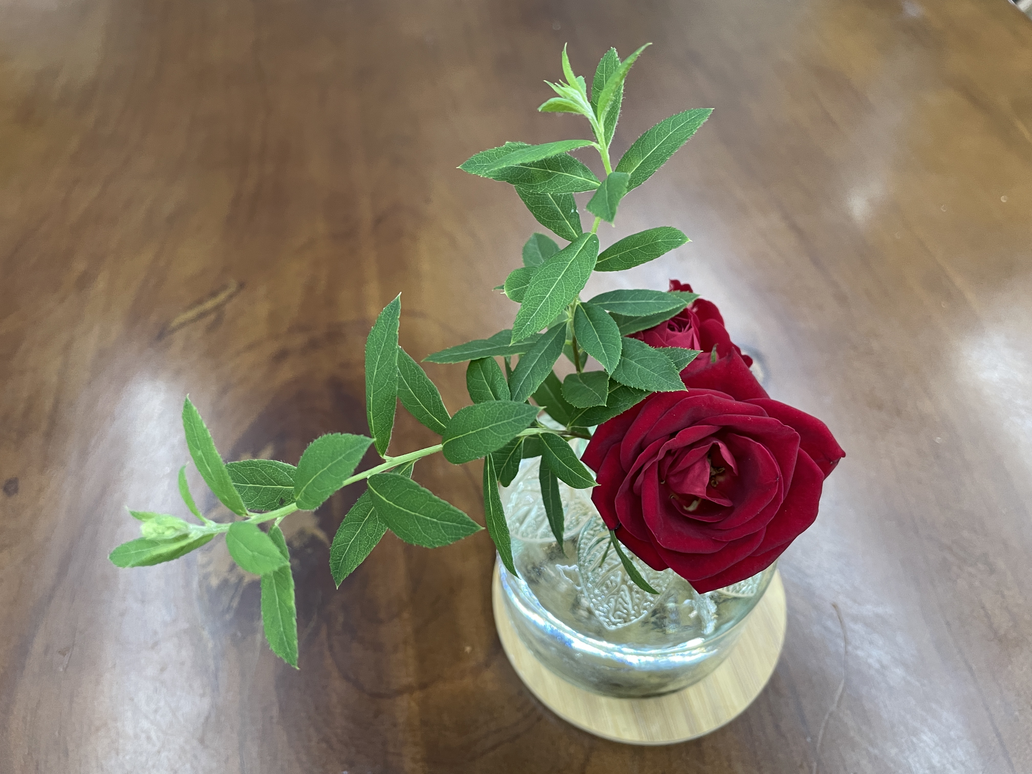 유리로 된 주스병을 이용해서 초록잎과 빨간 장미를 꽂았는데요. 작지만 테이블의 주인 같은 느낌과 유리병에 담긴 물이 시원함을 더해주는 것 같다 좋아 보입니다.