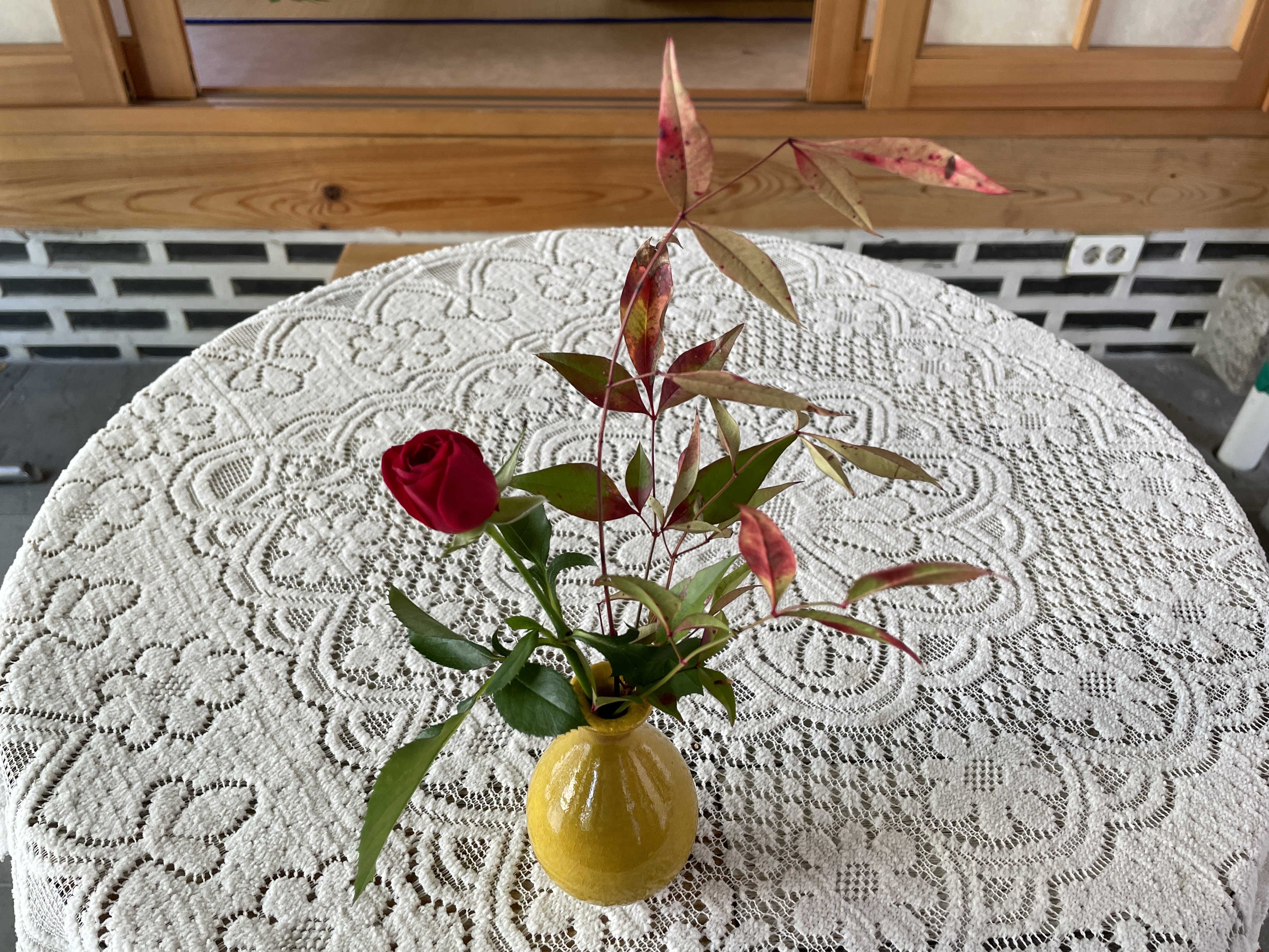 남천과 장미는 호리병에 어울리게 한국식 꽃꽂이가 되어 한옥과 잘 어울립니다.