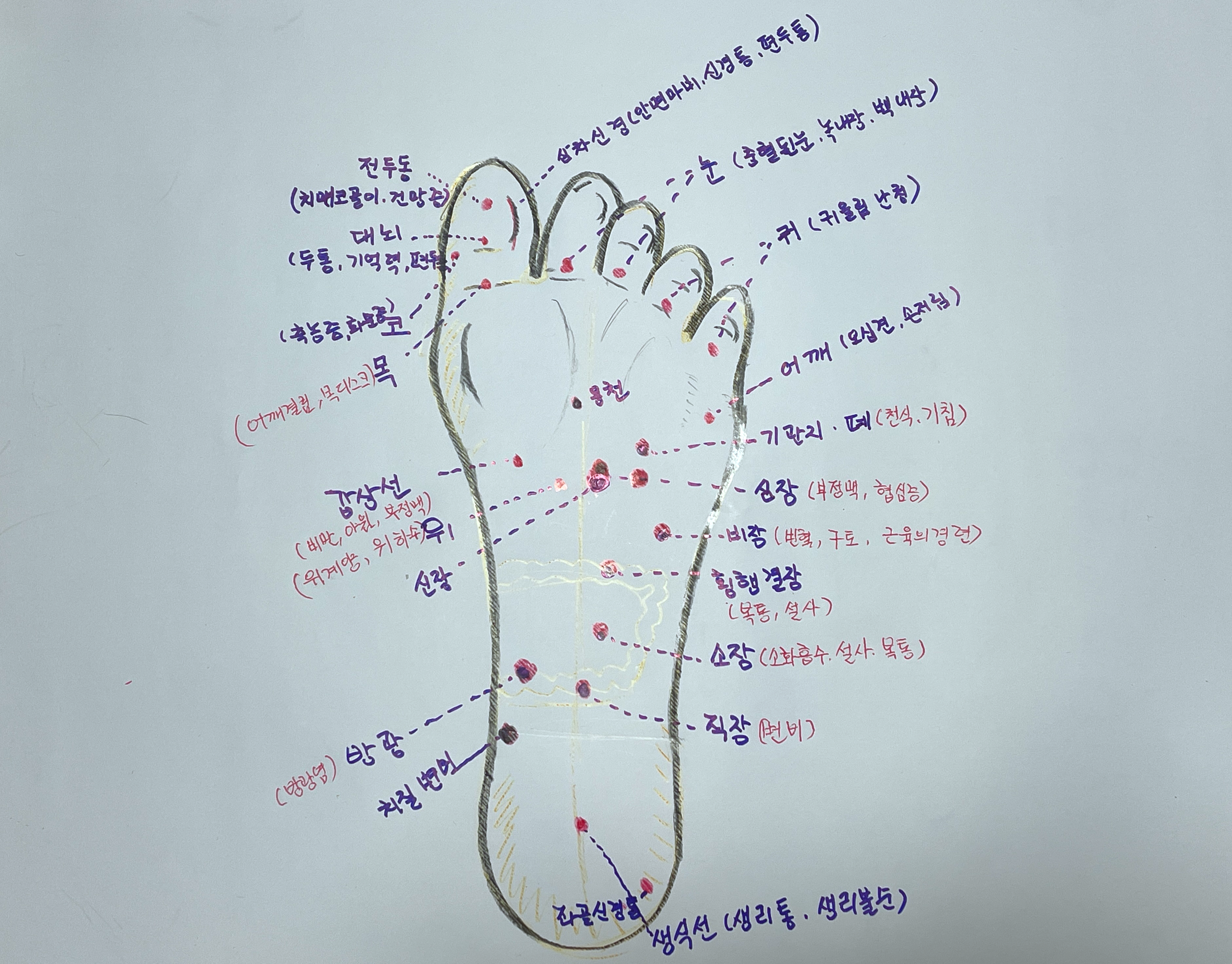 오늘은 발바닥의 혈의 위치를 공부했습니다. 왜냐하면 요즘 눈을 너무 혹사했는지 어느 날 책을 보려는데 왼쪽눈에 엄지손톱만 한 물체가 쑥 지나가는 거예요. 눈에 이상이 있다는 생각에 책을 덮고 잤는데, 눈이 많이 불편해서 안과에 갔더니 눈동자에 염증이 있다 해서 치료를 해도 눈꺼풀이 누르는 것 같다고 했더니 시신경에 이상이 있는 것 같다고 하시며 1주일 기다려 보고 검사를 해보자고 하셨는데, 시신경을 인터넷을 찾아보고 눈 주변을 만져봤는데 너무 아프게 뭉쳐있는 것을 느꼈어요. 이번에 맨발 걷기를 하는 것은 눈을 치료하기 위해서 걷는데요. 눈의 위치가 발바닥이나 발가락 디디는 곳이 아니라 움푹 들어간 곳이어서 더 신경을 써서 걸어야 한다는 것을 알았어요.