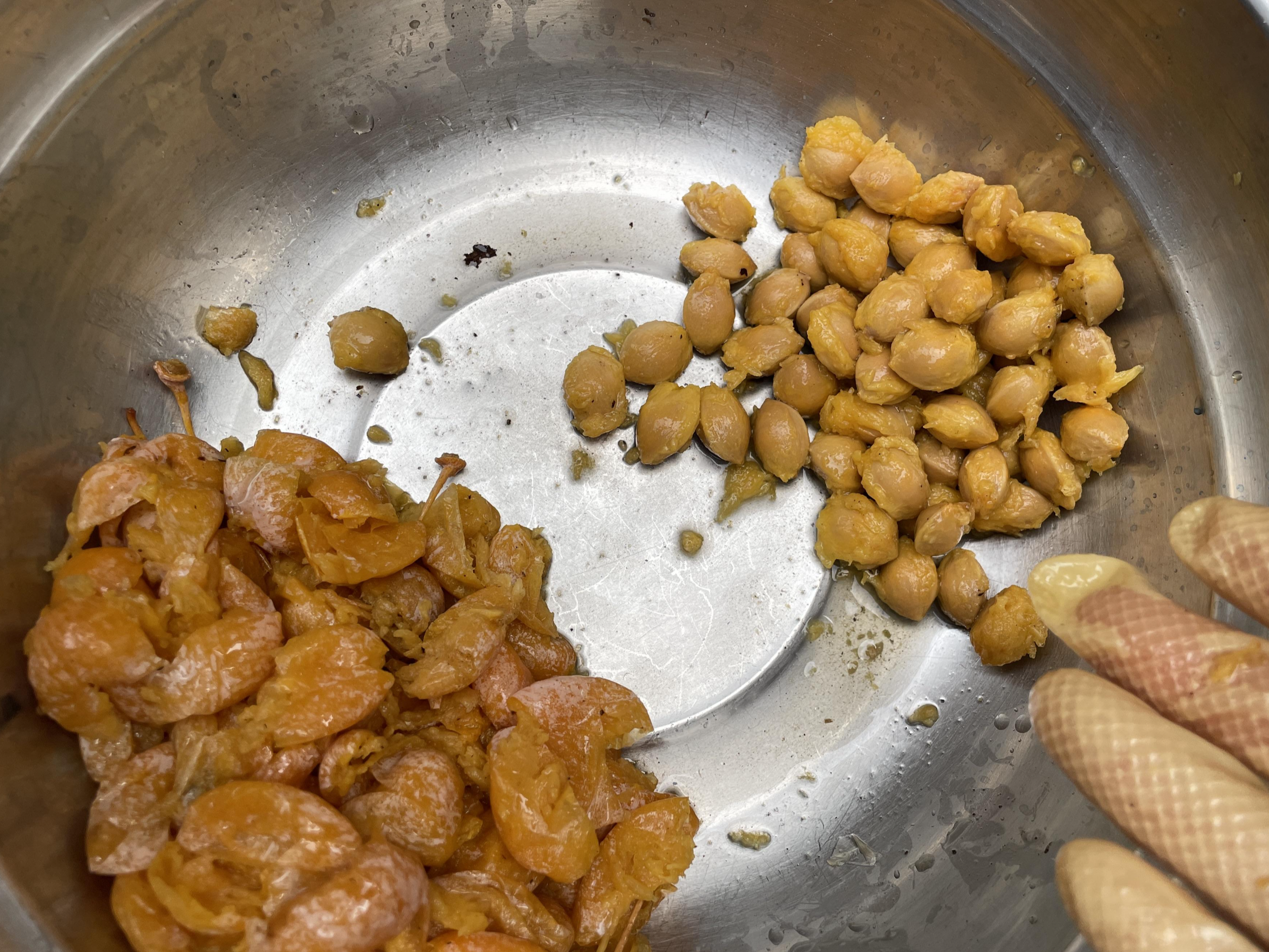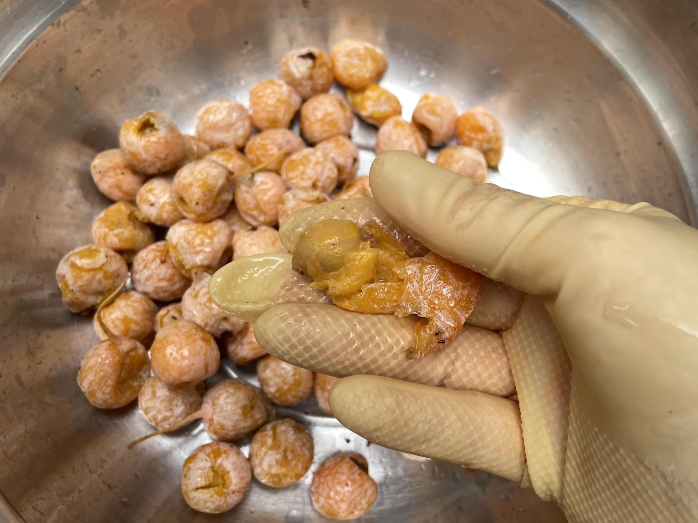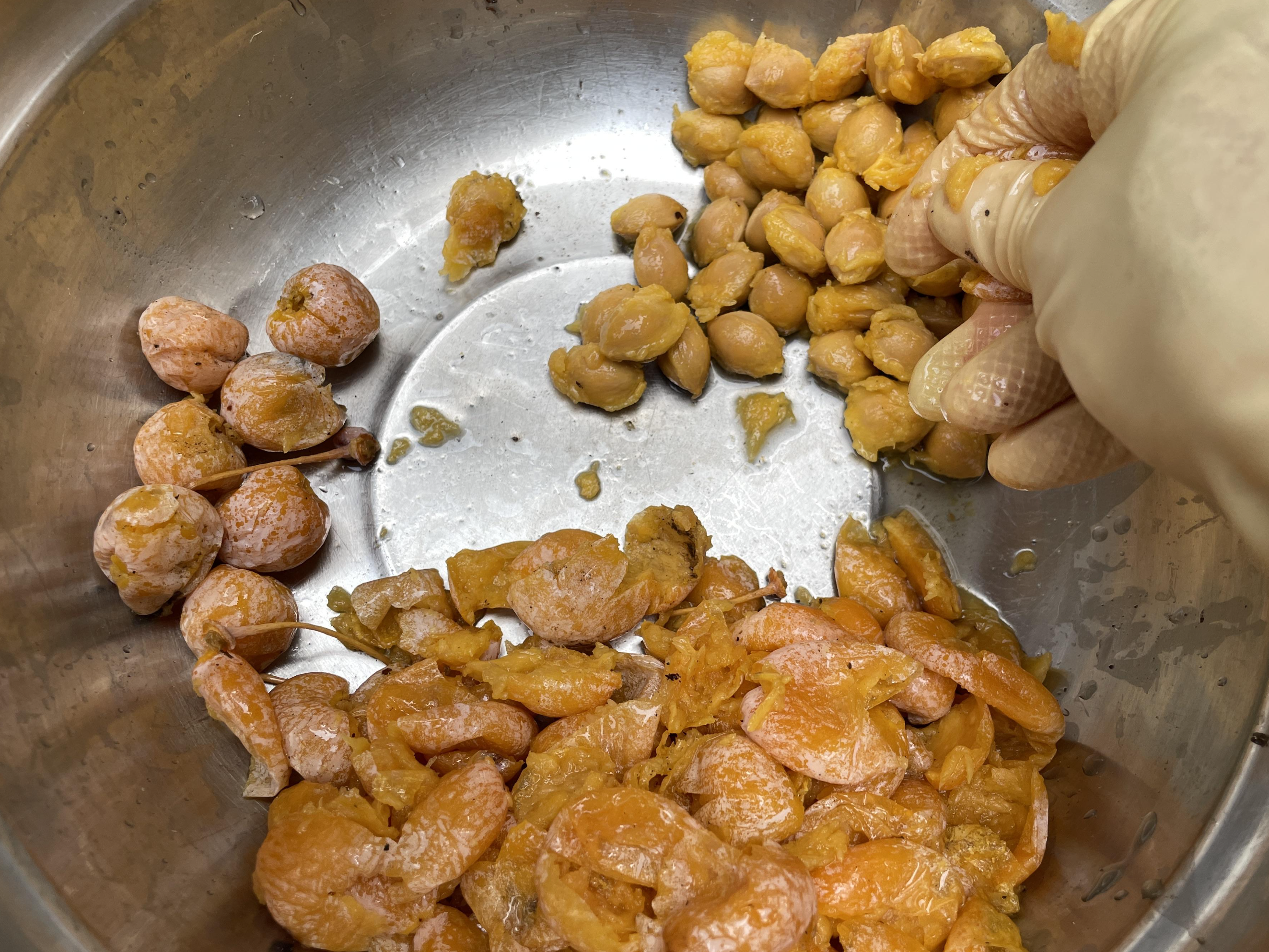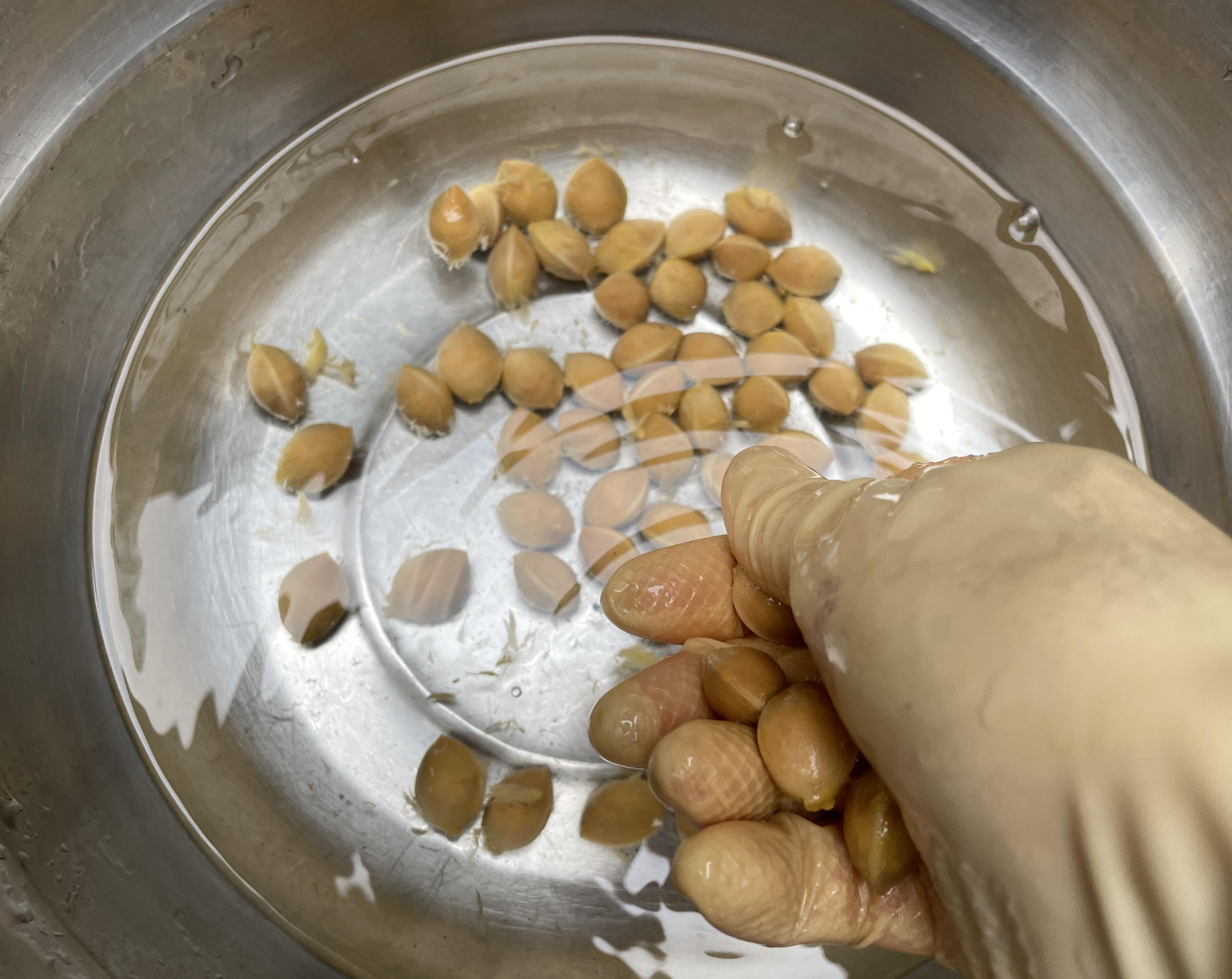 2. 은행껍질이 냄새가 많이 나서 장갑을 끼고 은행껍질을 엄지와 검지로 누르면 껍질이 쉽게 벗겨집니다.