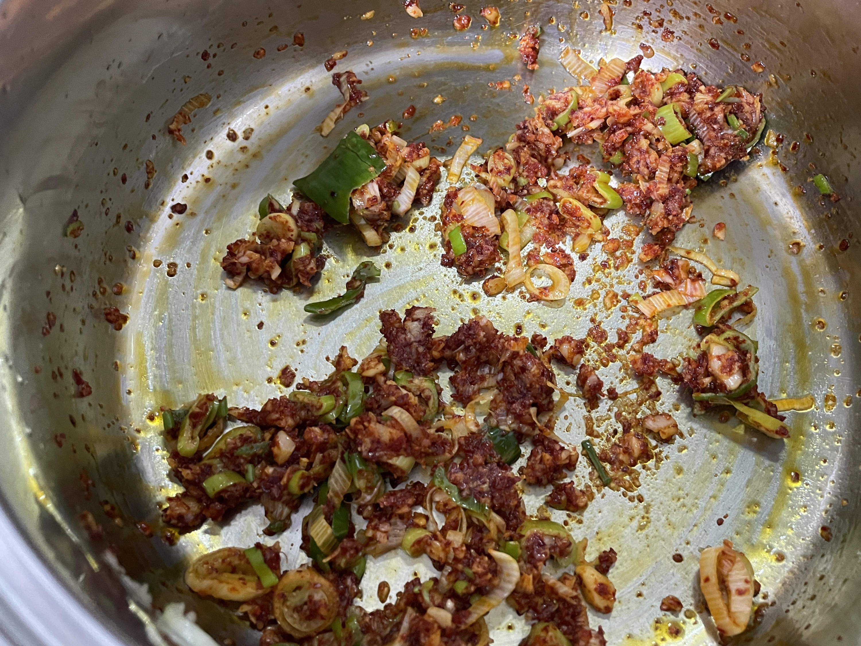 ※ 마늘이 맛있게 볶아진 다음에 파를 넣고 볶는 것이 더 고소한 맛이 납니다. 마늘이 설 익으면 마늘냄새가 많이 나서 싫어하게 되는데요. 그래서 저는 마늘이 노릇하게 볶아지면 파를 넣고 볶다가 파향이 우러나면 고춧가루를 넣고 고추기름이 만들어진 다음에 재료들을 볶습니다.