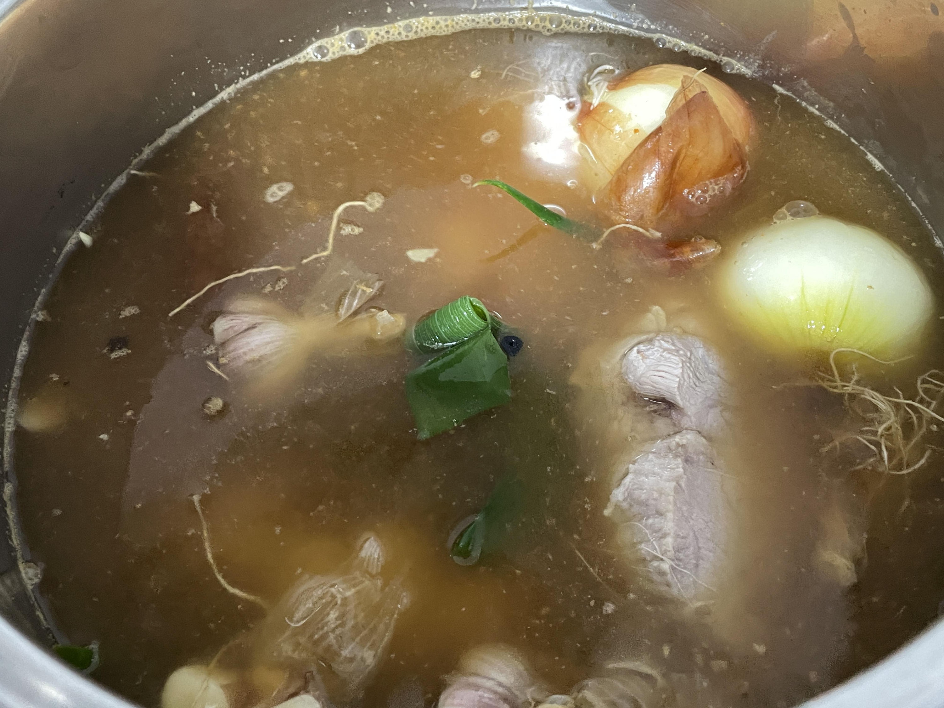 1. 냄비에 양파 1개 , 마늘 1통, 생강 2편, 대파뿌리 말린 것 5개, 대파 억센 잎 한 줌, 통후추 10~15알에 고기를 넣었을 때 잠길만큼의 물을 넣고 중불에서 끓어줍니다.