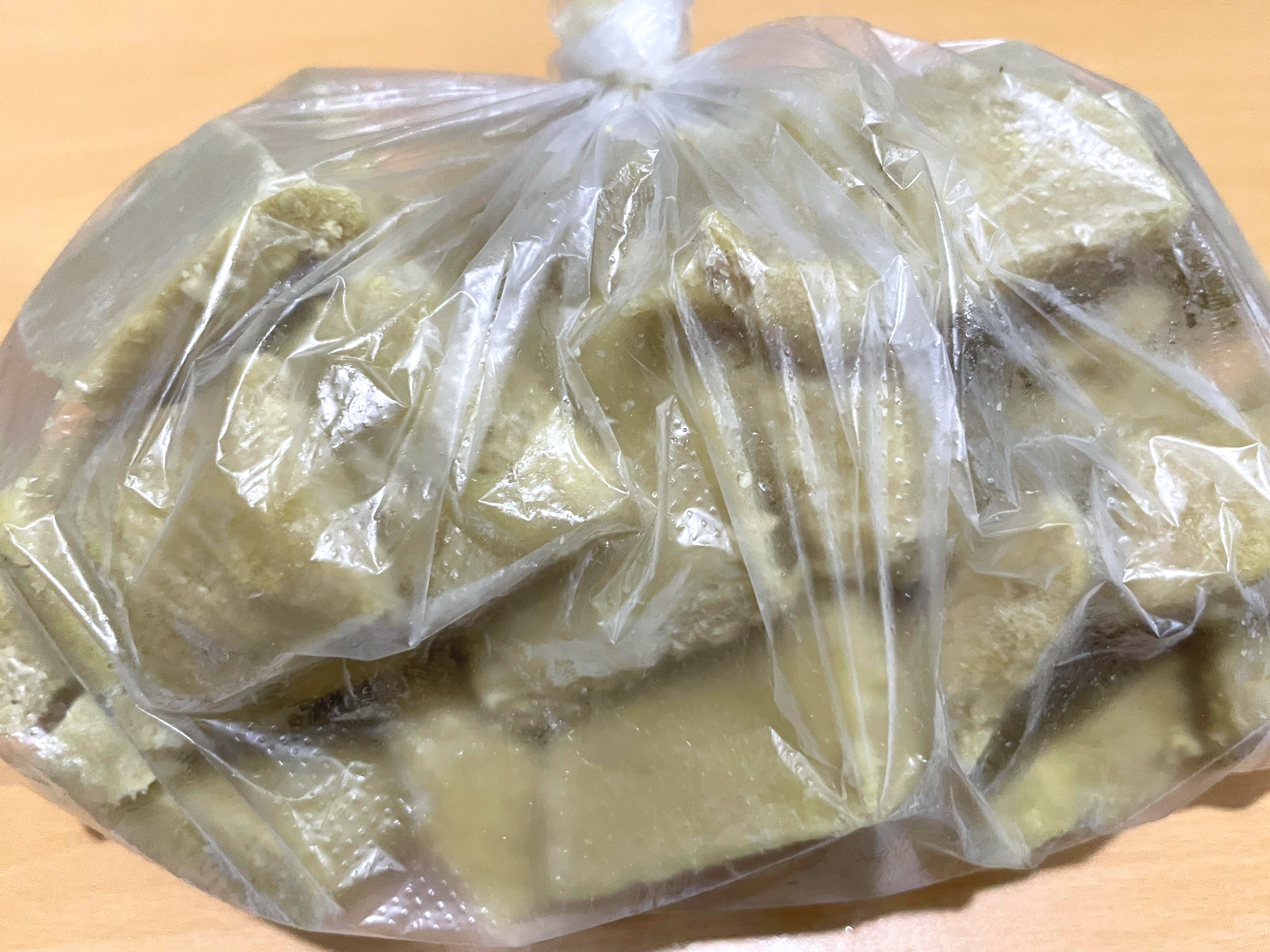 2. 하룻밤 얼린 것을 칼집 낸 대로 잘라서 비닐봉지에 넣은 다음 지퍼팩에 넣어 냉동 보관합니다.