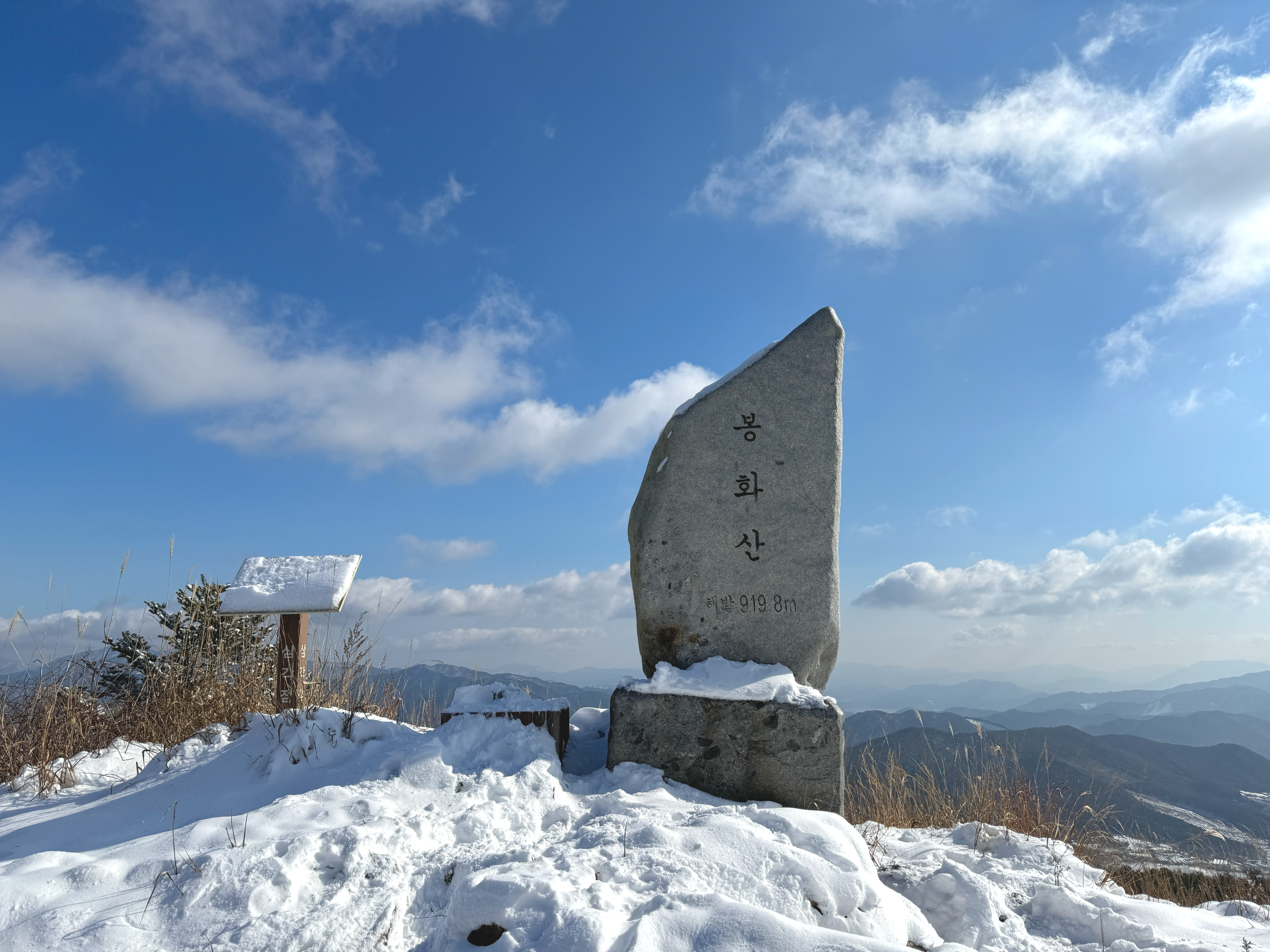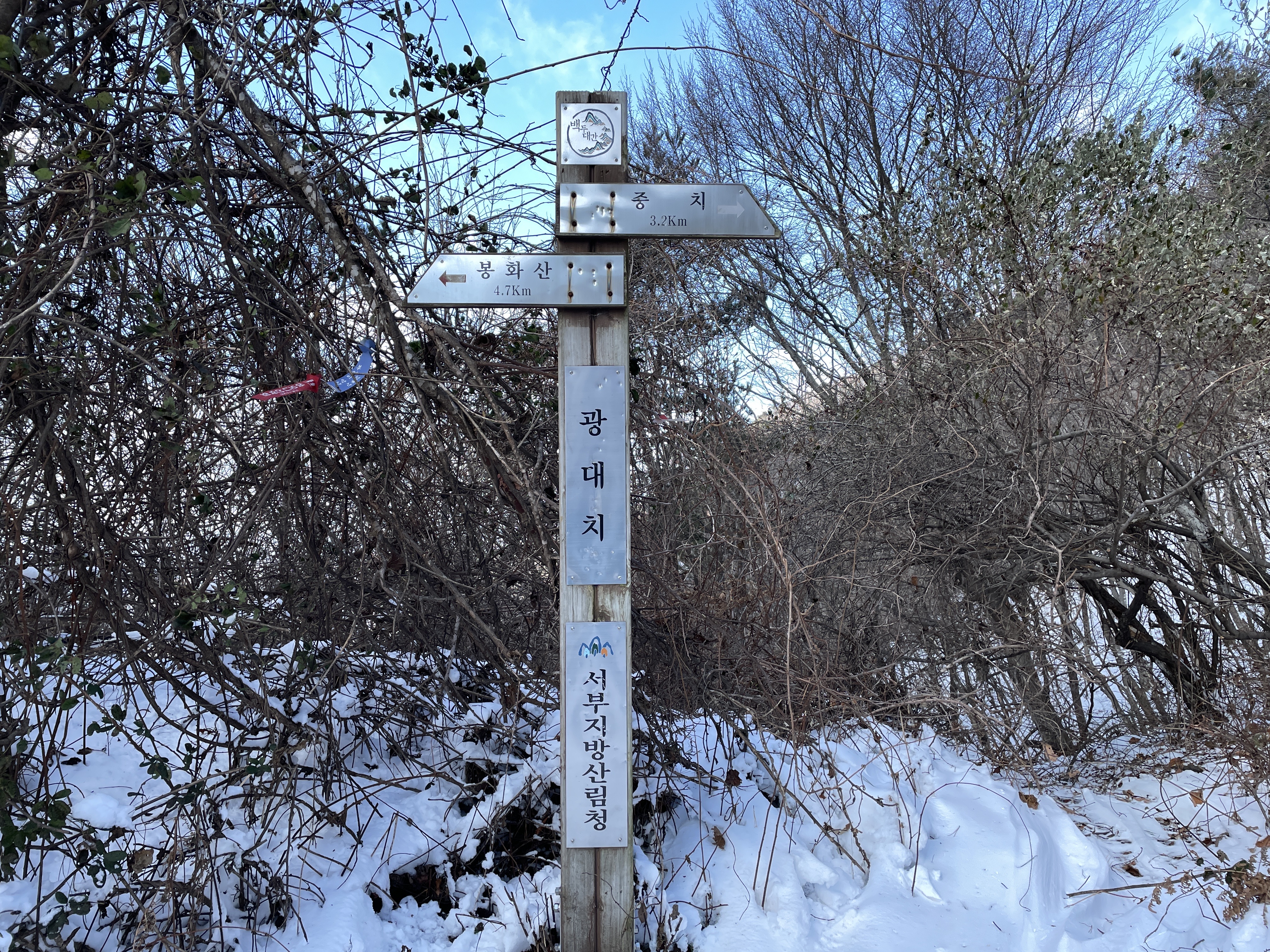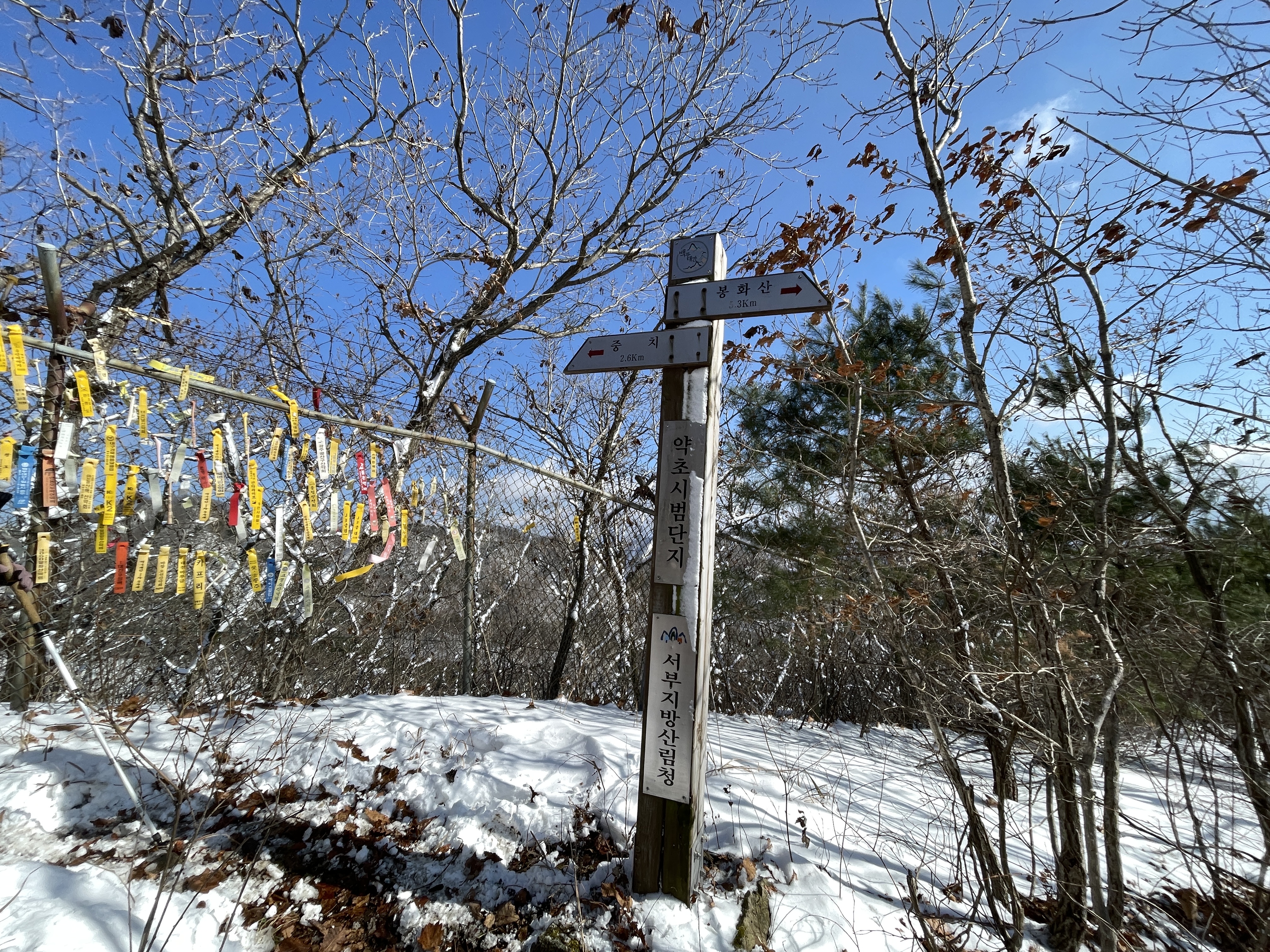 매봉(712.2m) 사방이 탁 트여 멋진 조망을 볼 수 있는 곳입니다. 봉화산으로 이어지는 구간이 철쭉군락지로 유명한 곳인데 철쭉나무에 하얀 눈이 덮여 있는 것도 볼만 한 풍경입니다. 매봉에서 봉화산으로 이어지는 산길에서 젓재치재까지의 짧은 구간은 철쭉나무가 빽빽하게 자라고 있어 등산로가 그 철쭉군락의 좁은 사잇길로 나있습니다.