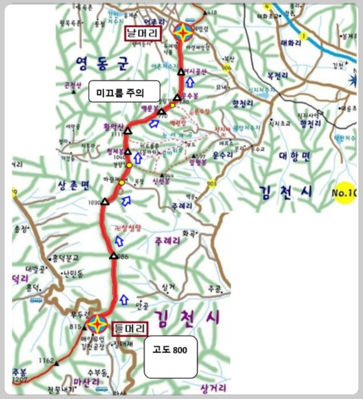 ▶ 산행코스 :우두령 -삼성산(984.9m)-여정봉(1032.1m)-바람재-형제봉(1044,5m)-황악산(1111.1m) -운수봉(668.2m)-여시골산(618.8m)-괘방령