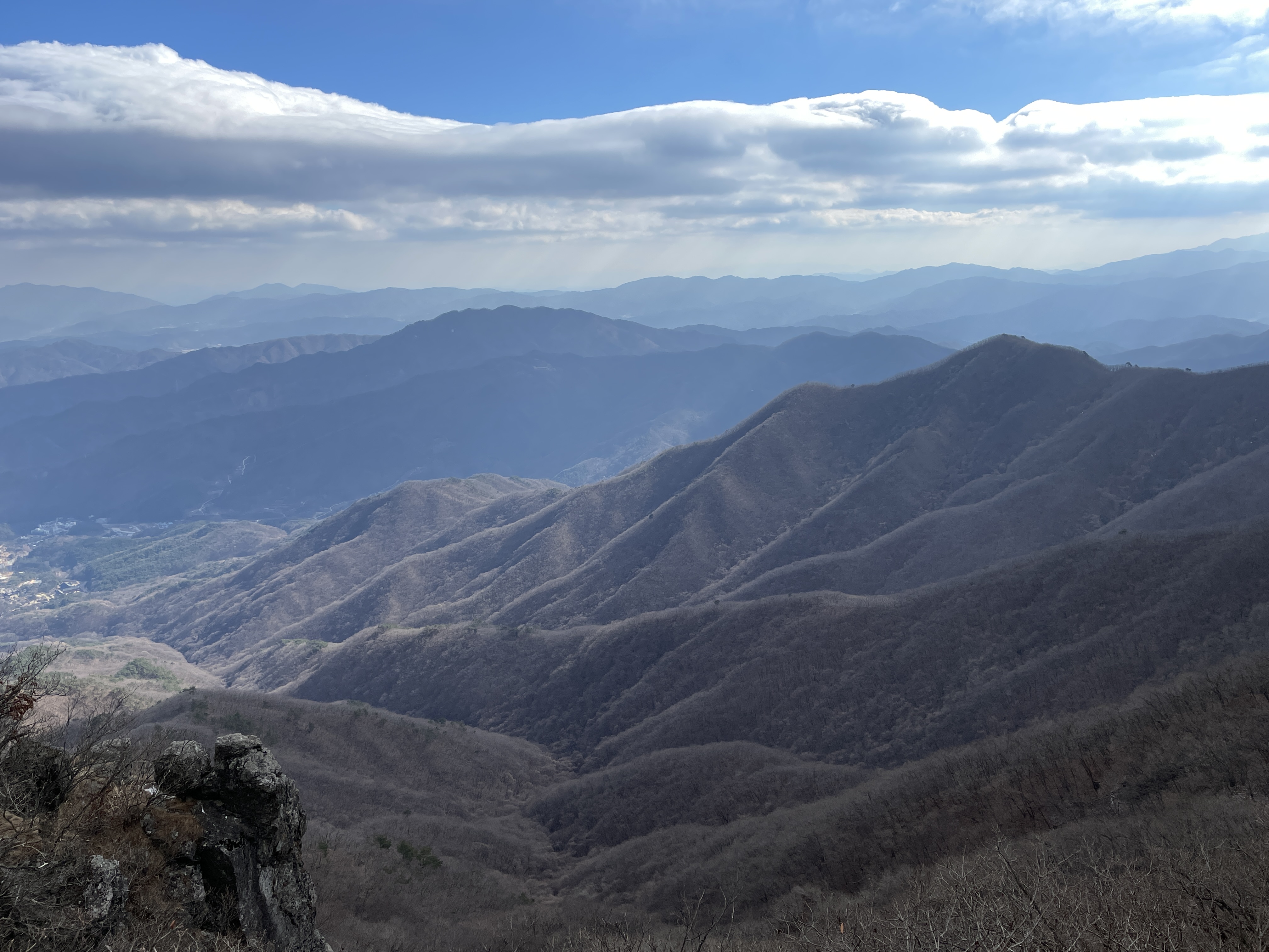 겨울산의 능선은 소의 등을 보는 것 같습니다. 참나무가 울창한 숲을 이루고 있는 산이어서 겨울산으로 더욱 아름답게 보입니다. 멀리 펼쳐져있는 덕유산에는 눈이 하얗게 덮여있는데 다음 구간에 가야 할 곳입니다.