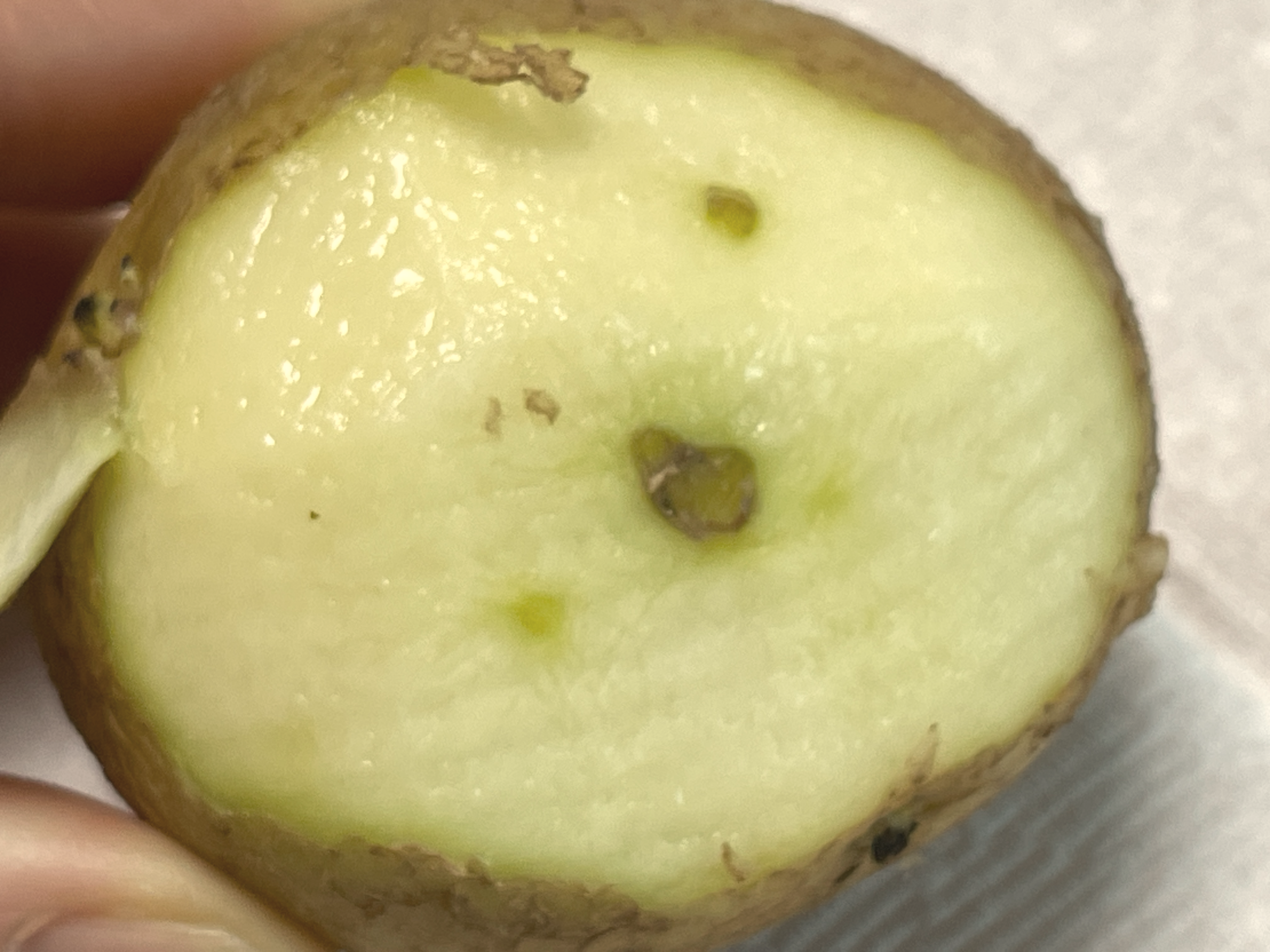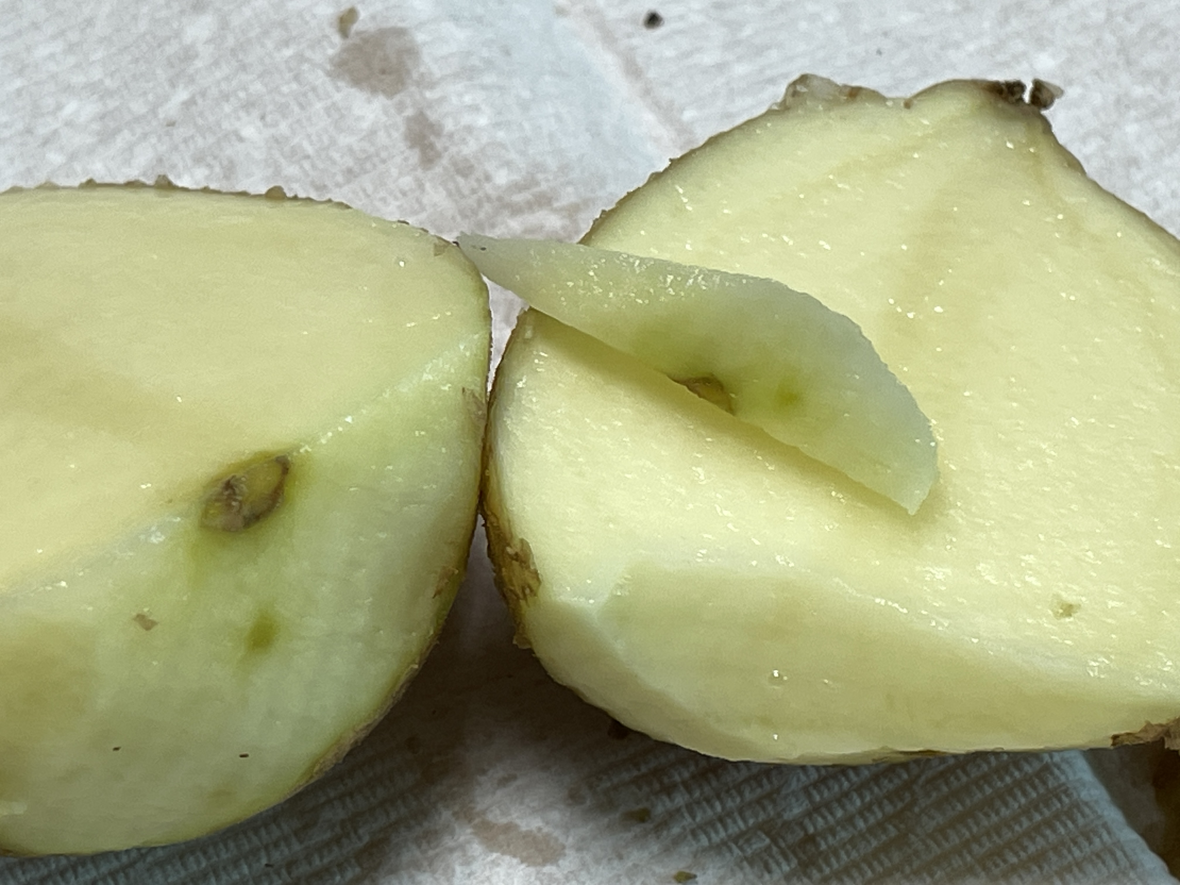 감자를 싹이 난 부분 주변을 보여주기 위해 잘랐습니다. 초록색 줄이 있는 부분은 싹이 났지만 주변이 별로 솔라닌이라는 알칼로이드가 들어있는 독성이 보이지 않아요. 그리고 보라색으로 표시된 곳은 주변에 검은 점으로 솔라닌이 형성이 되는 듯 보이고 빨간색으로 표시된 곳은 싹밑에 솔라닌이라는 알칼로이드가 들어있는 낭이 형성이 되어가는 것이 보이는데요. 그 싹 난 곳을 도려내고 사용하면 됩니다.