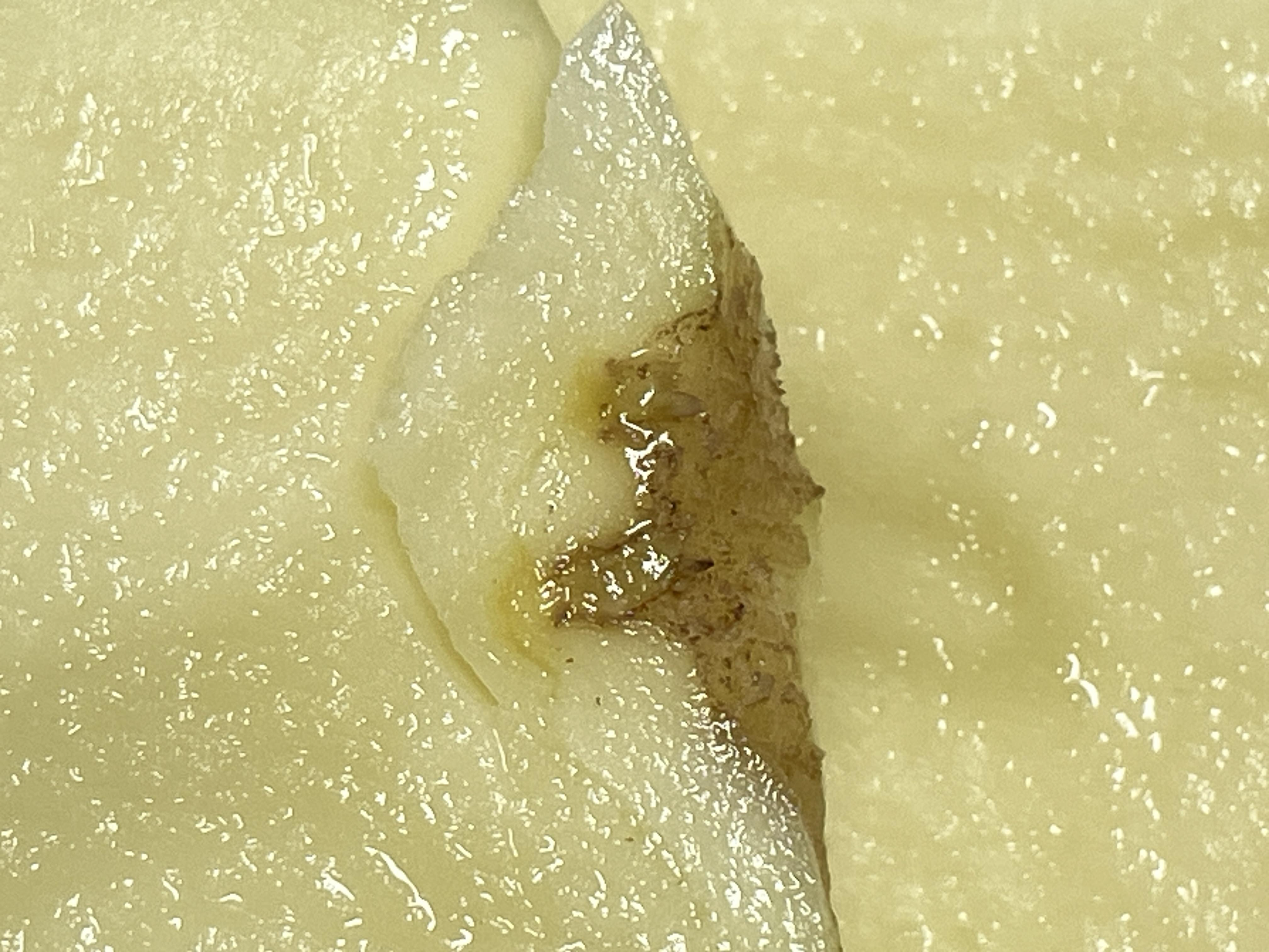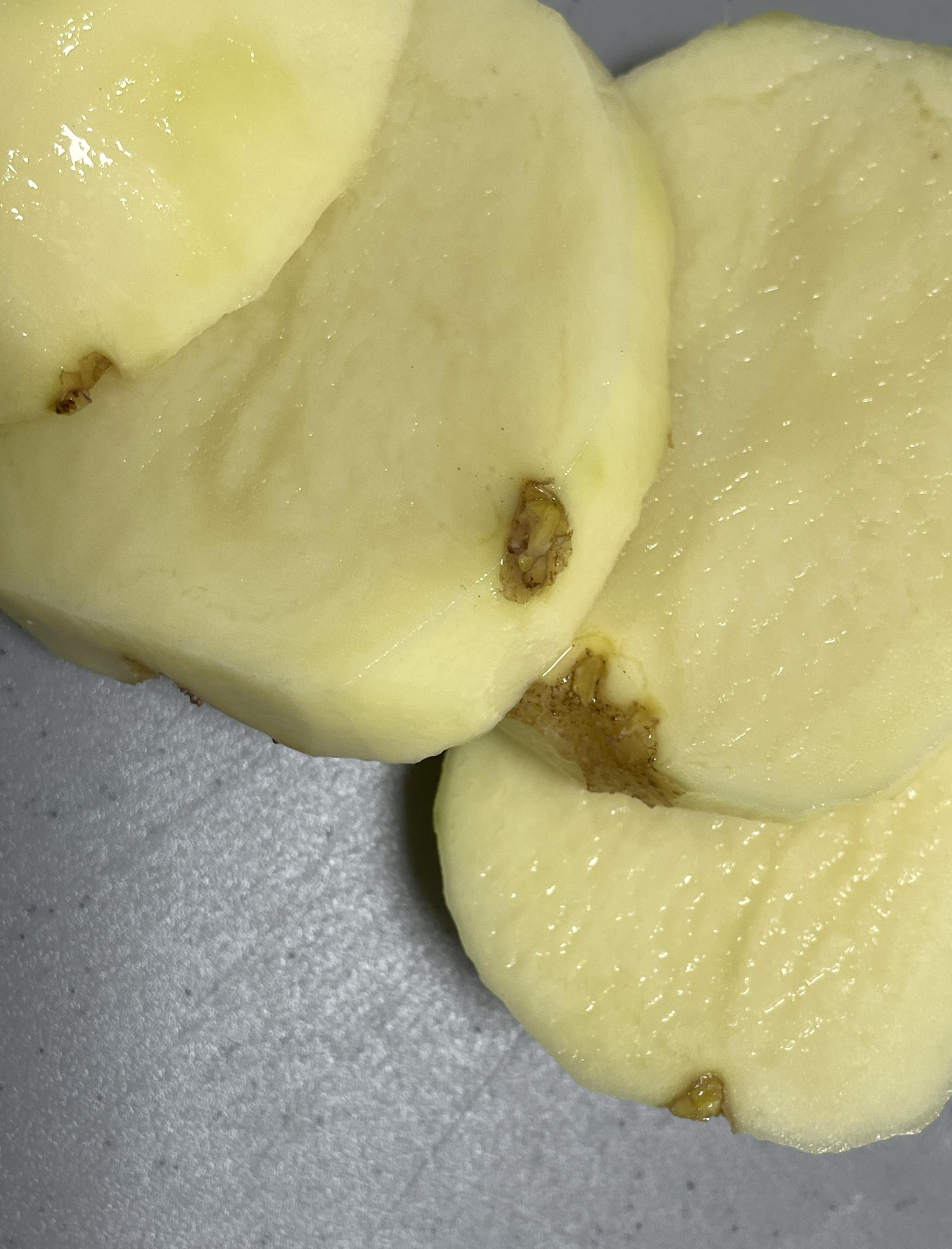 2. 초록으로 변한 감자에도 솔라닌 독성이 생겼을 것입니다. 그러나 버리지 마세요. 껍질을 깊게 까면 하얀 속살이 나옵니다.