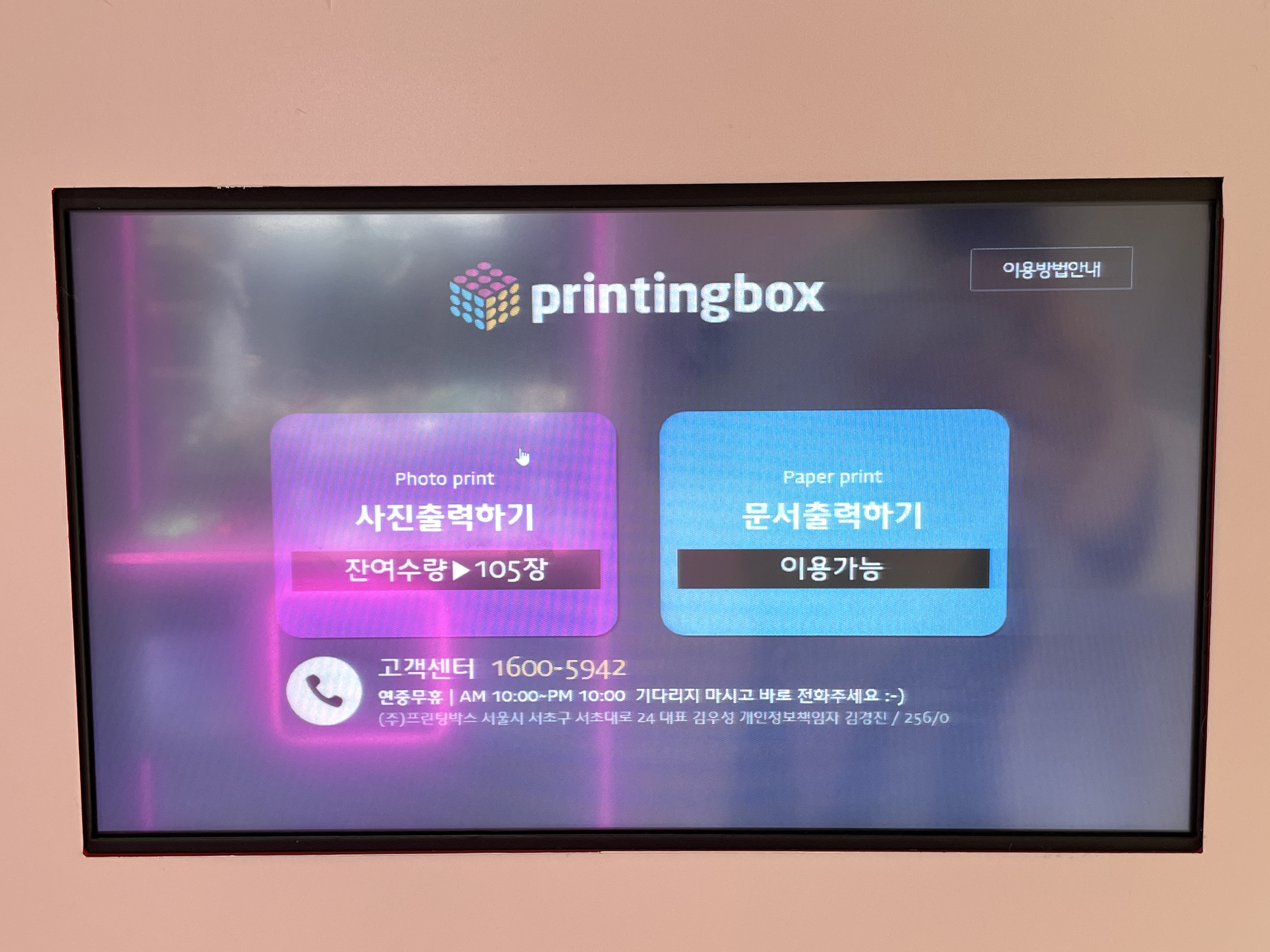 프린팅박스가 설치된 장소에 가면 위의 사진과 같은 기계가 설치되어 있는데 그곳에 사용설명이 기계에 붙어있어서 설명을 보고 하면 편리하게 사진과 문서를 출력할 수 있습니다.