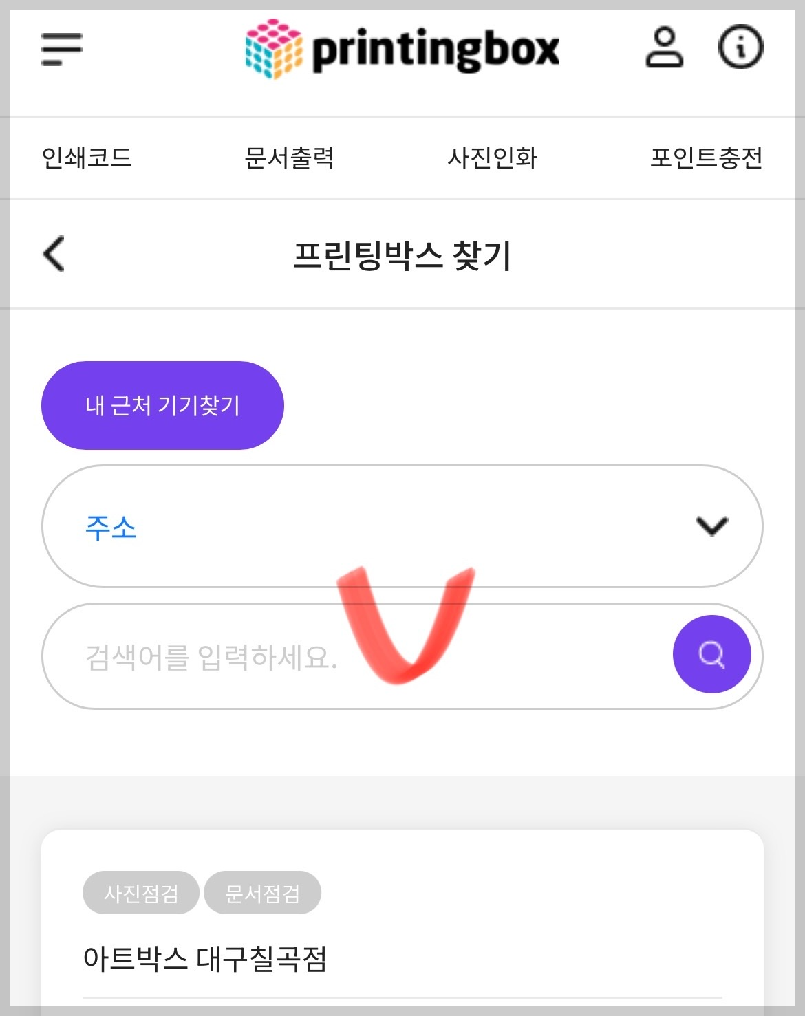 4. 자신의 사는 위치주소를 입력합니다. 그러면 그 지역의 여러 개의 프린팅 박스점이 표시됩니다.