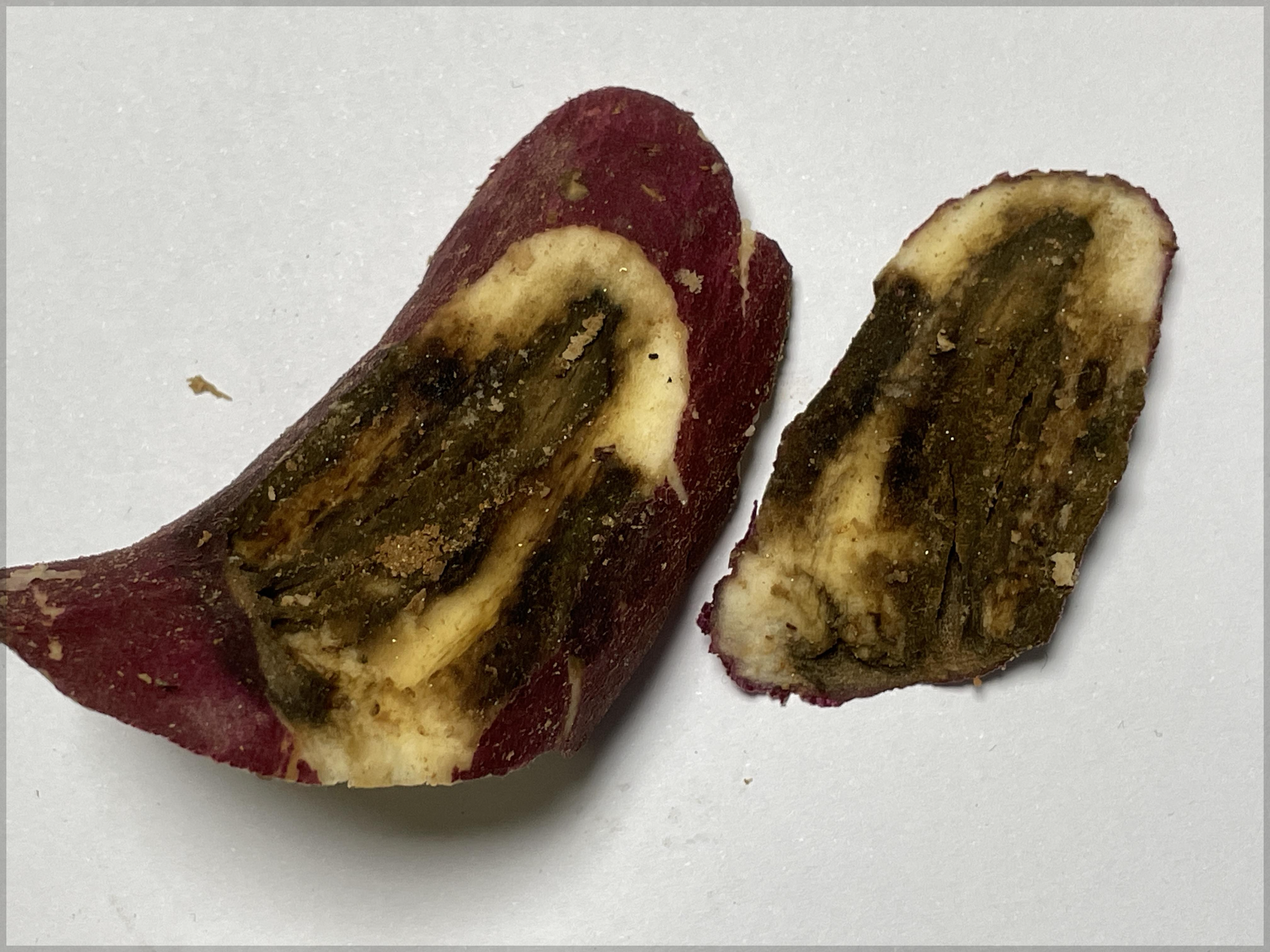 그런데 얼어서 썩은 고구마는 쪄서 먹을 수가 없습니다. 위의 사진처럼 고구마가 약간 시들 거리며 잘라보면 속 전체가 썩어가고 있습니다. 그래서 고구마는 보관을 잘해야 합니다.