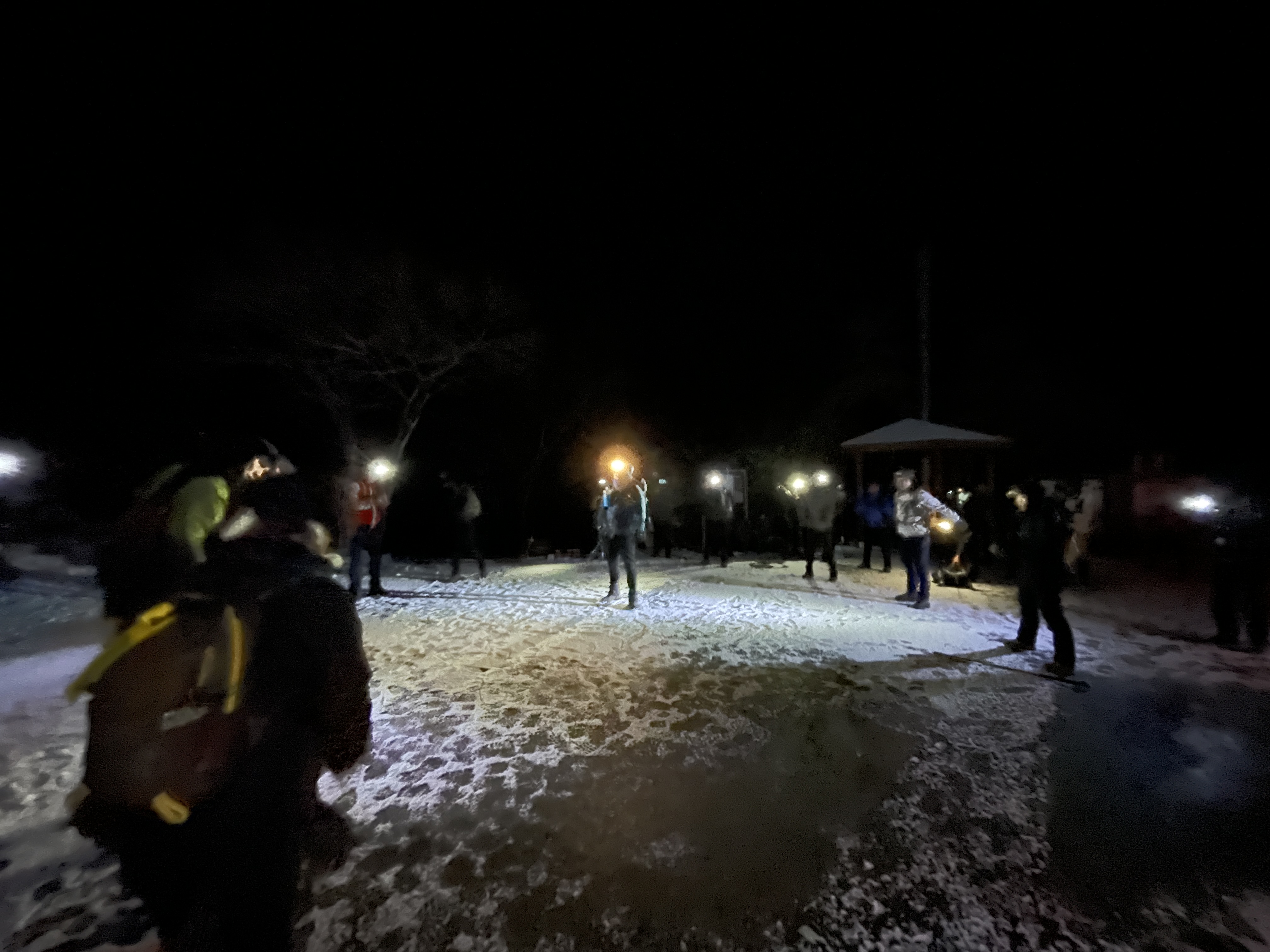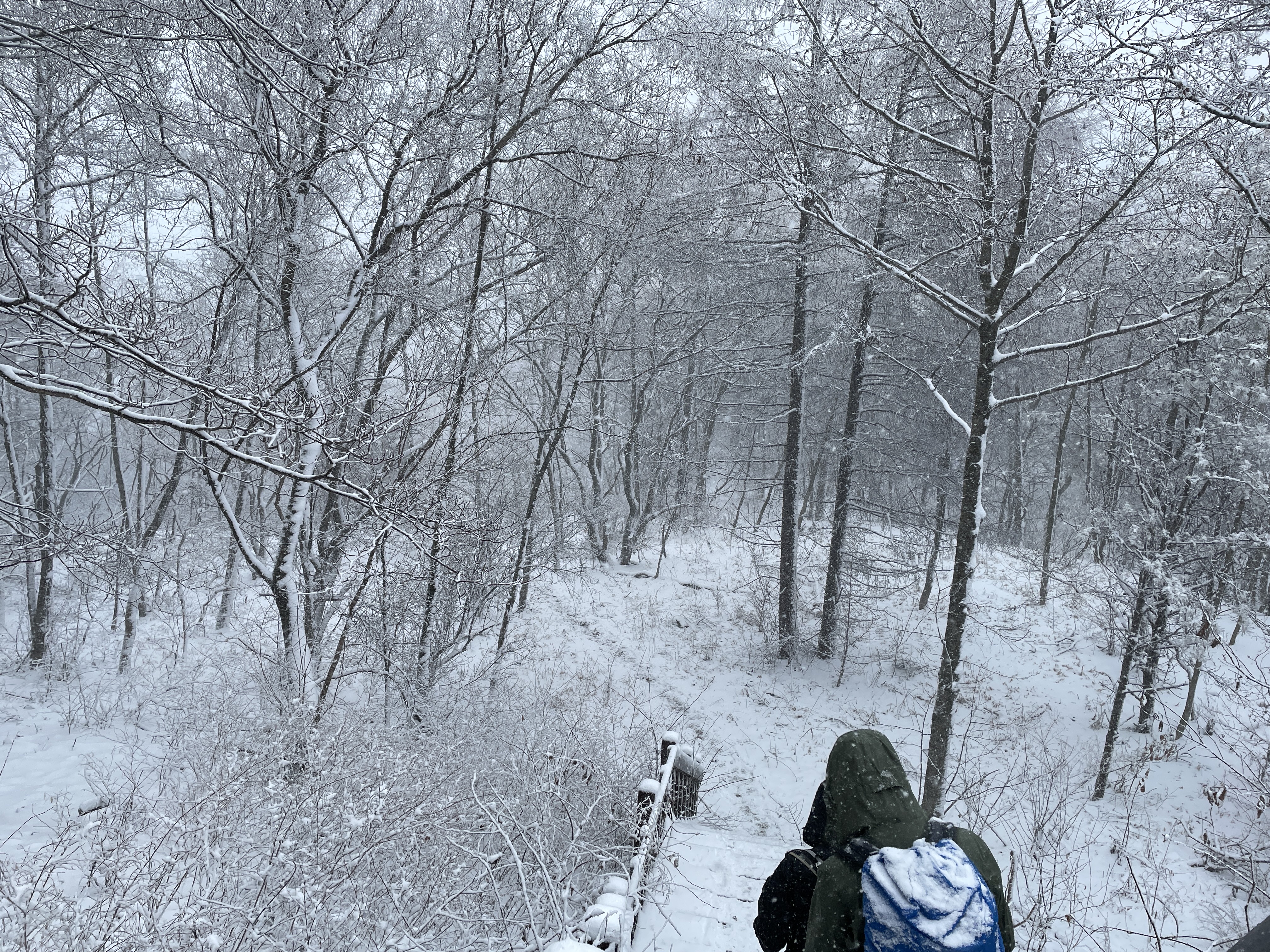 차에서 내렸을 때 눈이 이미 내려있었고, 눈은 계속 내리고 있는데 동그랗게 서서 체조를 하고, 눈 내리는 길을 아이젠착용 없이 올라가다 터널에서 아이젠을 착용하고 오르기 시작합니다. 10시간 30분 동안의 산행은 장시간 아이젠을 착용해서 발바닥이 많이 아팠어요. 무엇보다도 날씨가 포근한 편이어서 눈덩이가 발바닥에 계속 붙어서 발이 많이 아팠는데 아이젠 만드는 회사에서 눈이 붙지 않는 아이젠을 출시하면 좋겠다는 생각 해봅니다.