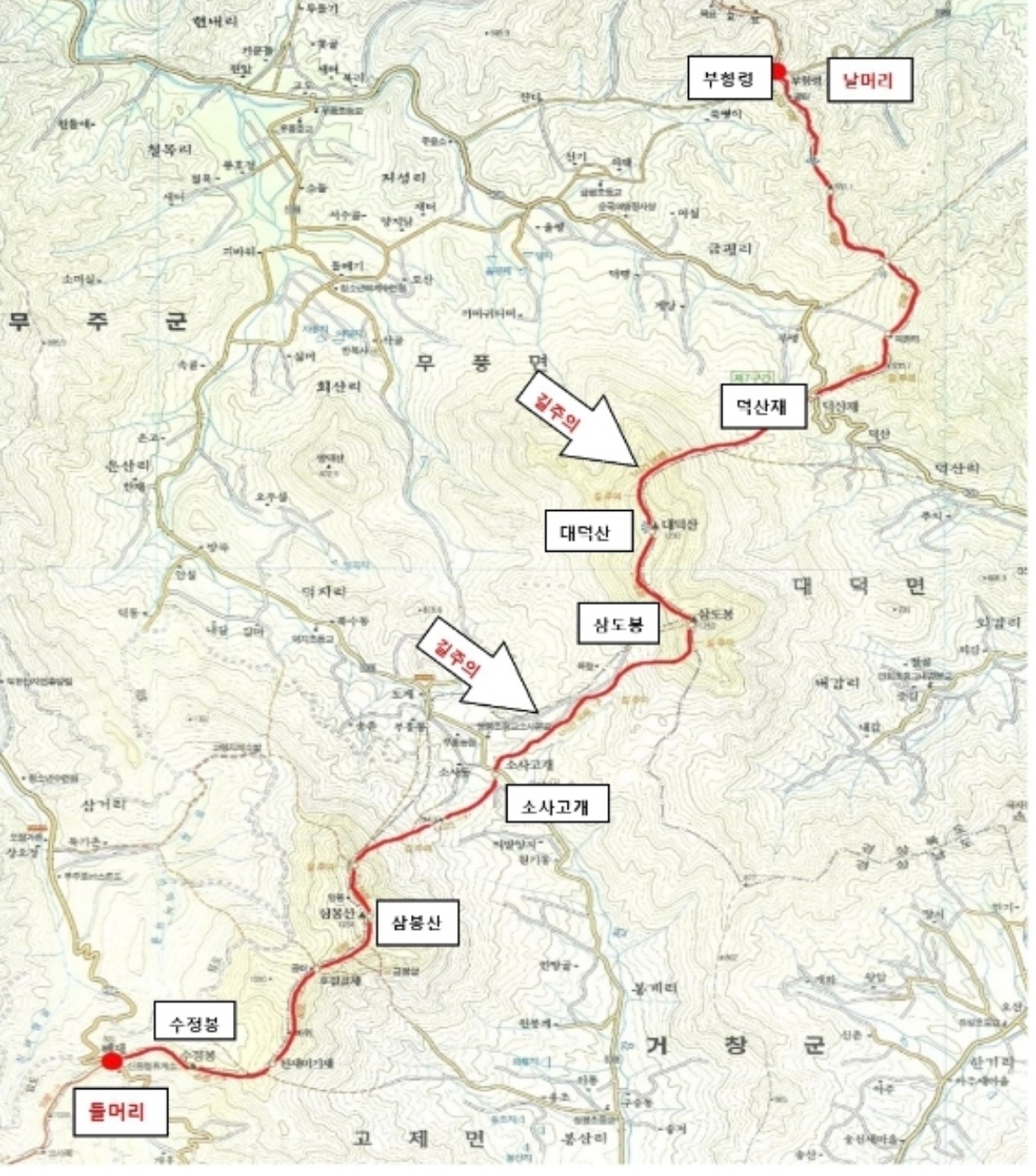▶ 산행코스 :신풍령-삼봉산- 소사고개- 삼도봉- 대덕산- 덕산재- 부항령