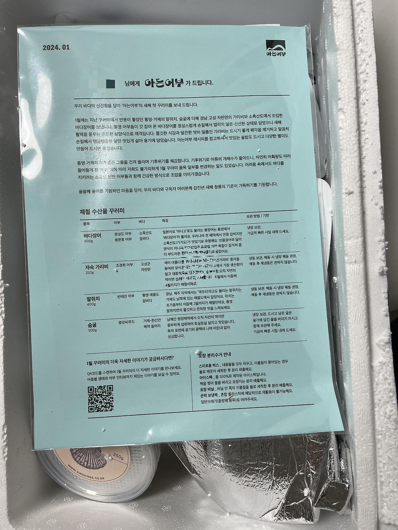 체험단활동으로 아는 어부의 1월 꾸러미(고등어, 숨굴, 자숙 가리비, 장어)를 받았습니다. 아이스박스를 열어보니 바다의 싱싱함을 가득 담은 박스에 아는어부의 가이드북이 눈에 들어왔습니다. 가이드북의 내용과 다른 것은 말쥐치가 잡히지 않아서 고등어를 대신 보냈다는 바다의 환경이 기후위기로 어획량이 줄었다는 소식과 아는 어부의 꾸러미 레시피가 함께 들어있었습니다.