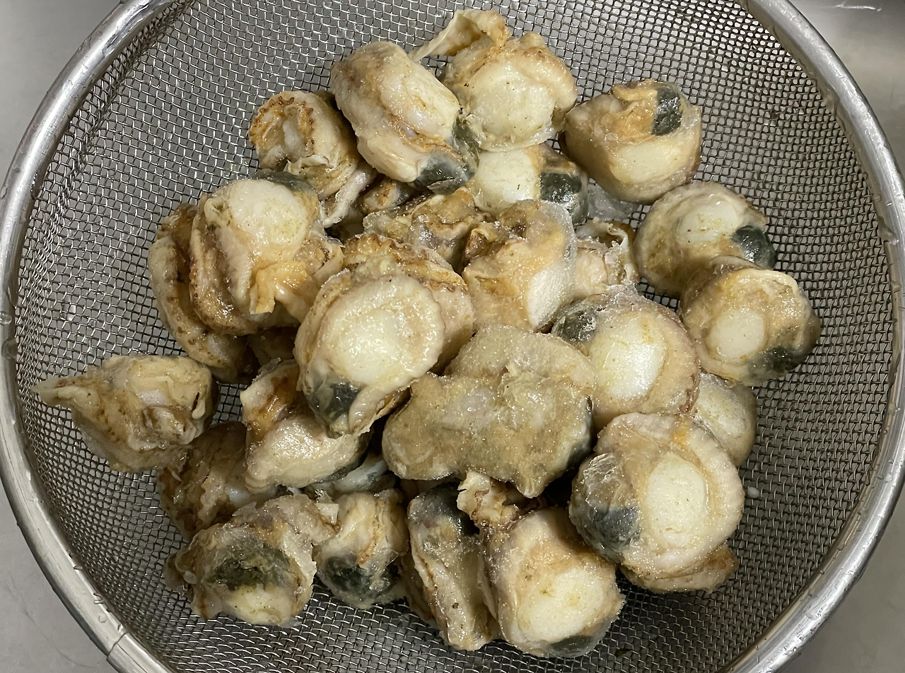 자숙가리비가 정말 바로잡아 삶은듯 탱글탱글합니다. 냉기를 가시게 팔팔 끓는 물에 살짝 담갔다 꺼내 양념과 무쳐 덮밥을 만들었어요. 두 사람이 먹기에 딱 맞는 양이었습니다. 싱싱하고 맛있었어요.