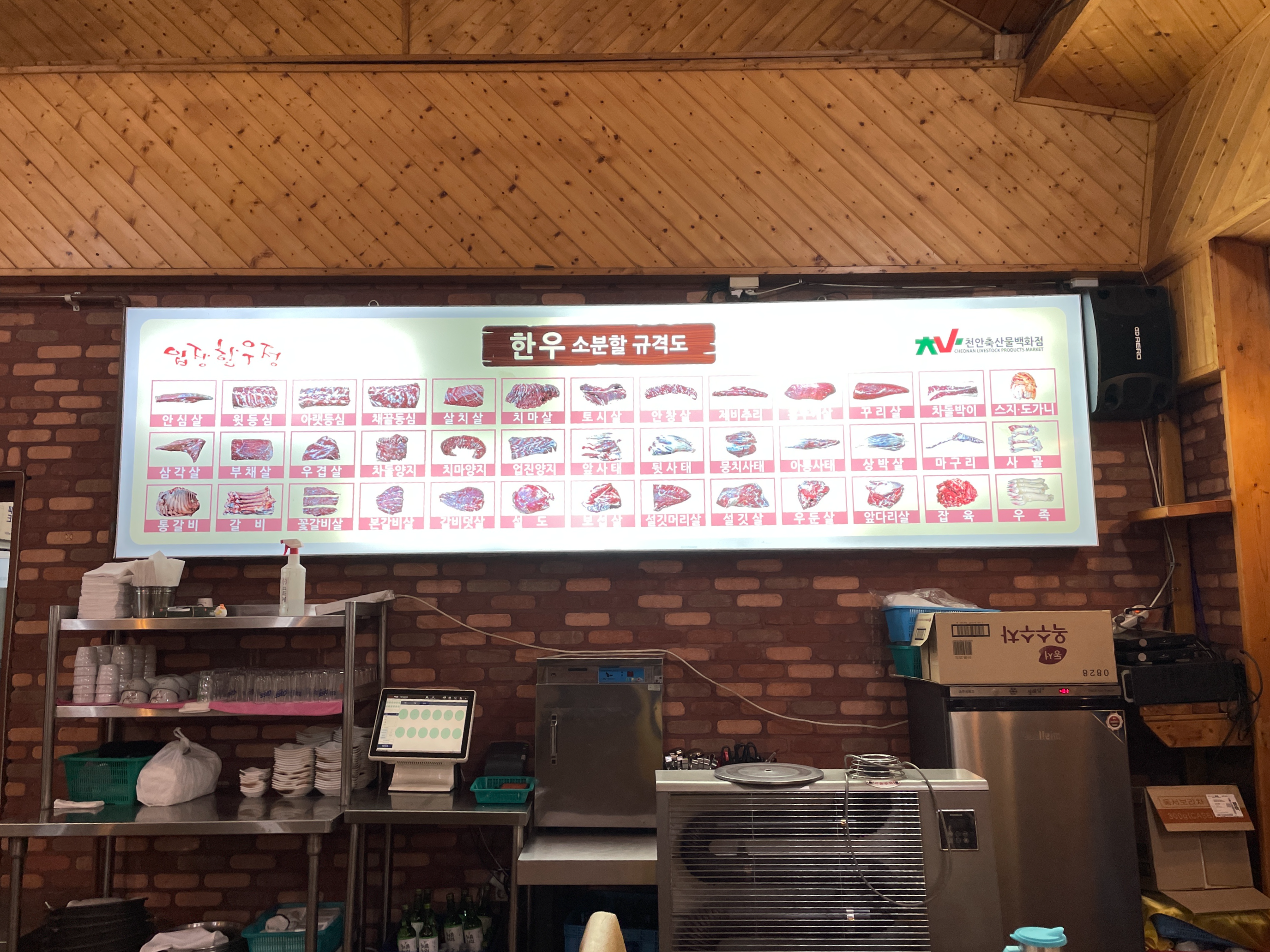 한우 소분할 규격도입니다. 소의 부위는 안심, 등심, 사골, 등 이런 것만 알았는데 이곳에 와서 보니까 39가지로 분류를 한 것을 처음 보아서 놀랐습니다. 저 사진을 보고 리뷰를 시작하려니 걱정이 됩니다.