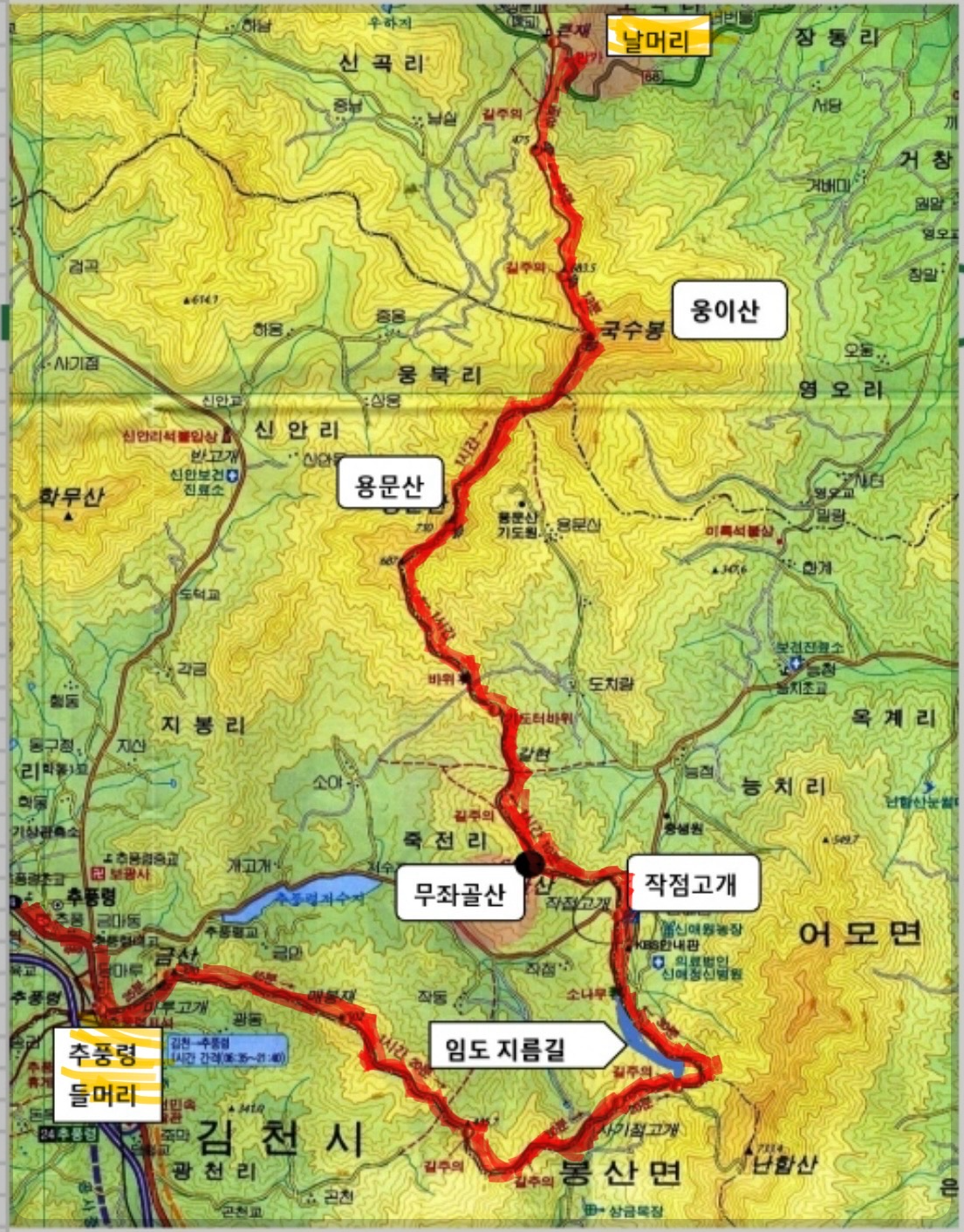 ▶ 구간별 거리: 추풍령- 2.5km- 502봉- 4.0km- 묘함산갈림길 - 2.0km -작점고개 - 5.0km - 용문산 2.24km - 국수봉- 3.0km 큰재