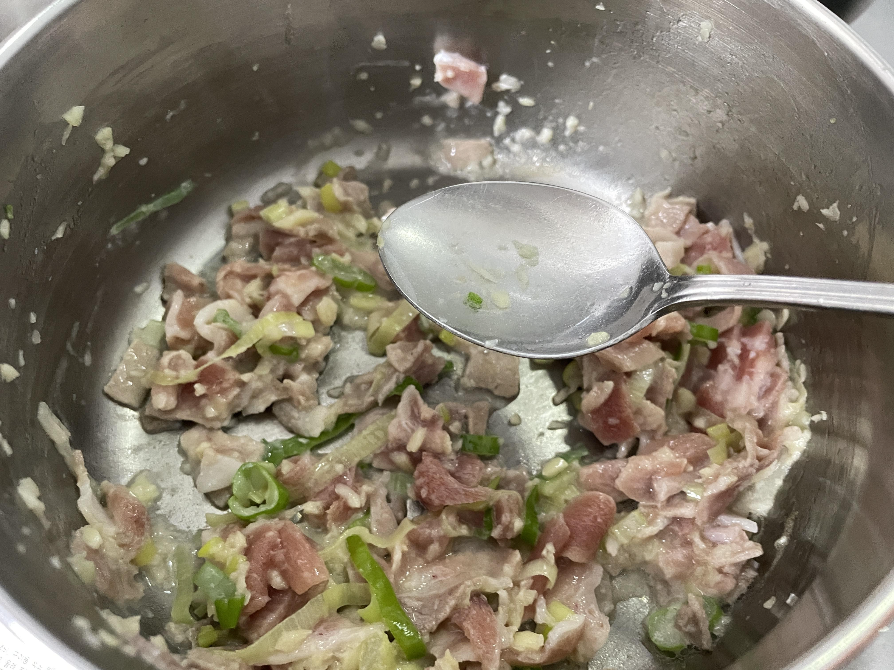 2. 돼지고기를 볶다가 생강술을 1스푼 넣어줍니다.