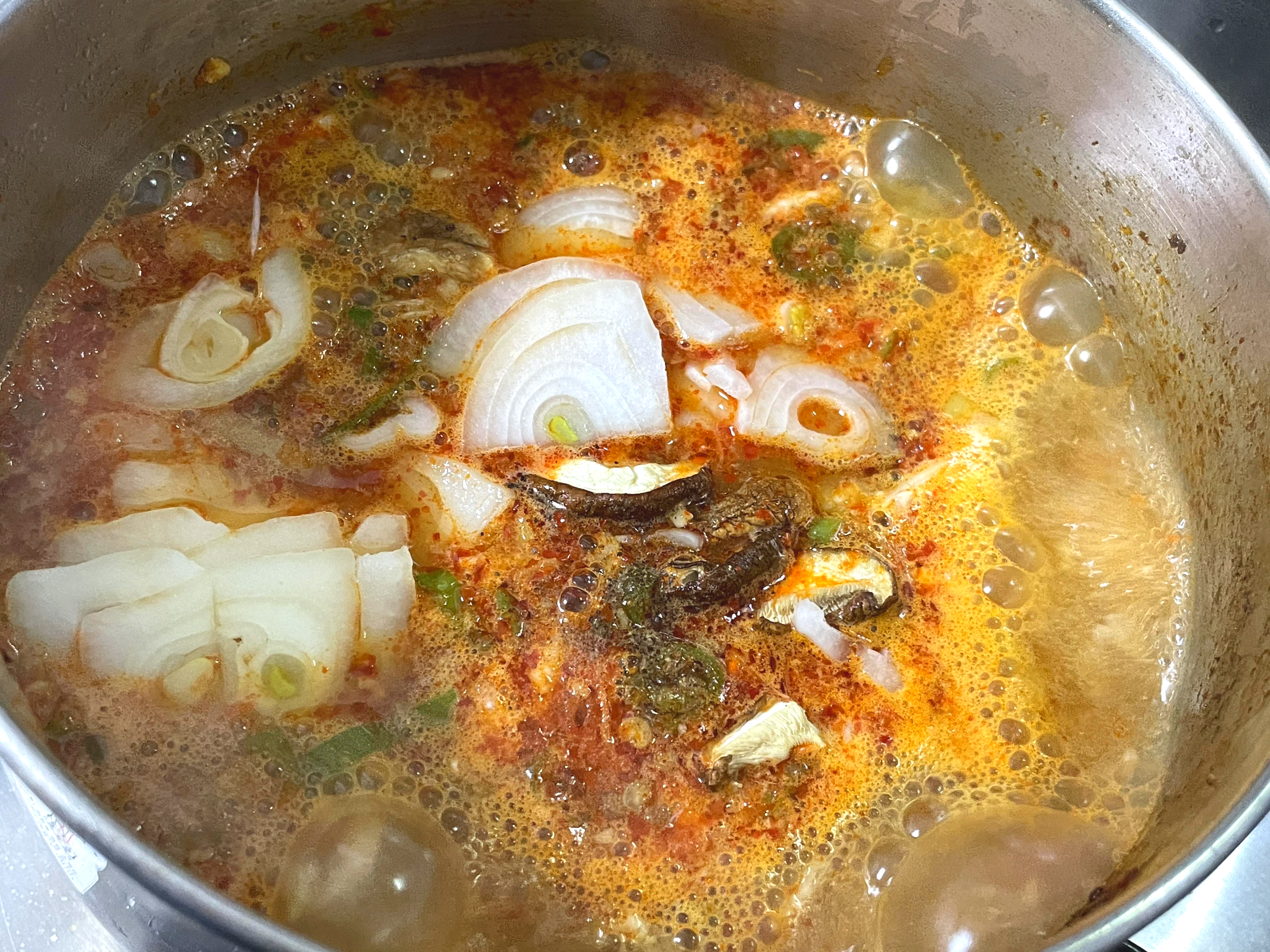 8. 표고와 양파를 넣어주고 팔팔 끓여줍니다.