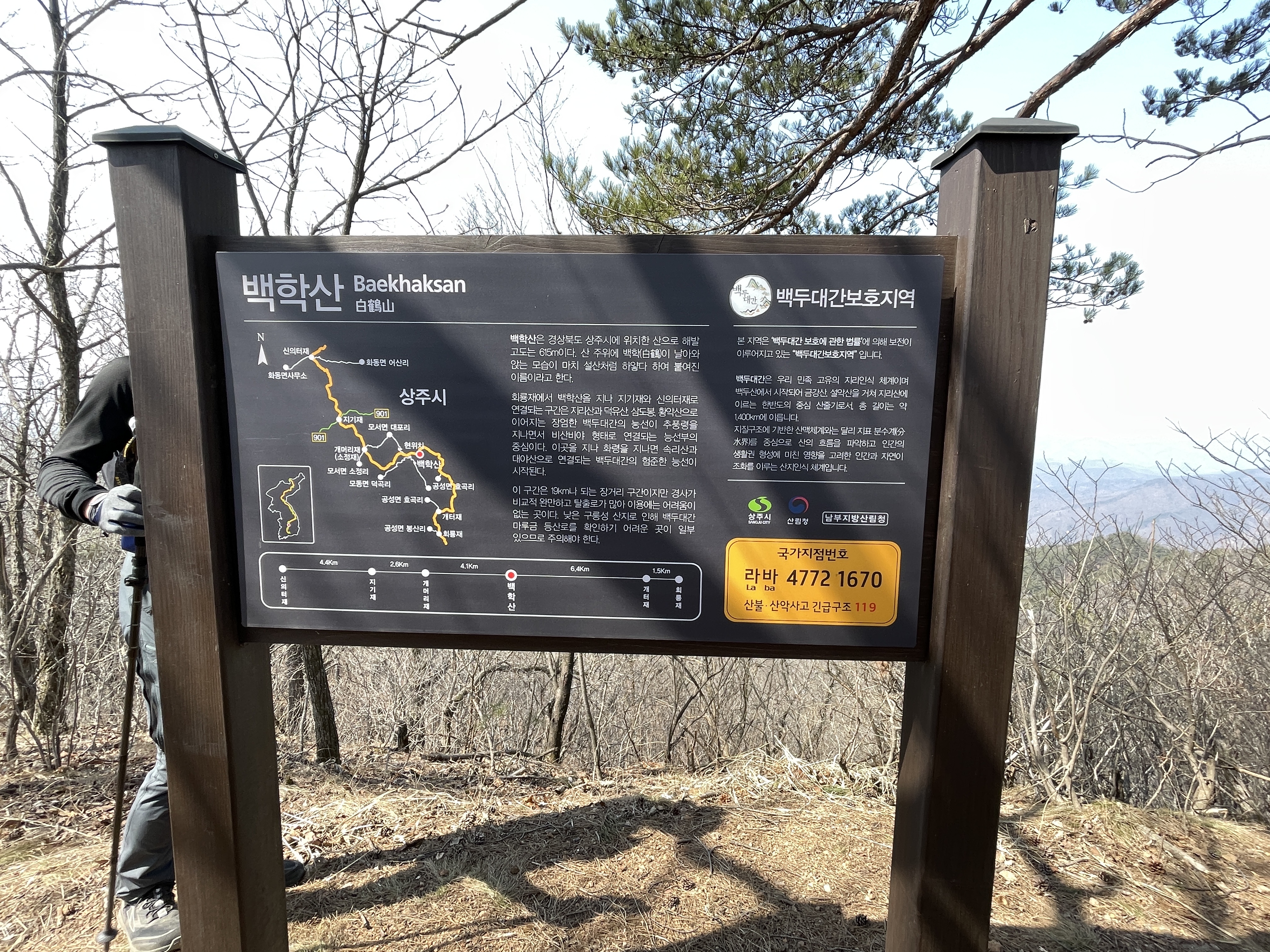 위의 고도사진을 보면 고도가 낮은 산에 속하고 백두대간을 많이 하신 분들은 쉬운 산중에 하나라고 하는데 저는 선두에서 세 번째에 따라가는데 종아리 근육과 엉덩이 근육 주변이 뻑뻑하게 차오르면서 쉴까, 걸을까를 갈등하게 되는데 저는 걷는 쪽으로 몸이 바뀌어 가고 있습니다. 자잘하게 오르내림이 근육을 많이 당기게 해 준 구간이고요. 특히 백학산 올라가는 능선은 조금 쉬어가고 싶은데 꾹 참고 올라가야 할 만큼 힘든 구간이었습니다.