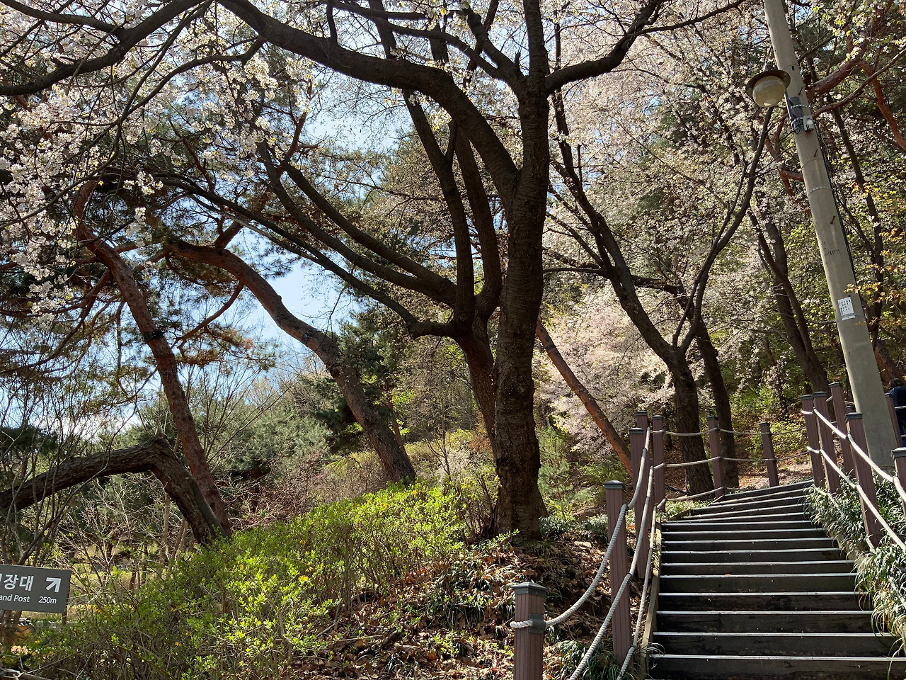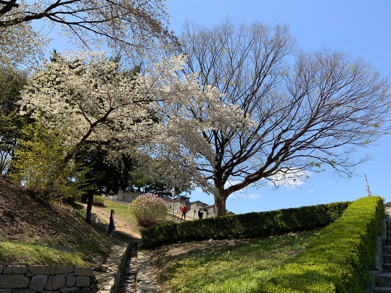 약수터에서 서장대 올라가는 길은 4~5분 정도면 충분히 올라갈수 있다. 올라가는 중간중간에 아름드리 벚꽃나무가 예쁘게 피어있다.