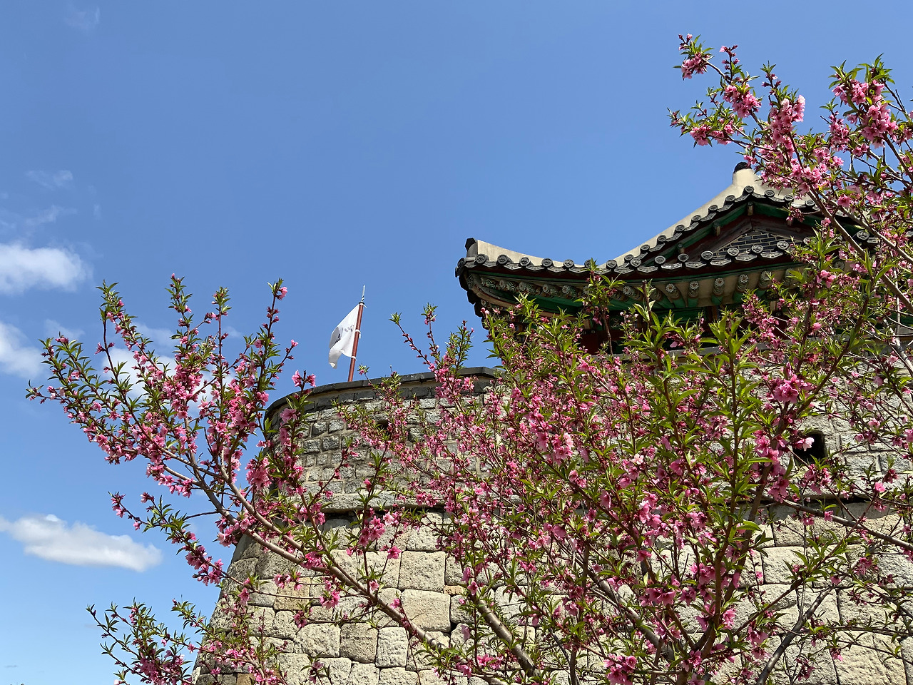 서북각루에 복사꽃이 예쁘게 피는데 이틀연이어 내린비에 꽃잎이 다 떨어졌는데 그래도 화사한 햇볕을 받아 곱게만 보인다. 이곳은 누각에 올라가 보면 수원서북쪽이 멀리까지 내려다 보이는 곳이다. 하늘도 맑고 깨끗해서 성벽이 목욕하고 있는것 같은 기분이 든다.