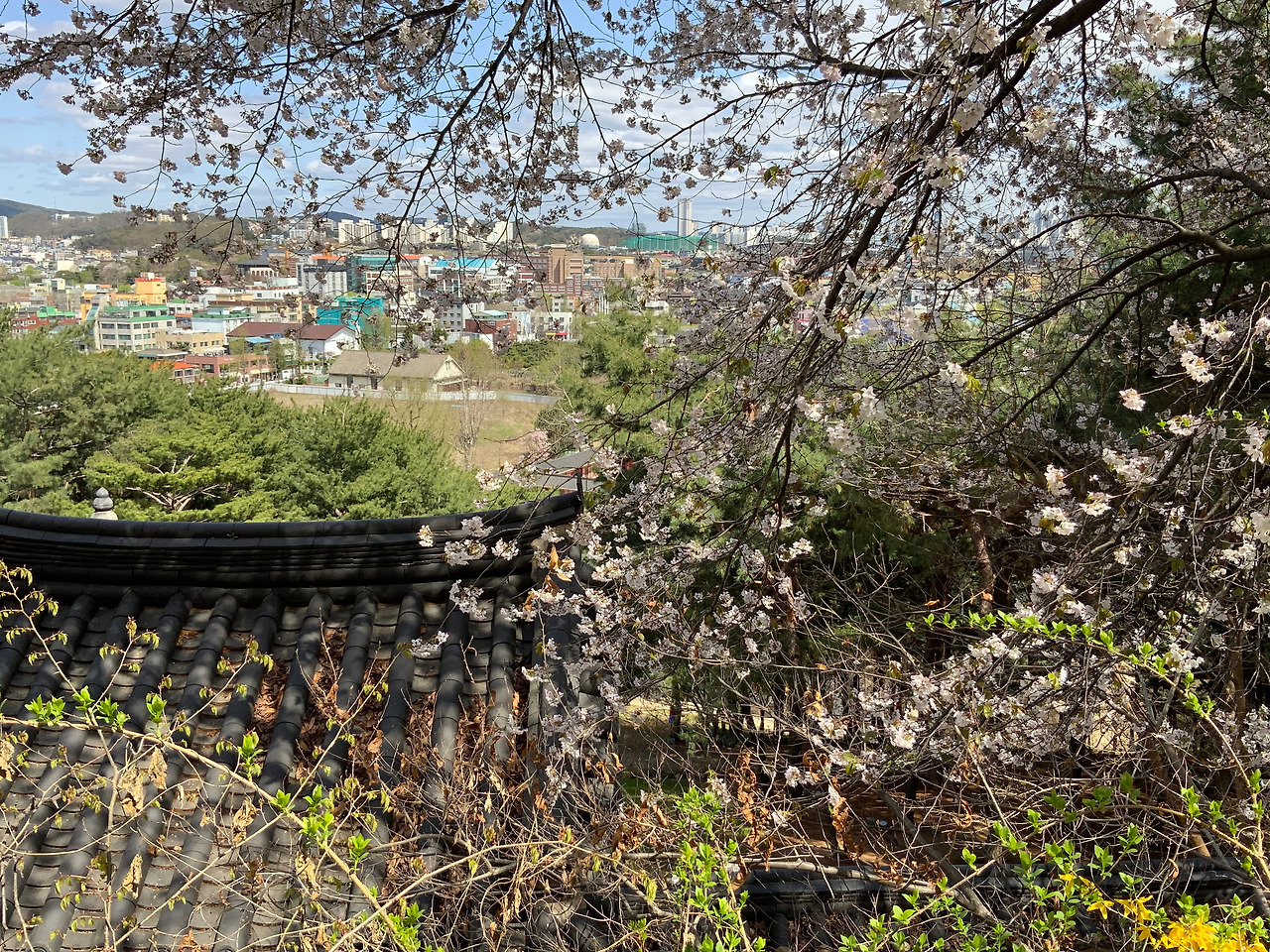 화성행궁 담 안에 정자에 벚꽃이 척 늘어져 기와지붕과 아름다운 선을 연출하고 있다.