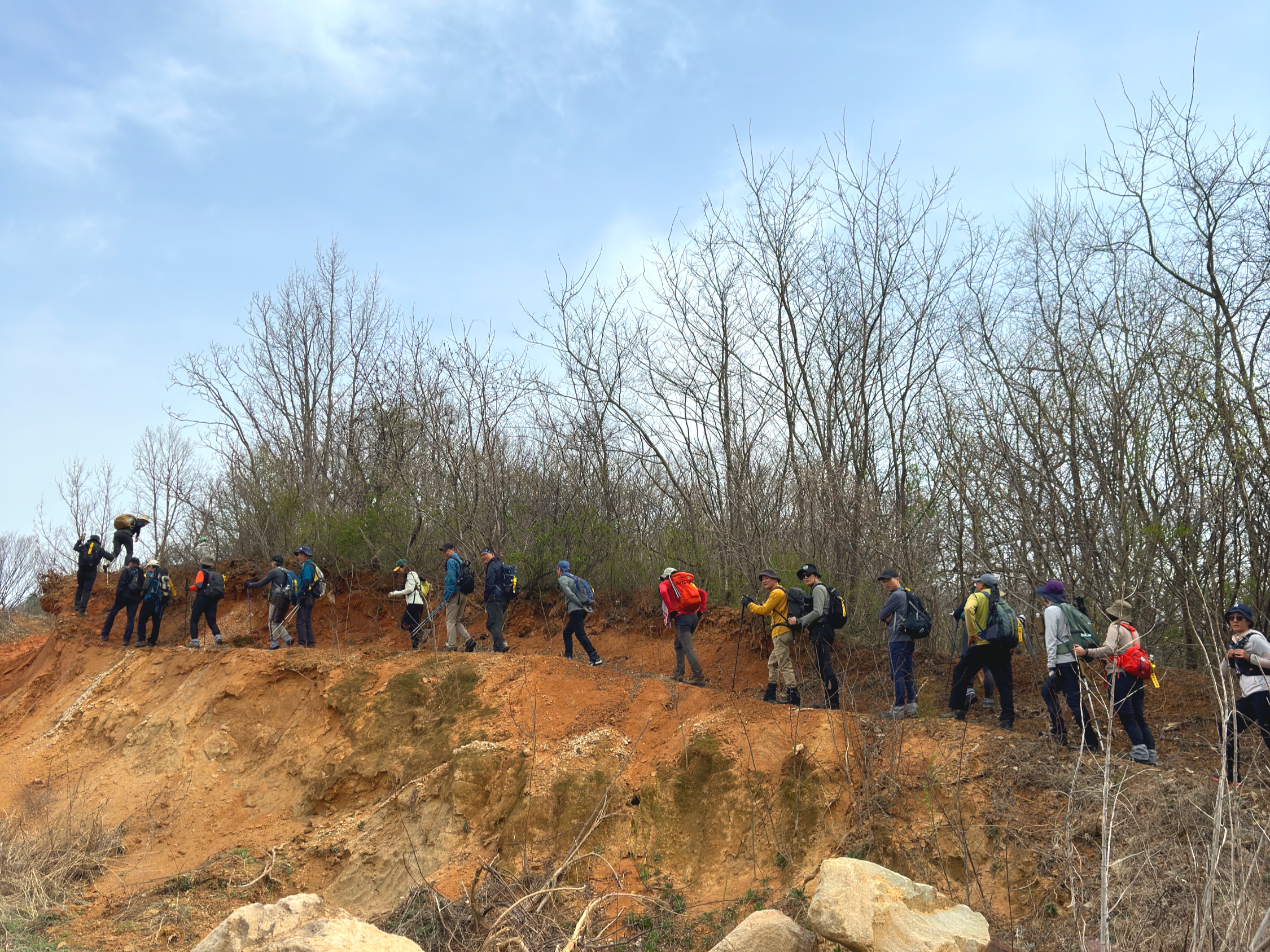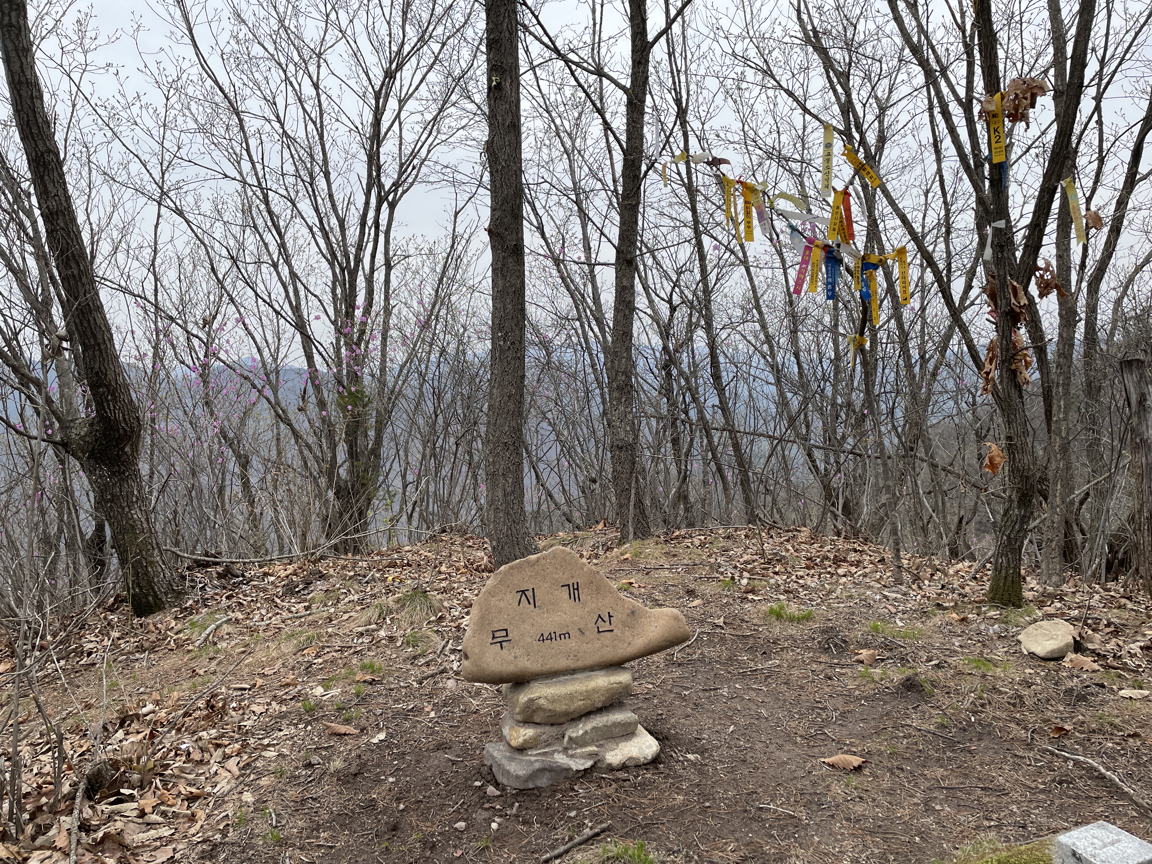 첫 번째로 눈에 뜨인 것이 진달래꽃입니다. 백두대간길 끝나는 곳까지 진달래꽃이 활짝 피어 우리 대원들을 반기며 응원하는 듯했고, 완만한 산행코스는 험난한 겨울 백두대간길을 묵묵히 걸어온 우리팀을 편안하게 걸을 수 있게 어루만져주는 것 같은 코스입니다.