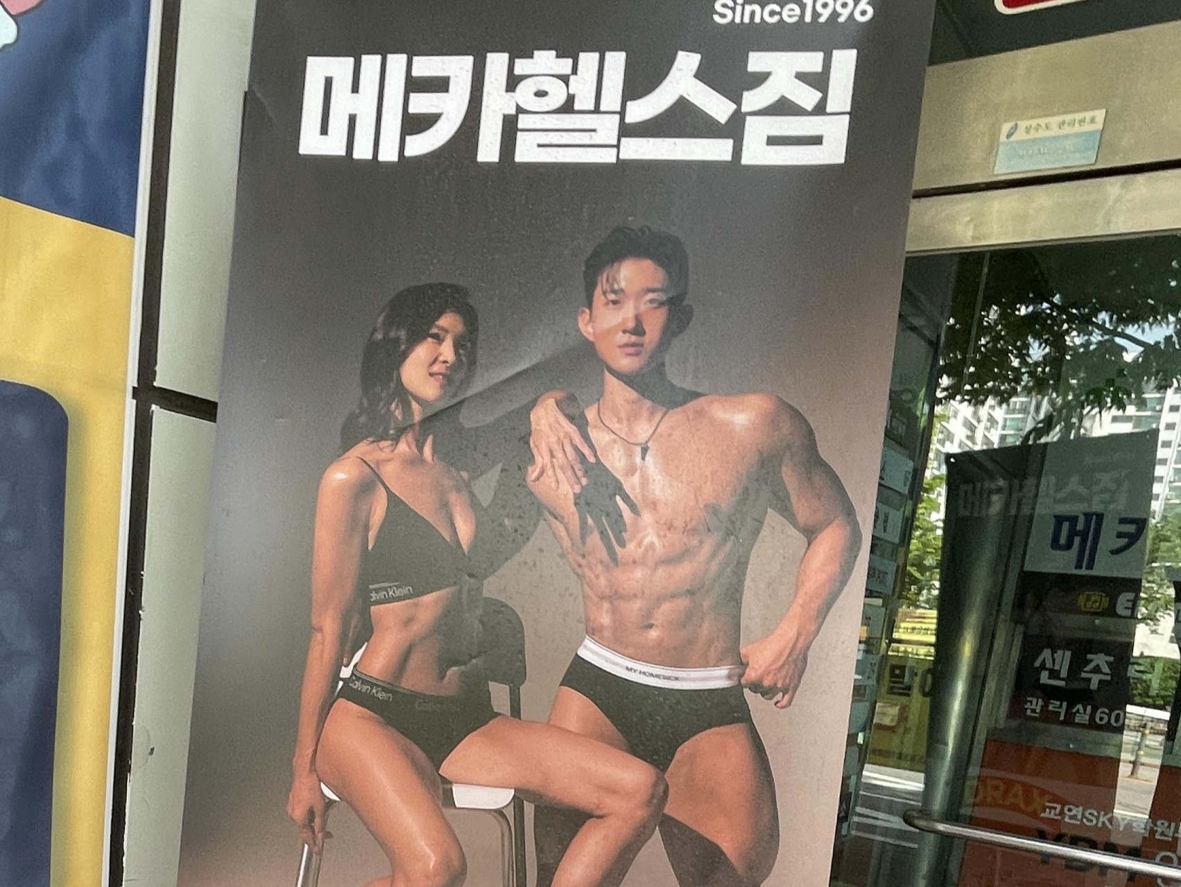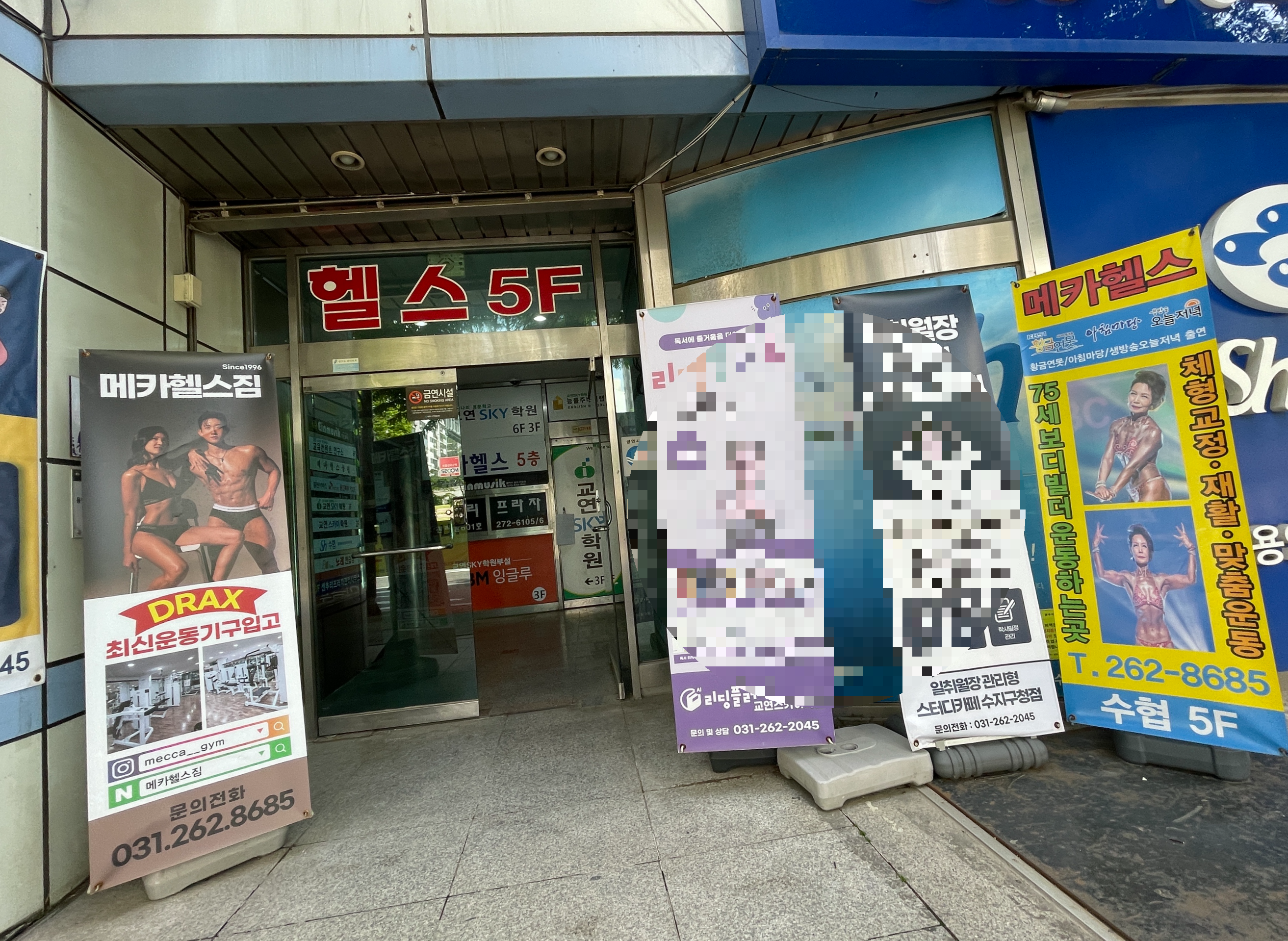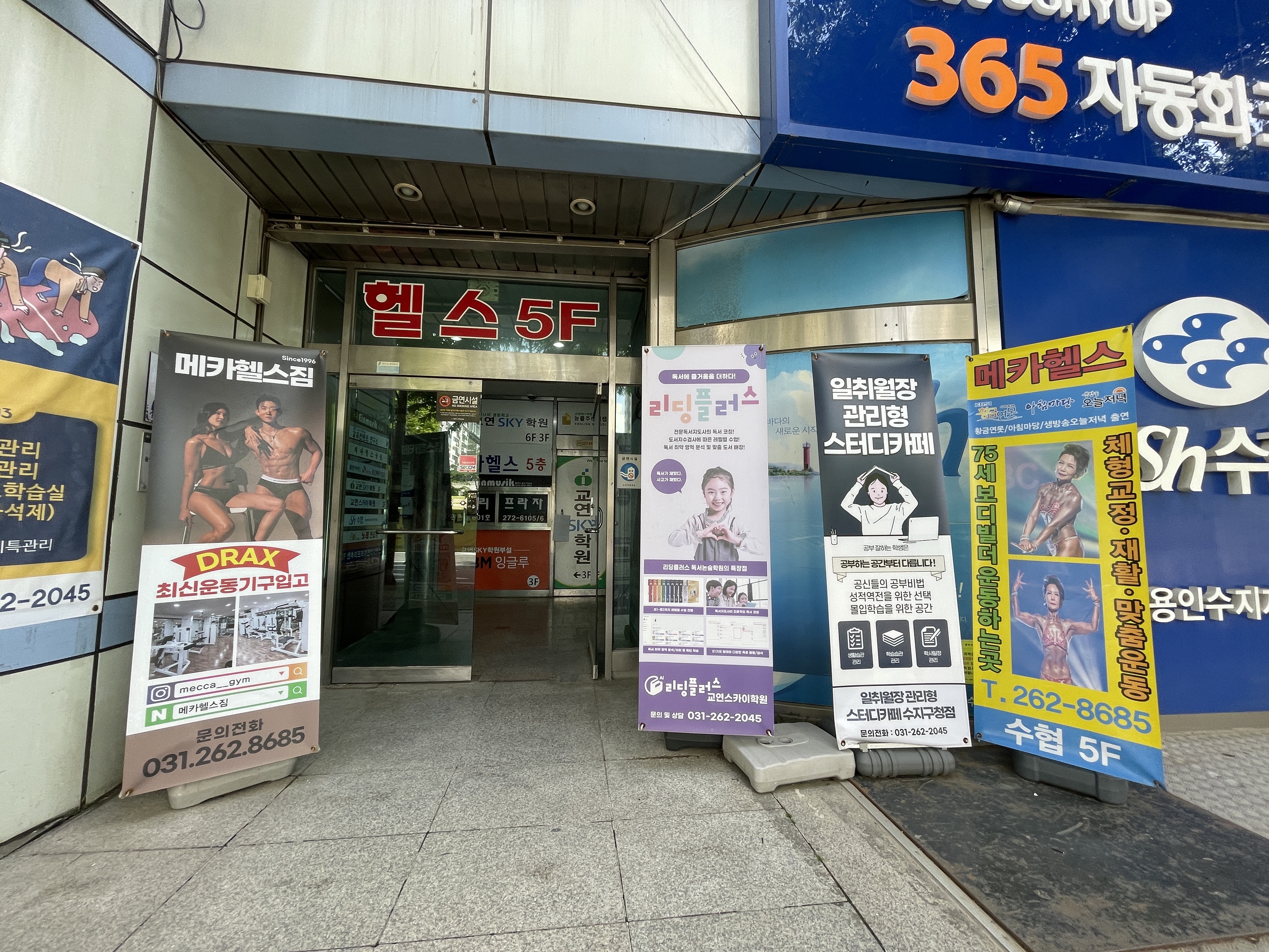 ● 버스정류장 쪽에서는 메카헬스짐간판이 없어요. 건물 들어가는 입구 문위에 헬스 5F 표시 있고, 메카헬스짐이라고 쓰인 광고가 두 개 보입니다.