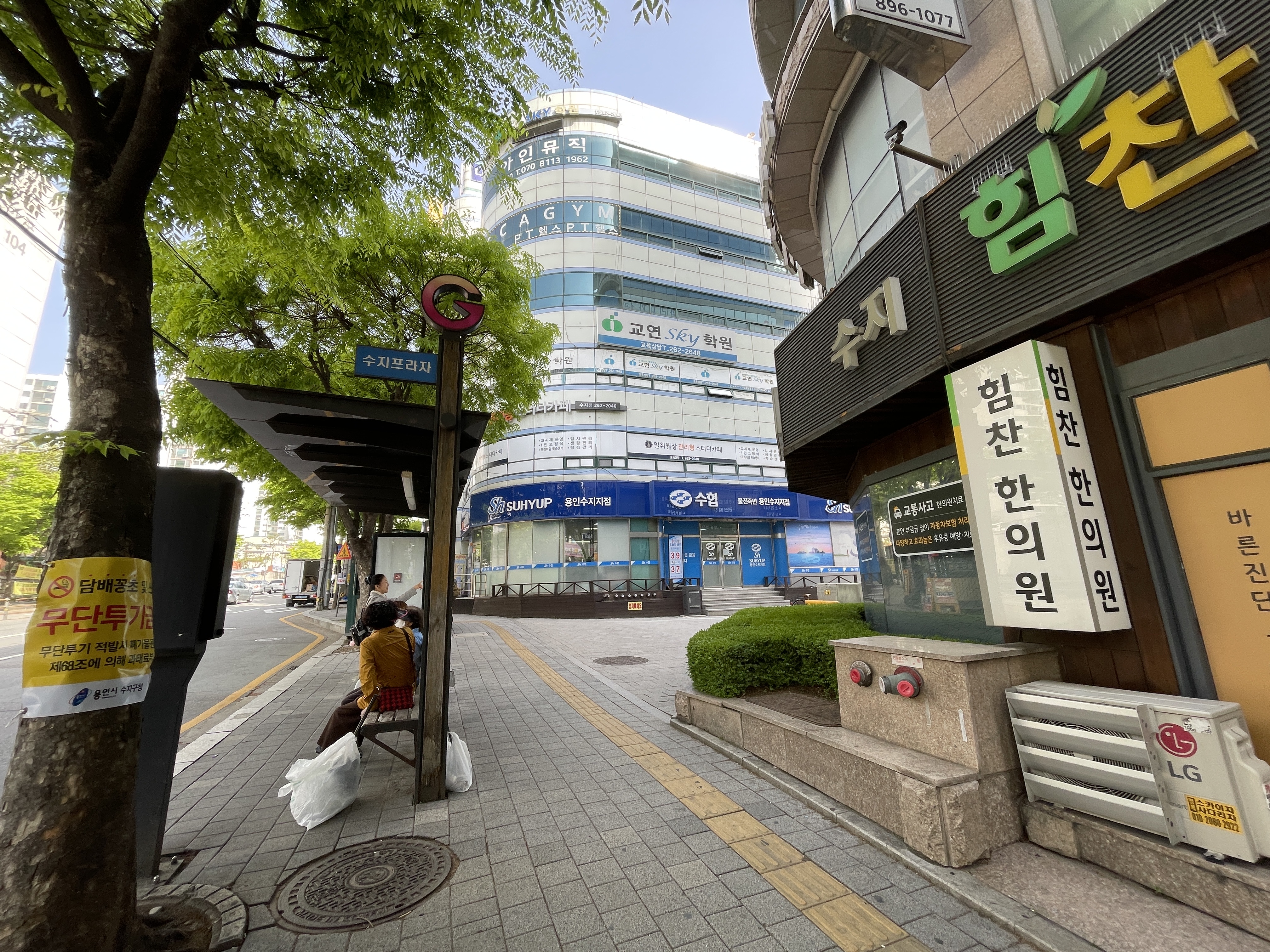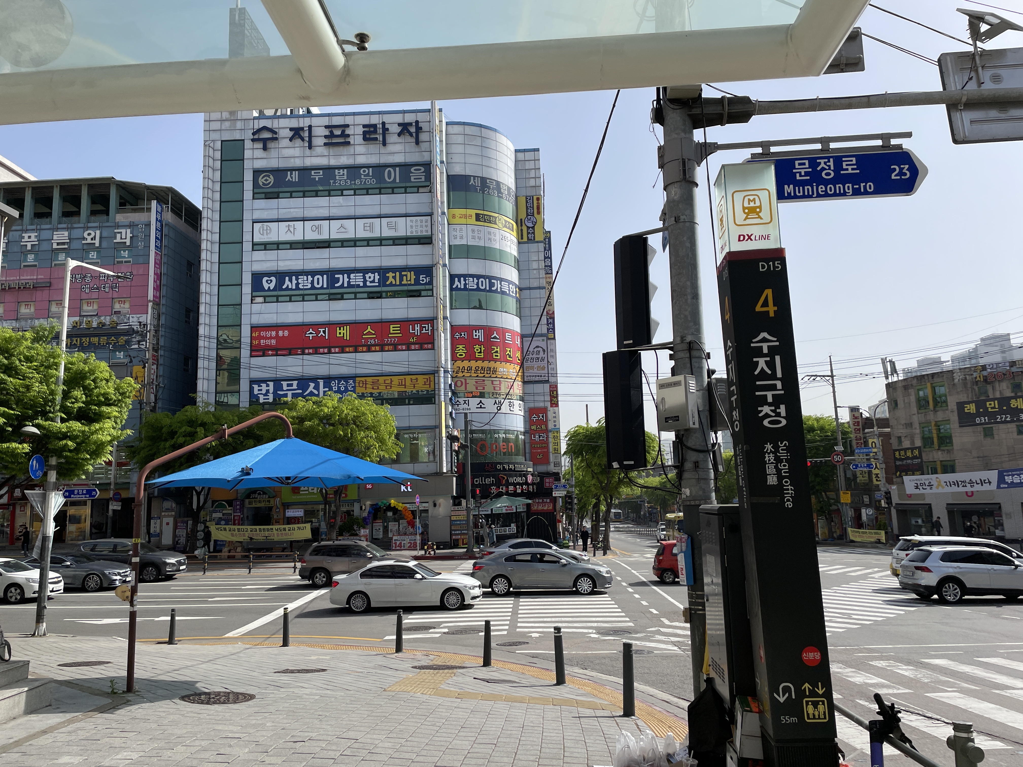 ●수지구청역 신호4번 출구로 나와서 사진 앞에 보이는 신호등을 건너갑니다.