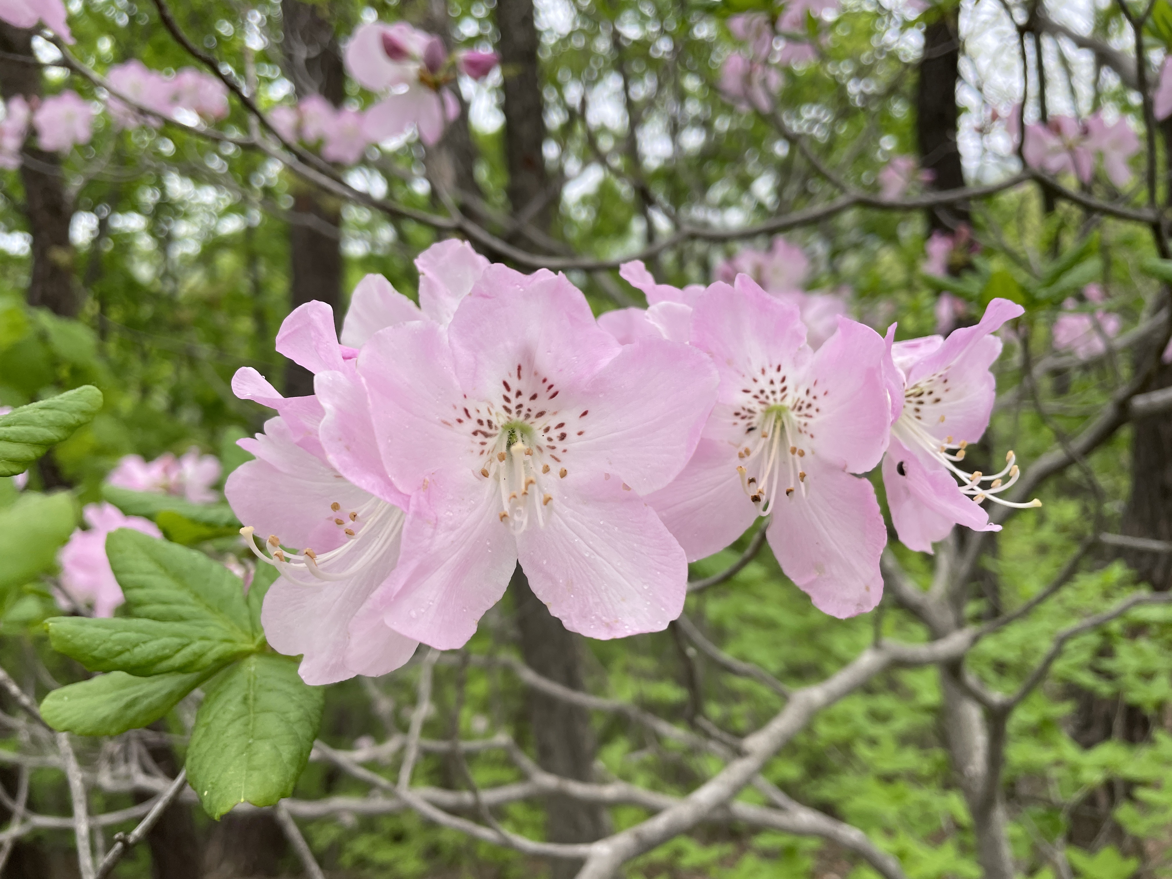 숲길 양쪽에 철쭉꽃이 초록에 분홍빛 치마저고리를