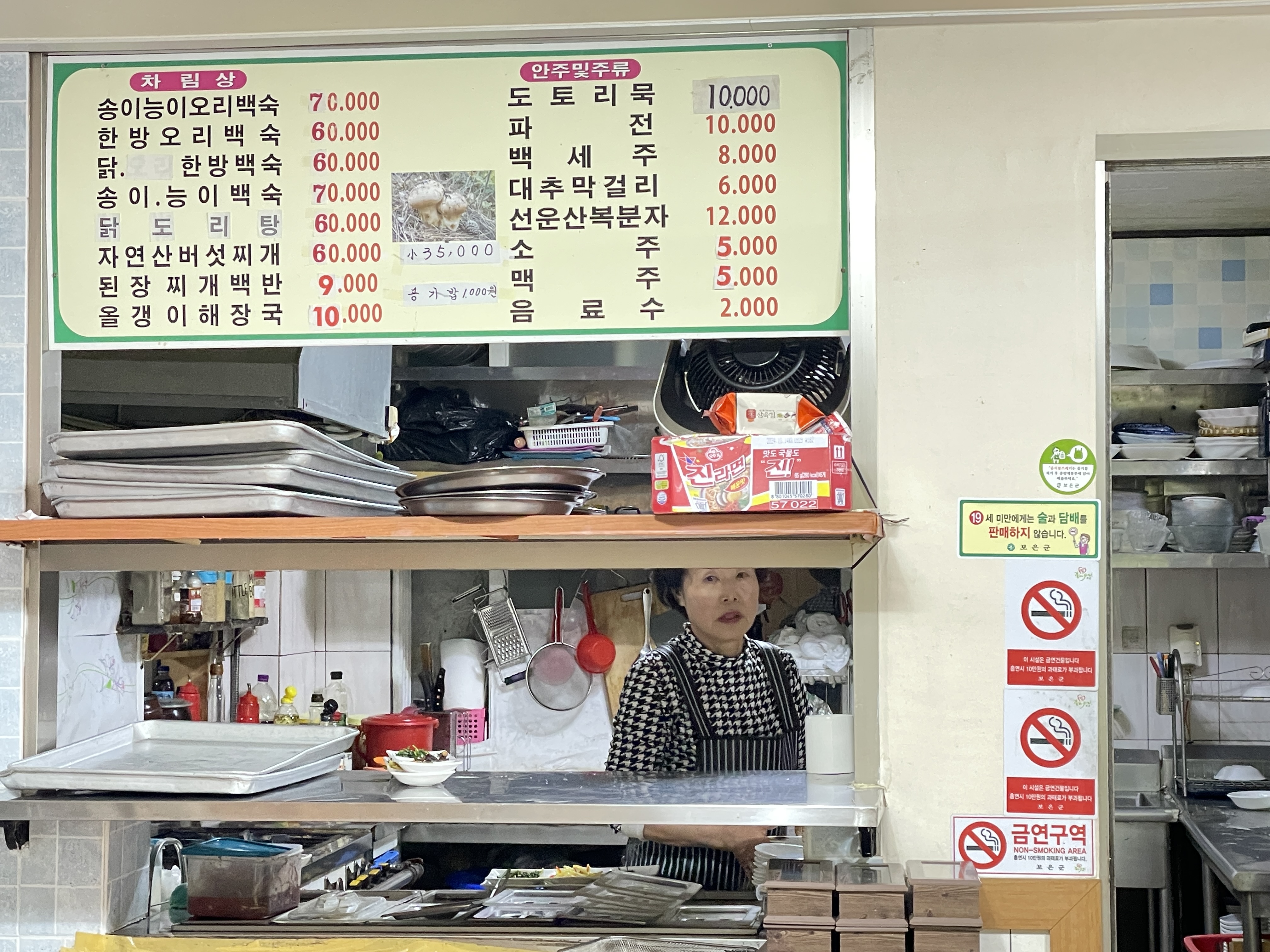 송이능이 오리백숙 70,000원 한방오리백숙 60,000원 닭 한방백숙 60,000, 다양한 메뉴가 있는데요. 저희는 자연산버섯찌개 10개를 예약하고 산행이 끝난 시각에 가서 먹게 되었습니다.