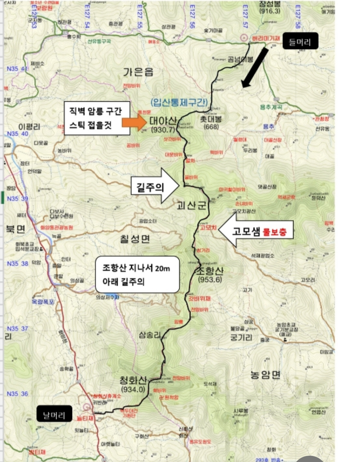 버리미기재~곰너이봉~대야산~고모치(물보충) ~조항산~ 청화산~늘재