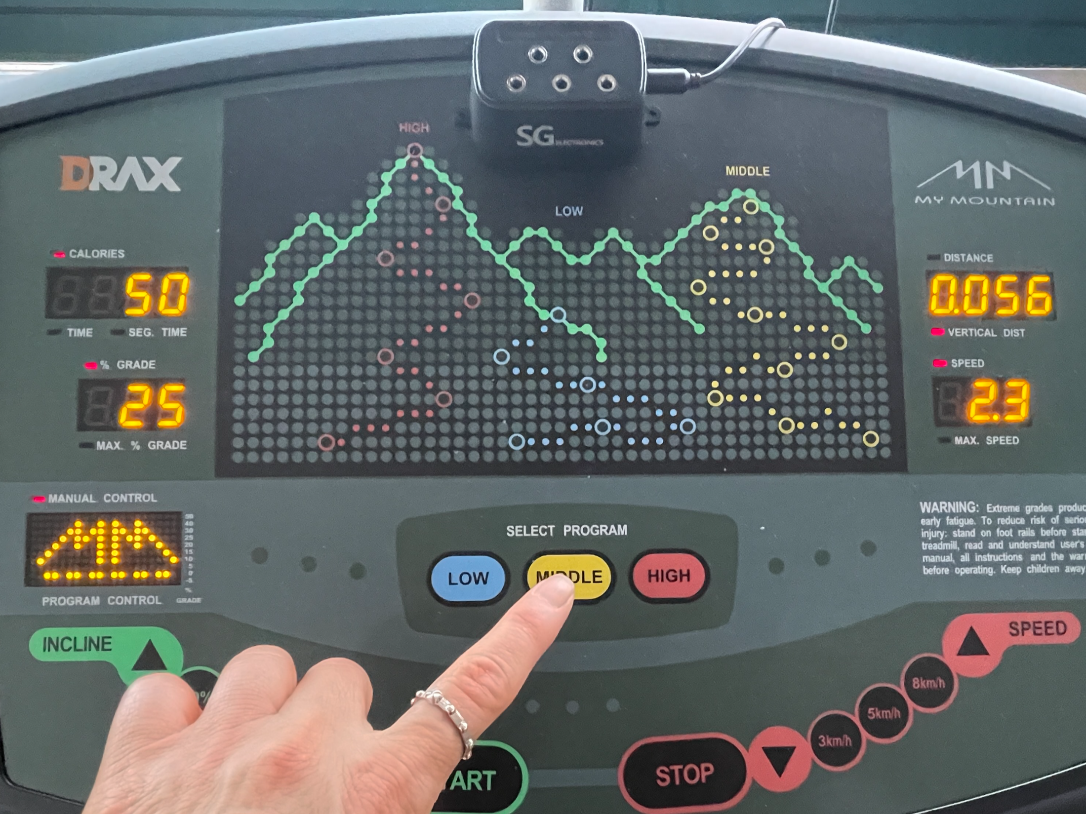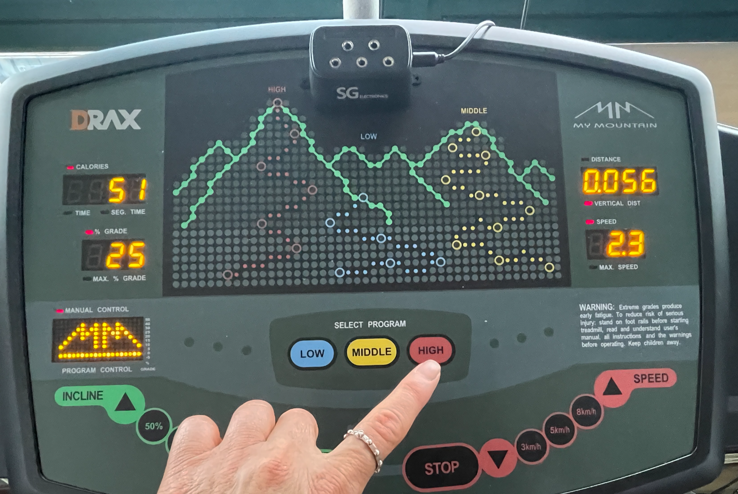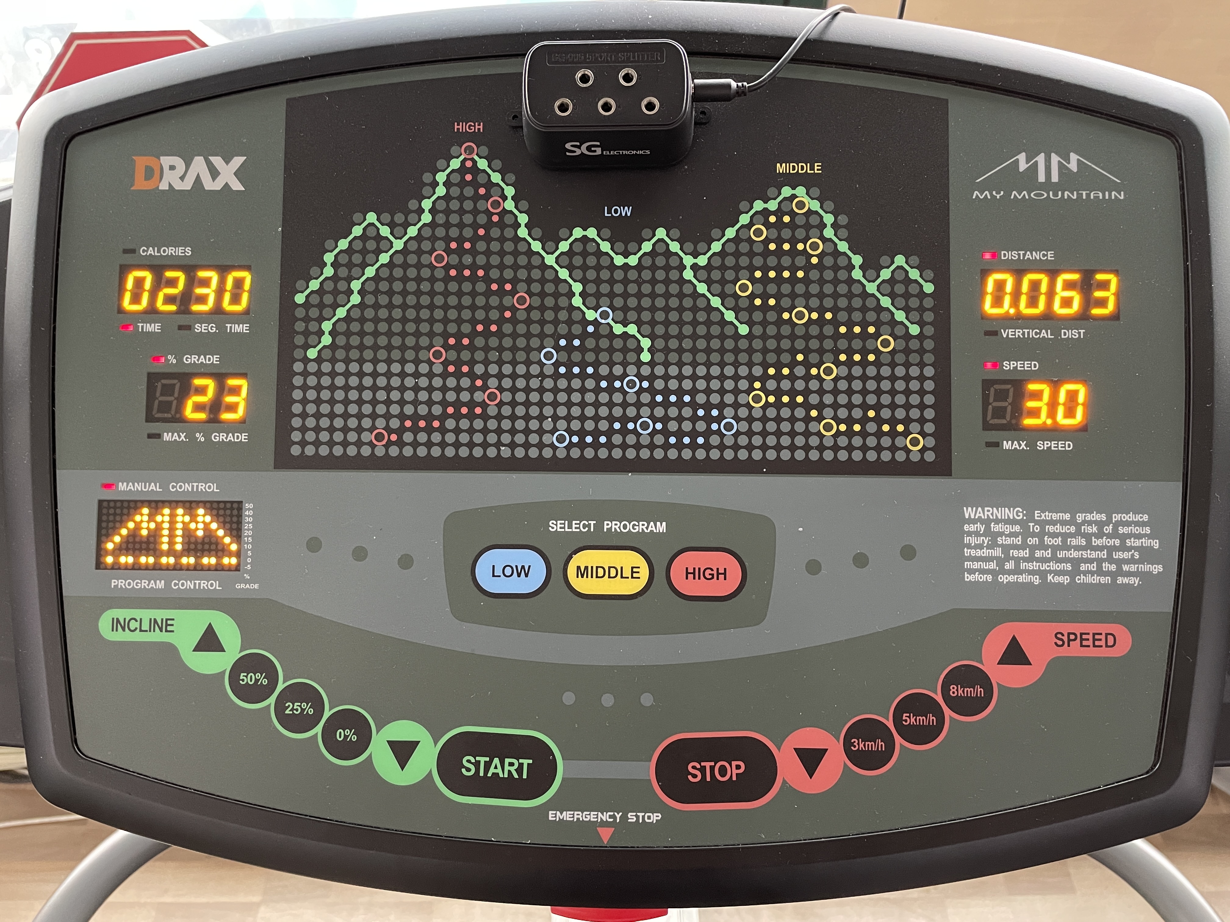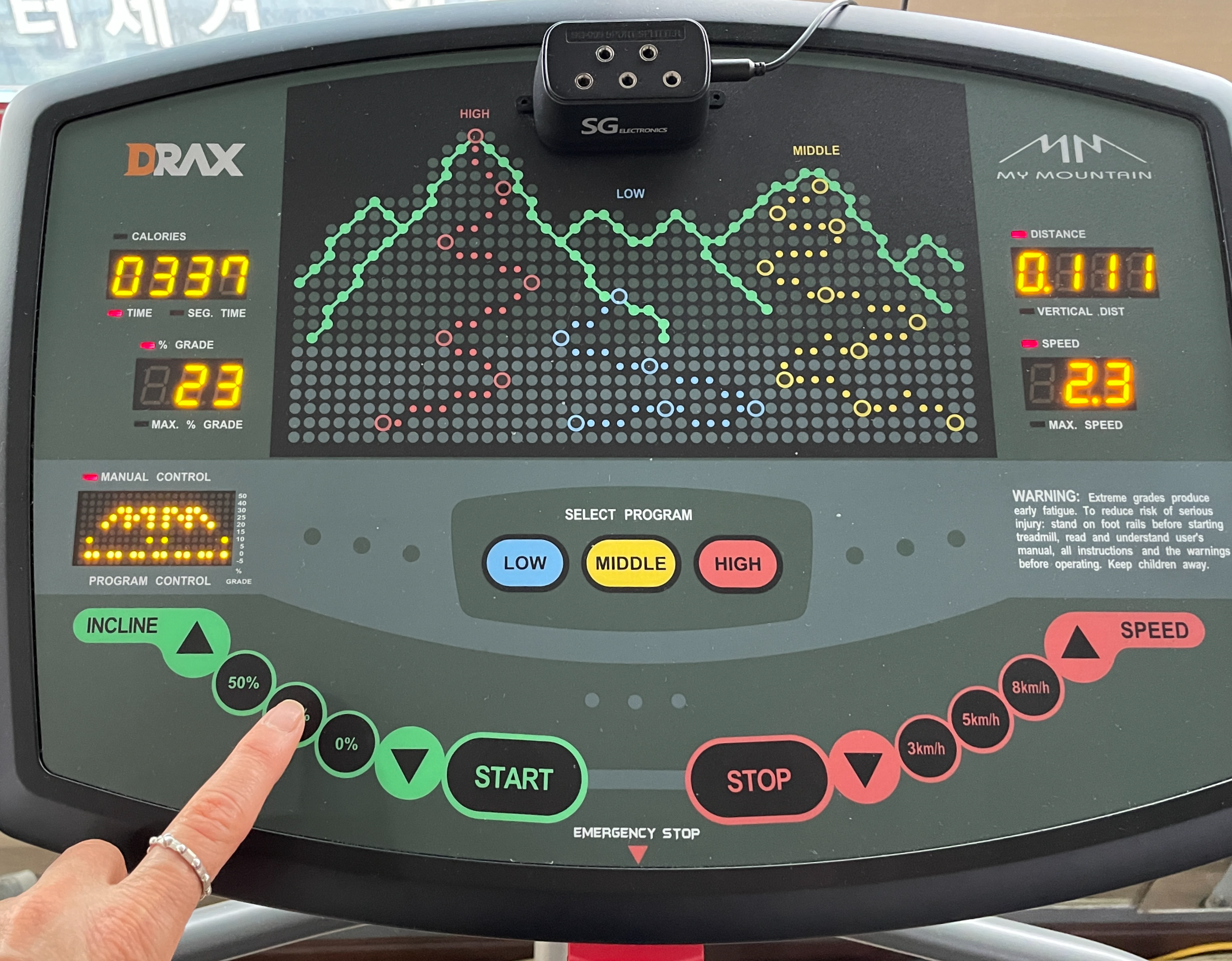 좌측(INCLINE ▲ 50% 25% 0% ▼ START)에서 50% 25% 0% 를 선택해서 눌렀을 경우 바닥의 경사도의 높낮이가 결정됩니다.