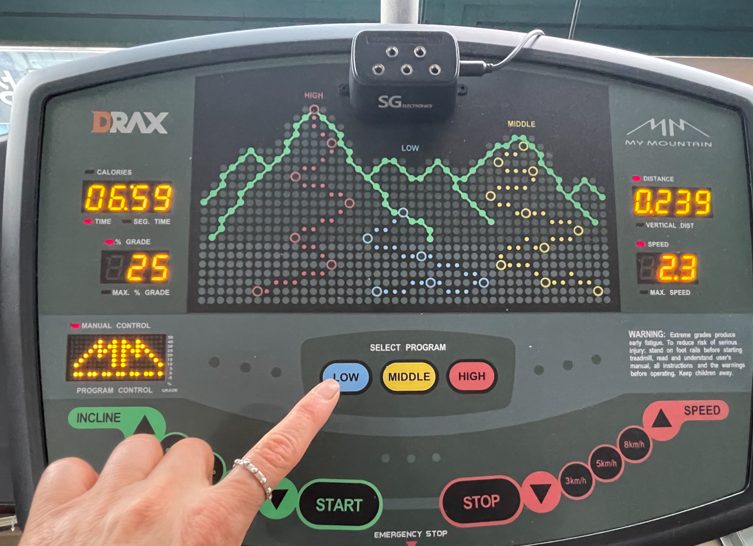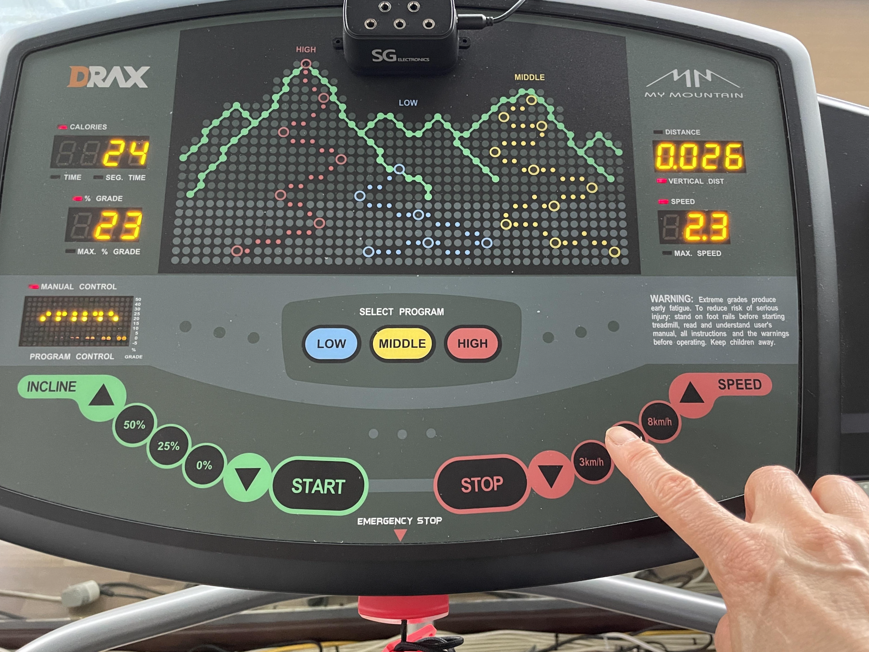 우측 ( STOP ▼3km / 5km / 8km▲SPEED) 에서 3km/ 5km/8km를 선택해서 눌렀을 경우 km 수만큼의 속도로 걷거나 뛰면 되고
