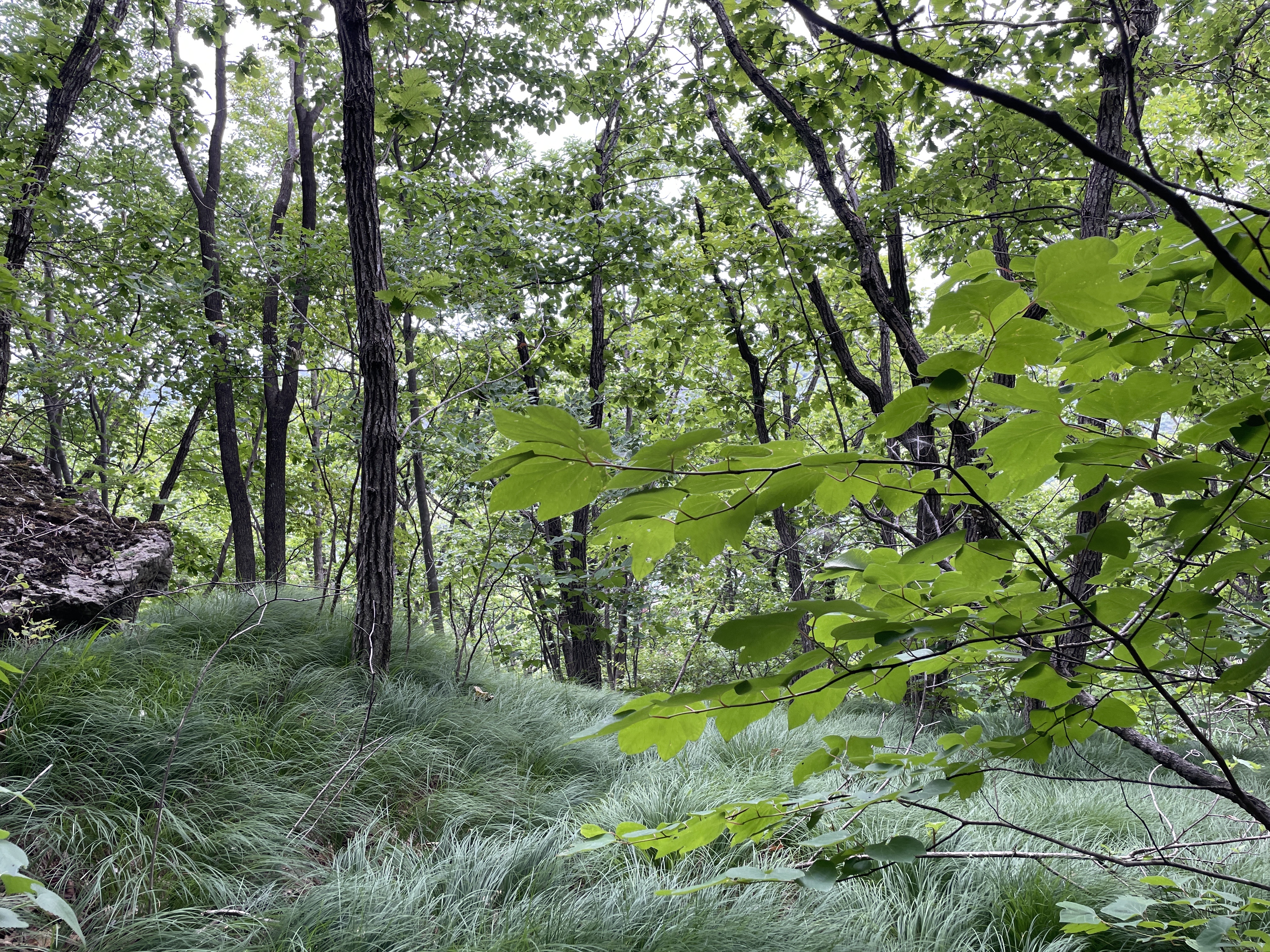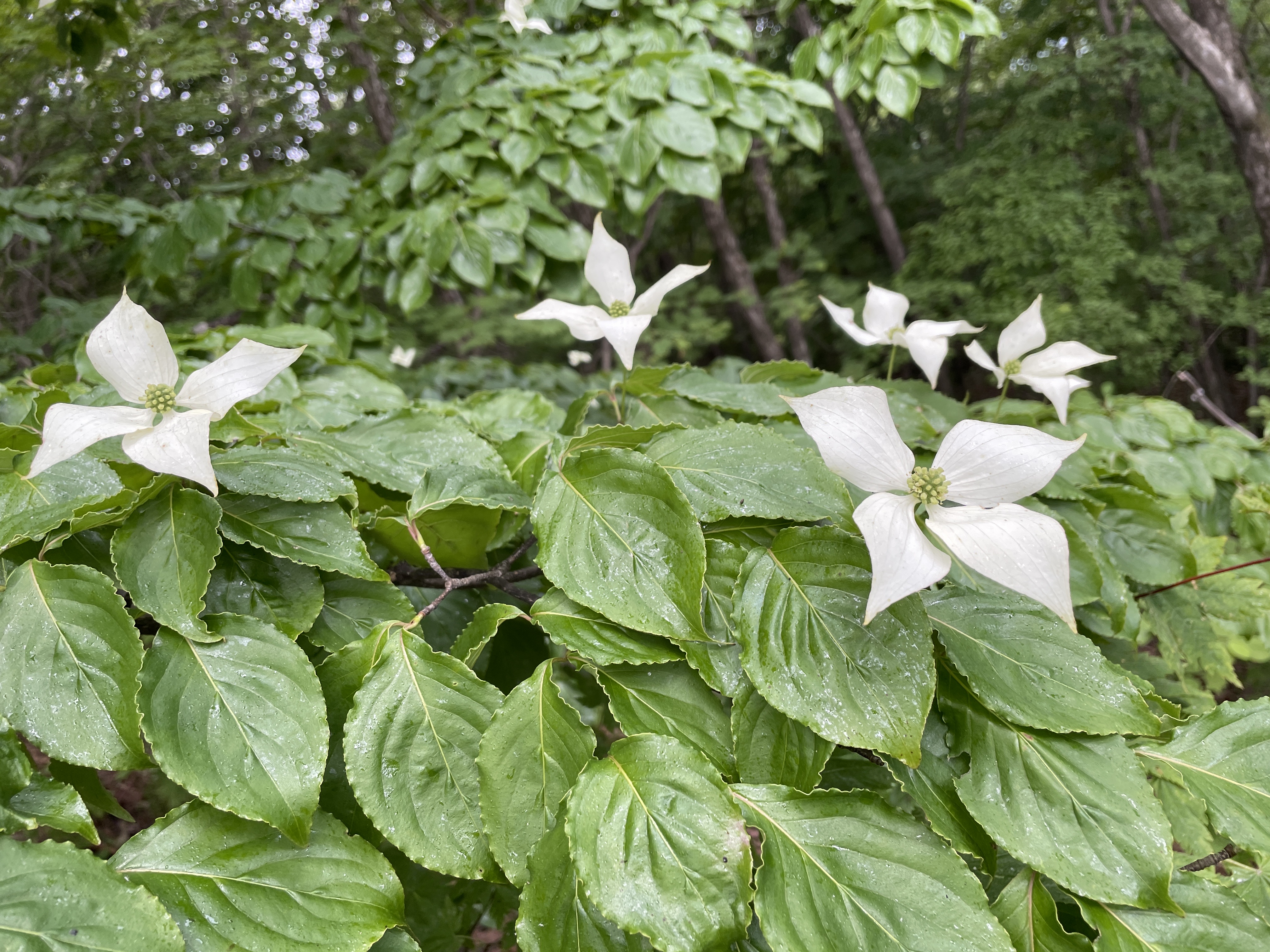 암벽구간을 지나가고 나면 산딸나무꽃이 초록잎 위에 흰색이 예쁘게 피어있어요.