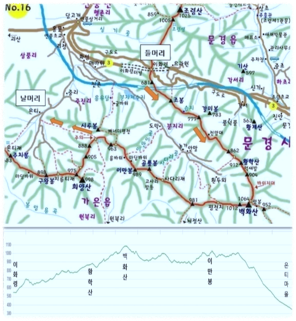 종주코스: 이화령~ 조봉~ 황학산~백화산~평전치~사다리재~이만봉~배너미평전~은티재마을