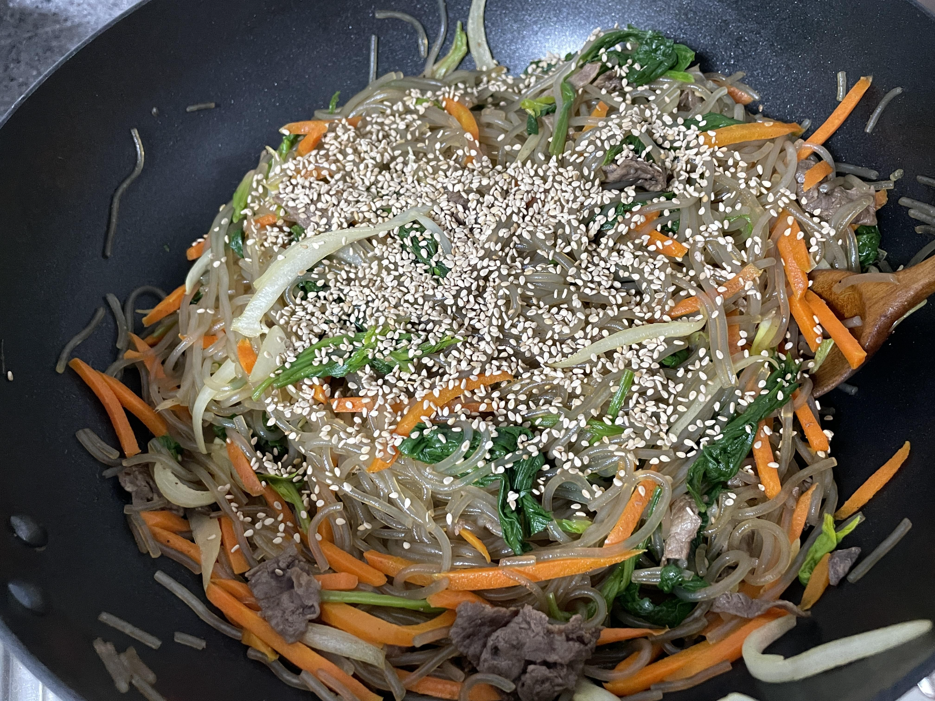 6. 잡채를 먹기 좋은 크기로 잘라준다음 볶아놓은 재료를 넣고 살살 버무리고 통깨를 뿌려 줍니다.