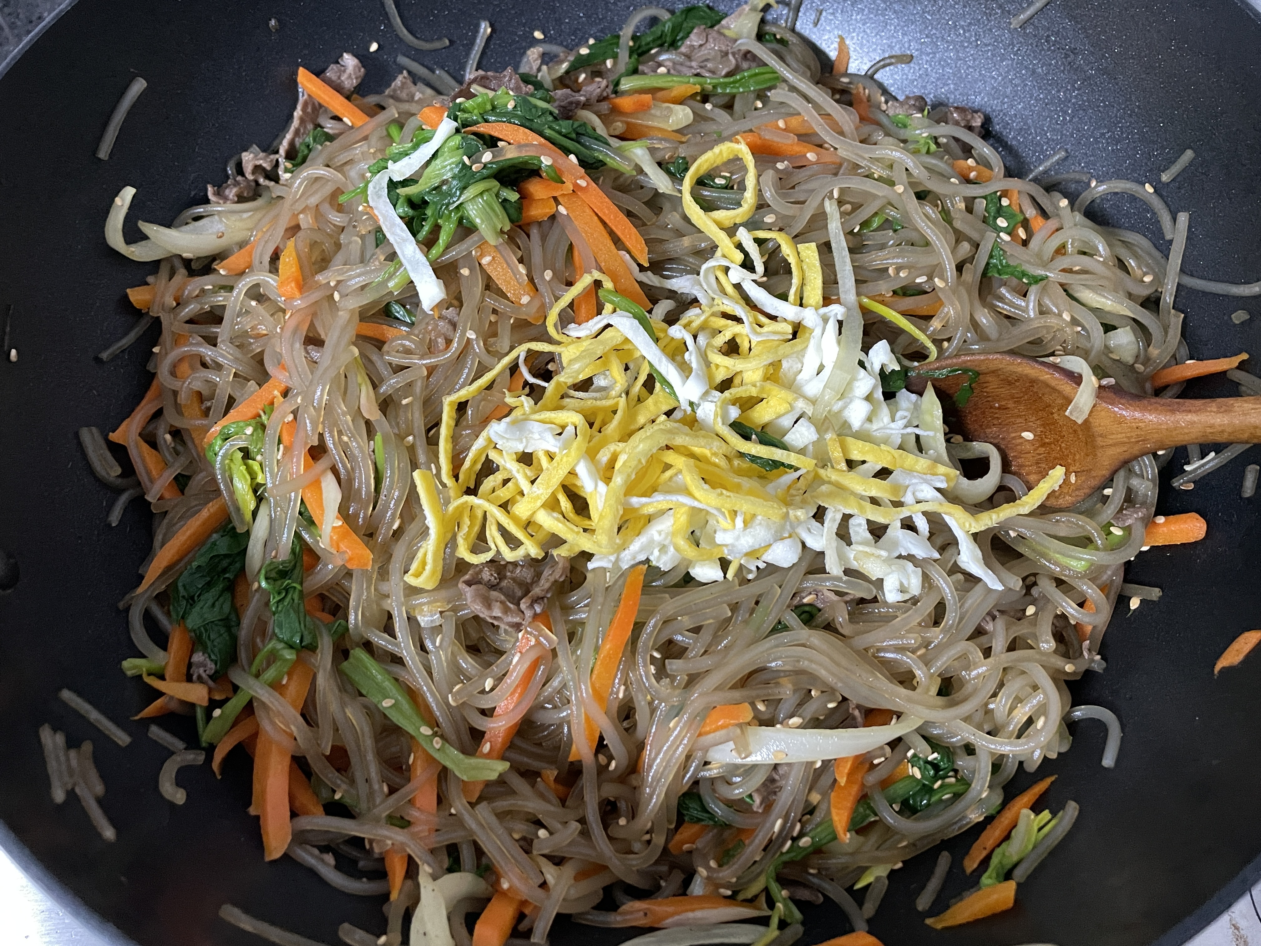 7. 양념과 잘 버무려진 잡채에 지단을 넣고 살살 버무려주면 잡채 만들기 완성입니다.