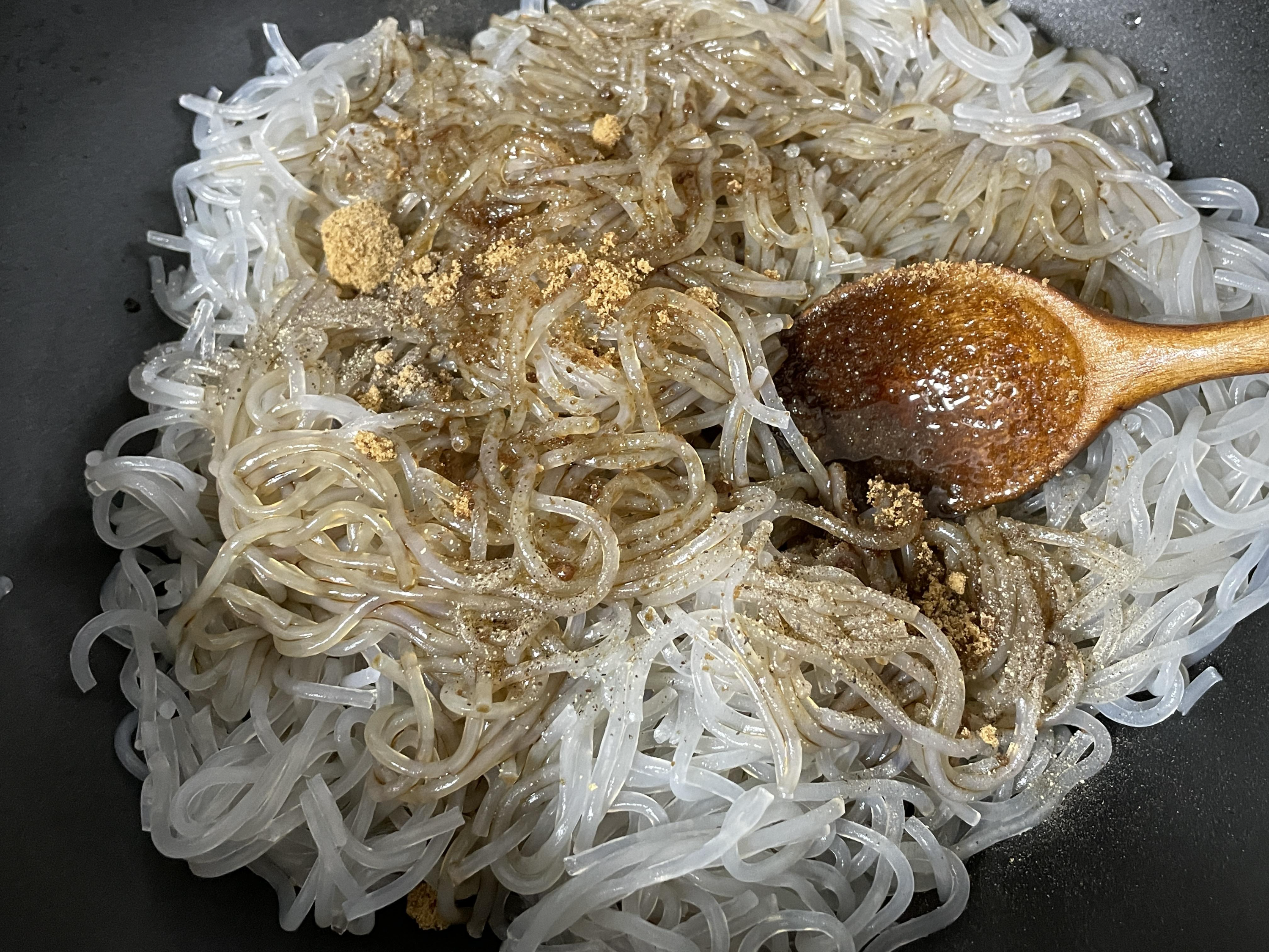 5. 잡채를 삶아서 물기를 뺀 다음 달궈진 프라이팬에서 참기름과 진간장 설탕을 넣고 잡채를 먼저 간이 배게 살짝 볶아주면 잡채가 오래가도 붙지않고 불지도 않아서 좋아요.