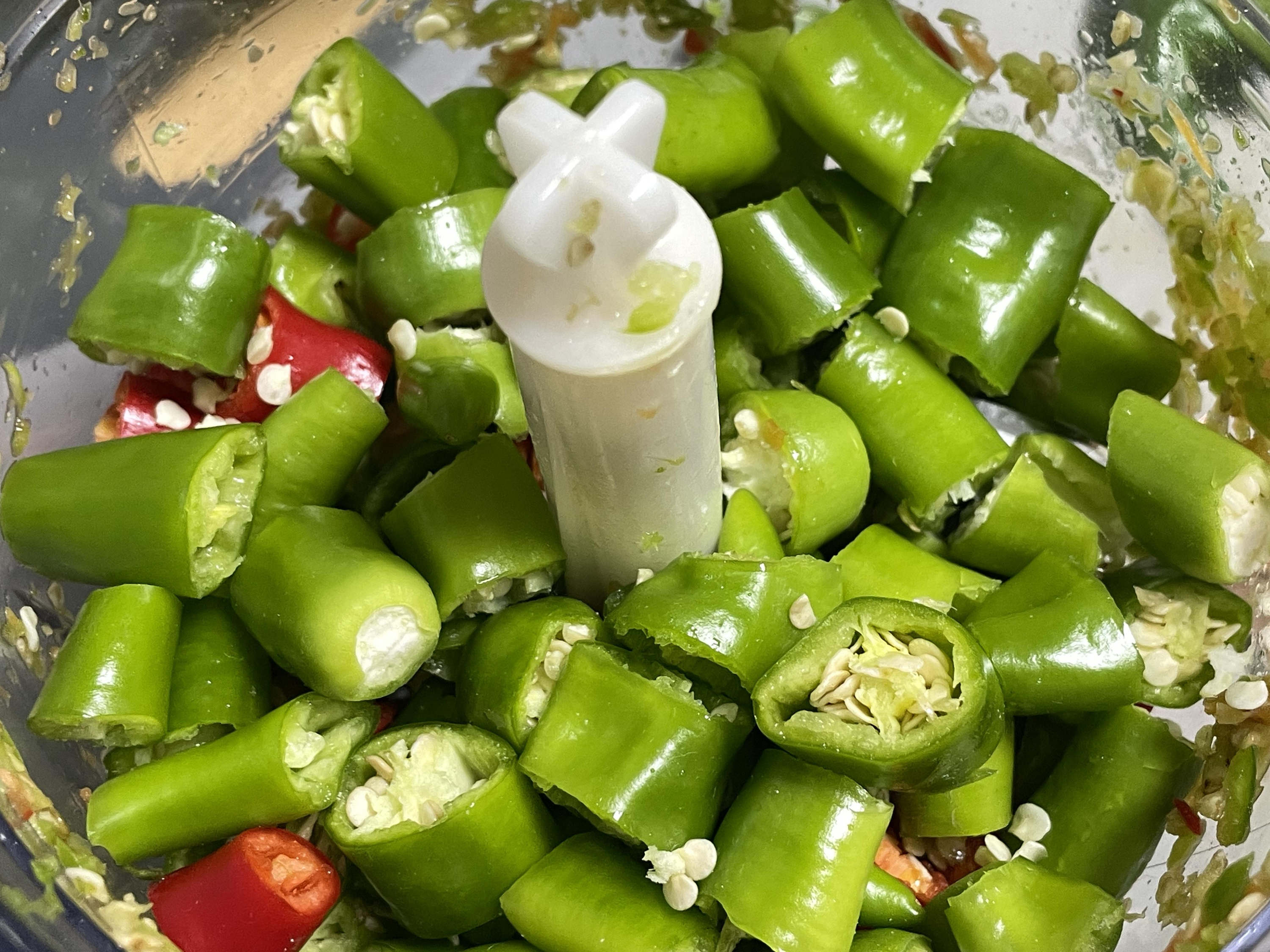 2. 고추를 적당한 크기 1~1.5cm으로 잘라서 다지기에 넣고 다져줍니다. 칼로 썰경우에는 장갑을 착용하고 하세요.