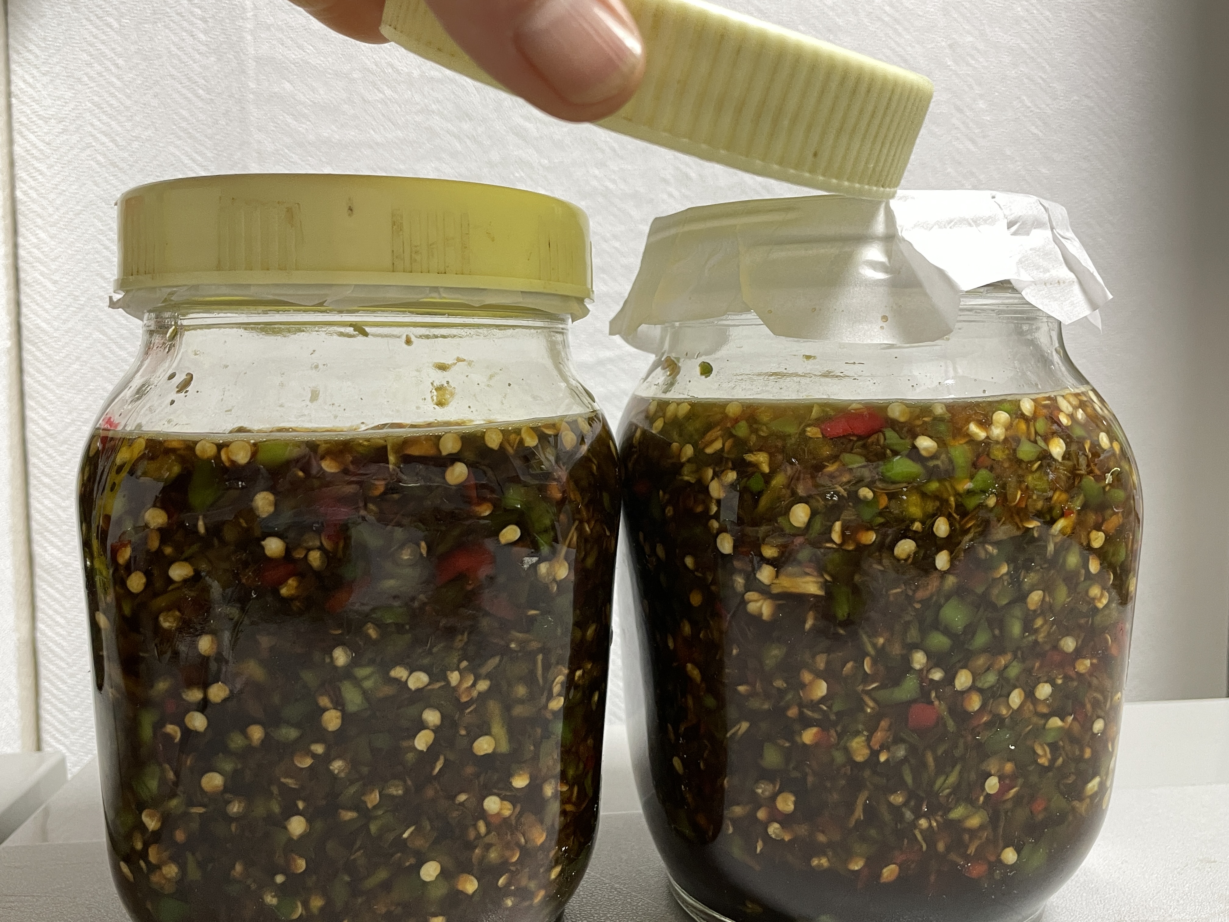 4. 만들어진 짜박이는 열탕에 소독한 병에 넣고 뚜껑은 열탕소독이 안 되므로 종이포일을 먼저 덮고 뚜껑을 닫아 줍니다.