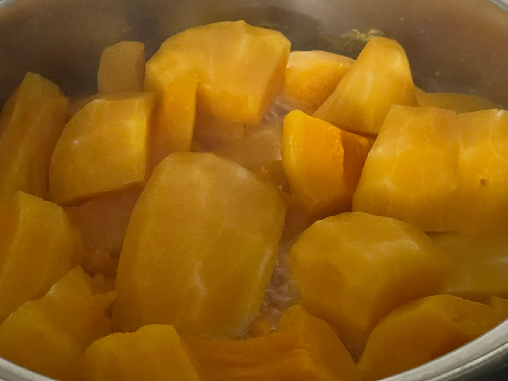 2. 늙은 호박은 껍질을 벗기고 씨앗과 태자를 숟가락으로 긁어낸 후 사방 5cm 정도의 크기로 잘라 줍니다. 냄비에 늙은 호박과 태자삶은 물을 넣고 중불에서 팔팔 끓으면 불을 약불로 줄이고 호박이 푹 익을 때까지 끓입니다.