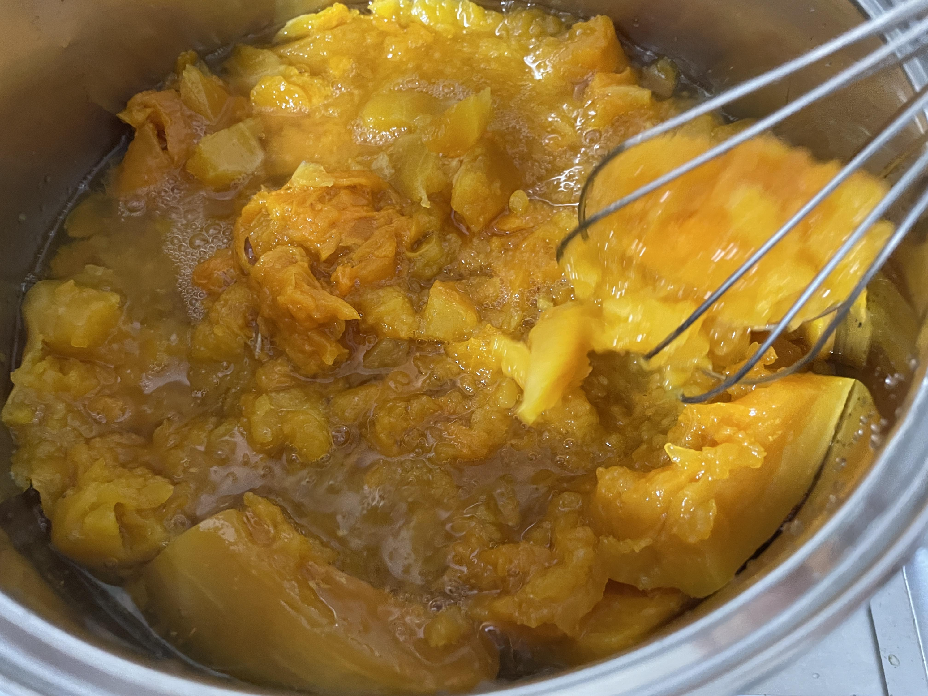 4. 푹익은 늙은 호박은 거품기로 곱게 저어줍니다.