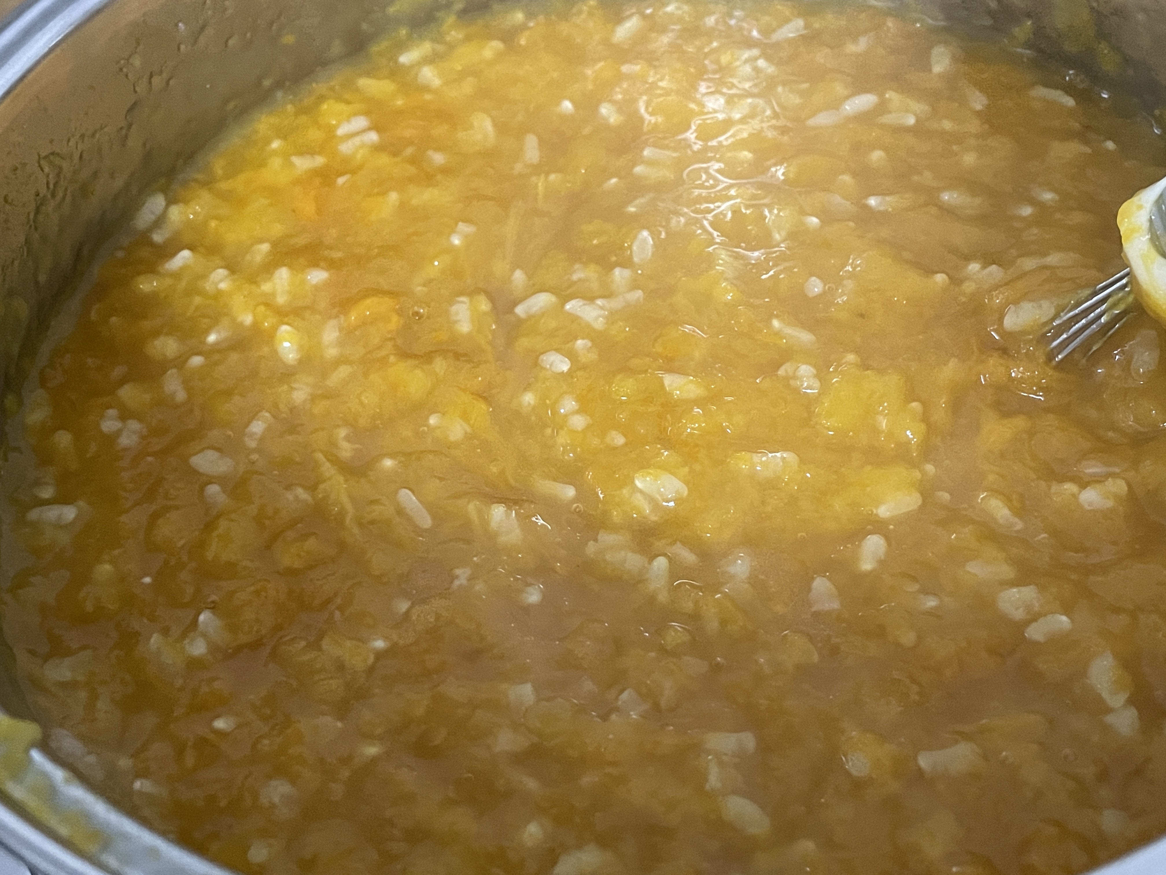 5. 냄비에 늙은 호박 삶아 거품기로 곱게 저어놓은 것에 찹쌀밥을 넣고 중불에서 저어가며 끓이다 약불로 줄이고 뚜껑을 덮고 끓여 찹쌀밥이 잘 퍼지면 소금으로 간을 합니다.