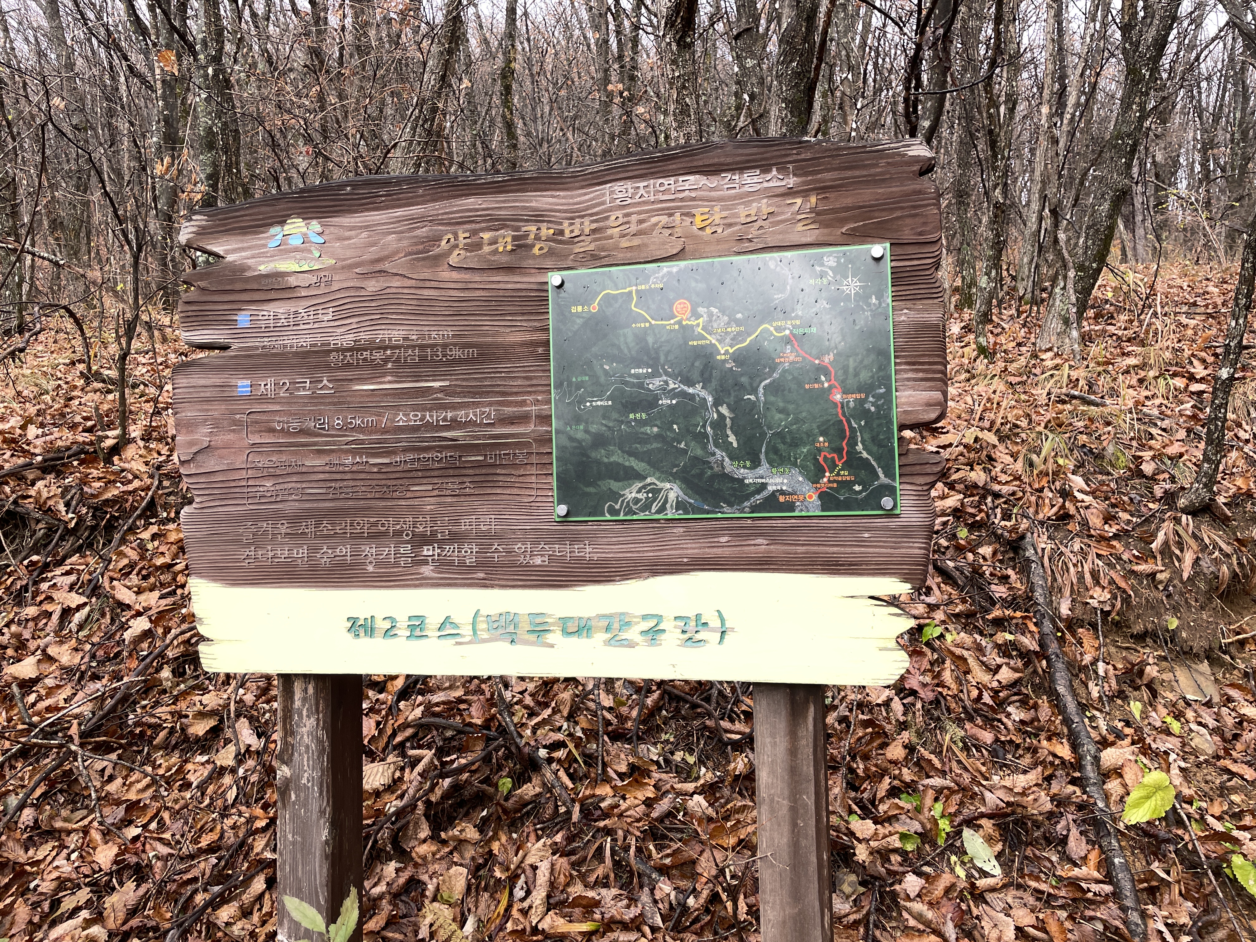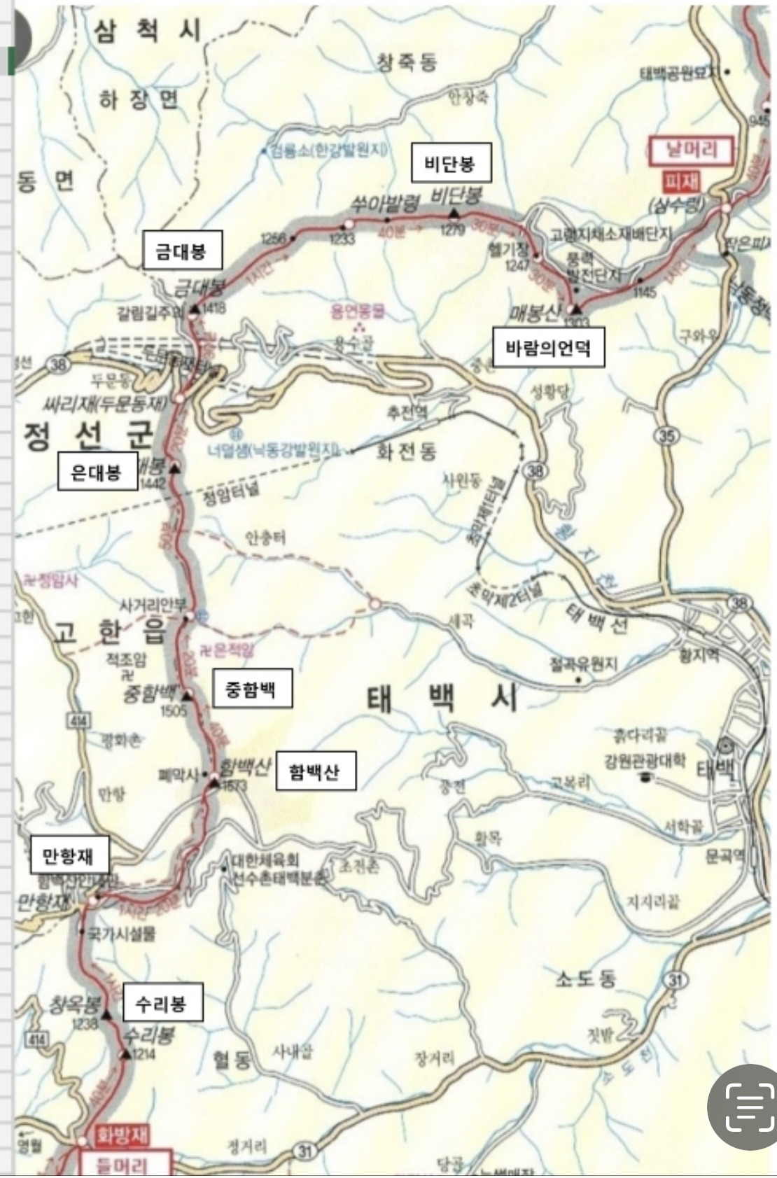 산행코스:화방제(3.5km) - 만향재(2.9km)- 함백산(1.1km) -중함백 산 (3.1km)- 은대봉(1.2km)-싸리재(두문동재)(1.2km)- 금대봉-(6.0km) 매봉산-(2.6km) -삼수령
