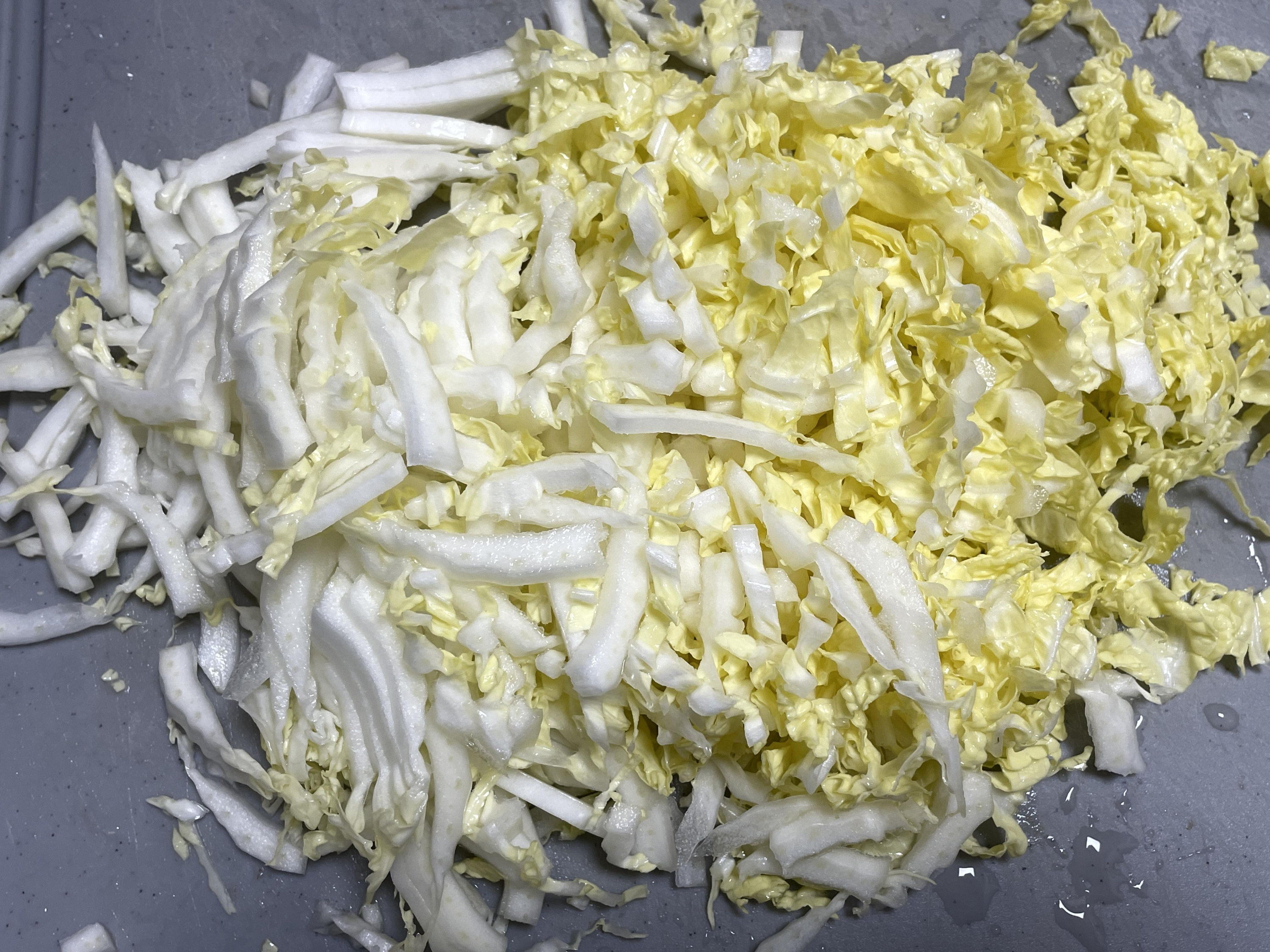 2. 배추를 길게 2등분 한 후 0.5mm 두께로 썰어줍니다.