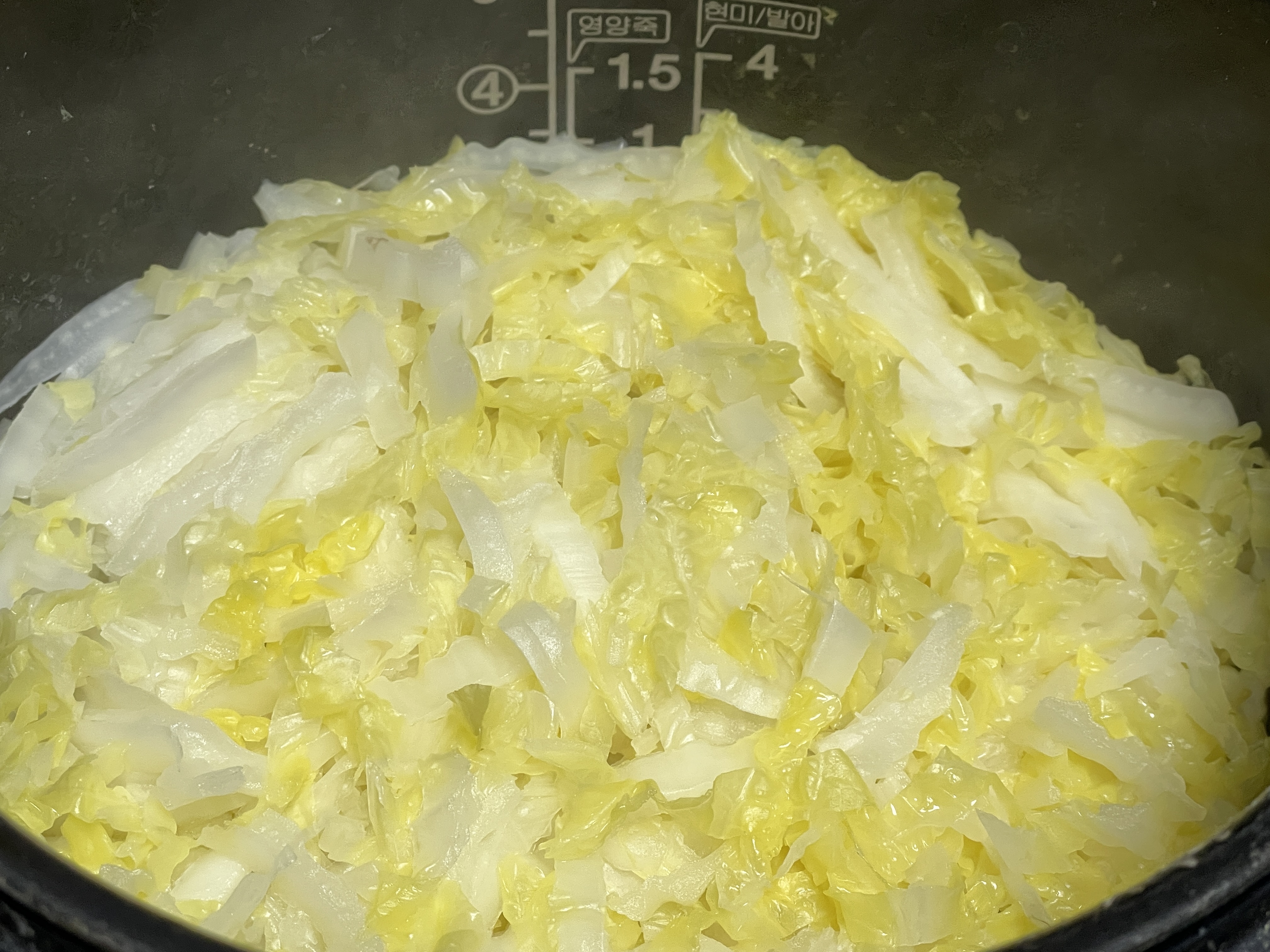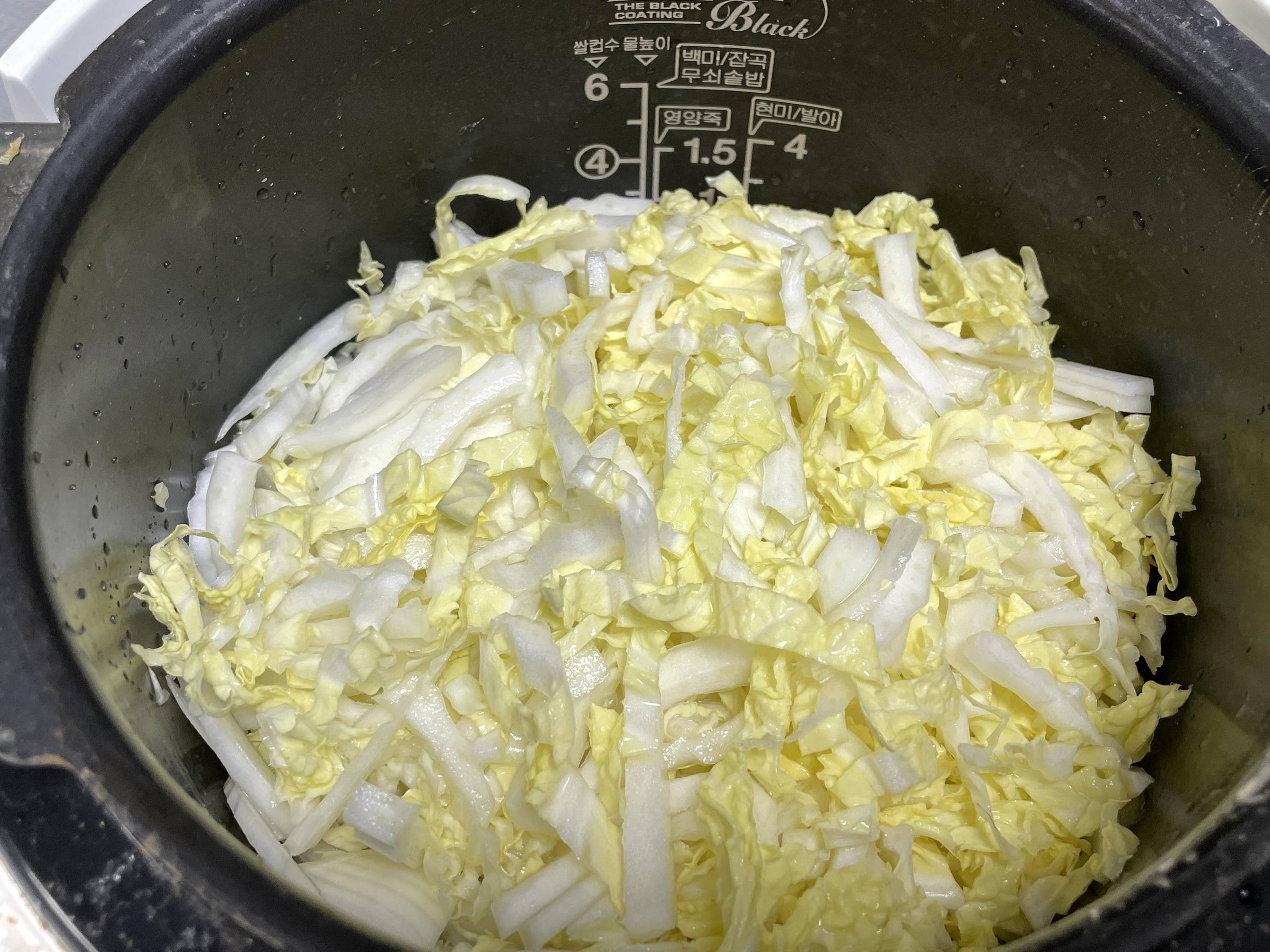 3. 씻은 쌀을 넣고 그 위에 배추썰은 것을 얹어 줍니다.