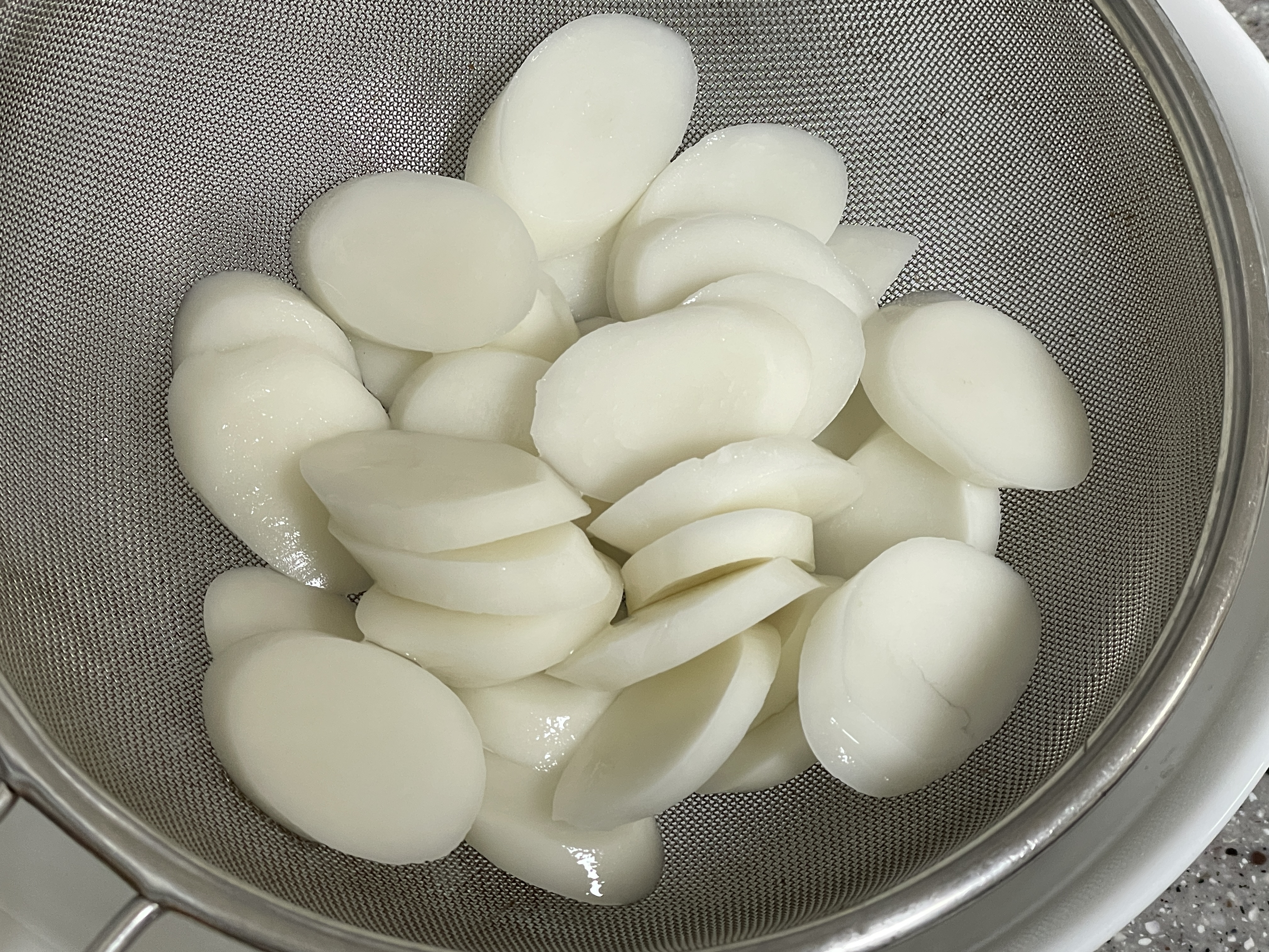 3. 해동된 떡국떡은 거름망에 받쳐 물기를 뺀 후 떡국을 끓입니다.